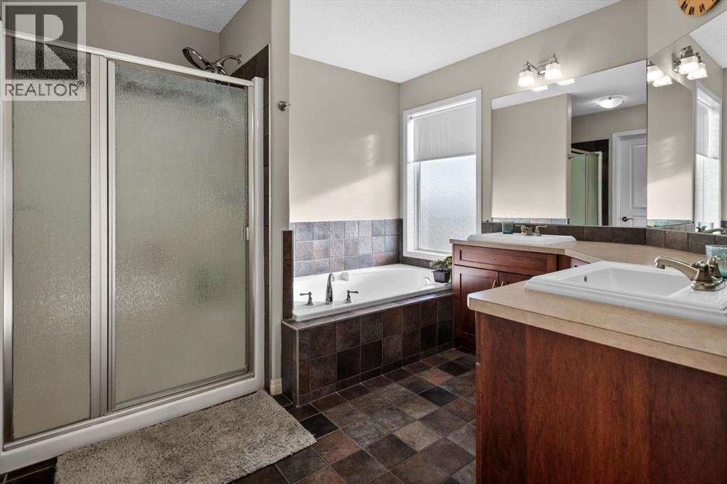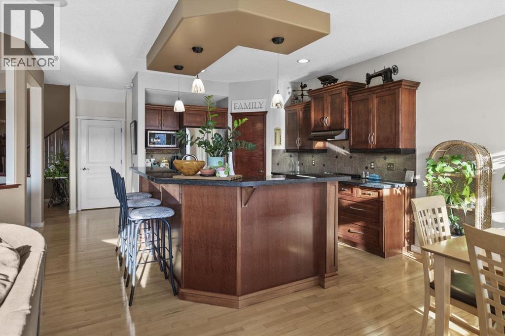 Tucked along one of Tuscany's most coveted ridge-lines, this home rewards you with something few homes can offer - unobstructed, sweeping views stretching from the city skyline to Canada Olympic Park and onward to the Rocky Mountains. By day, the panorama shifts with the light; by evening, the lights from the city and COP glimmer in a display that never grows old. Homes along this ridge rarely come to market, and it's easy to understand why. A vaulted foyer sets a gracious first impression, with extensive hardwood flooring flowing through the main level. A versatile flex room near the entry invites use as a den or intimate formal dining space. As you move toward the rear of the home, the floor plan opens up and that remarkable view commands your attention through expansive rear windows. The family room, warmed by a fireplace, frames the vista beautifully, while the kitchen stands ready for both everyday life and entertaining - rich maple cabinetry with under-cabinet lighting, granite countertops, a tiered island, and stainless steel appliances. A well-appointed main-floor mudroom keeps the household running smoothly with laundry facilities, built-in cabinetry, a folding counter, and laundry sink. Upstairs, a small loft overlooks the entry below - an ideal spot for a reading nook, homework station, or quiet workspace. The staircase splits to reveal thoughtfully separated sleeping quarters: a spacious secondary bedroom to one side, and on the other, a second secondary bedroom, full family bathroom, and the primary suite. Waking up to those mountain and city views from the primary bedroom is something truly special. The ensuite features dual sinks, a soaker tub, and separate shower, complemented by a walk-in closet. The walkout basement extends the living space with a large recreation room anchored by a gas wood stove, plus a bathroom featuring an oversized shower - perfectly suited for guests or post-hot tub evenings. Step outside and the backyard becomes your retreat: a hot tub with convenient hot water tap, patio, perennial gardens, an irrigation system, and storage shed. A gate opens directly onto the pathway system winding throughout Tuscany, inviting you to explore the coulee at your doorstep. Central air conditioning ensures comfort through summer, and a newer roof provides peace of mind. With a park and playground just steps away, this ridge-backing home on a quiet street delivers a lifestyle that families dream about - where stunning views, thoughtful design, and neighbourhood connectivity come together in one exceptional Tuscany address. (31615320)