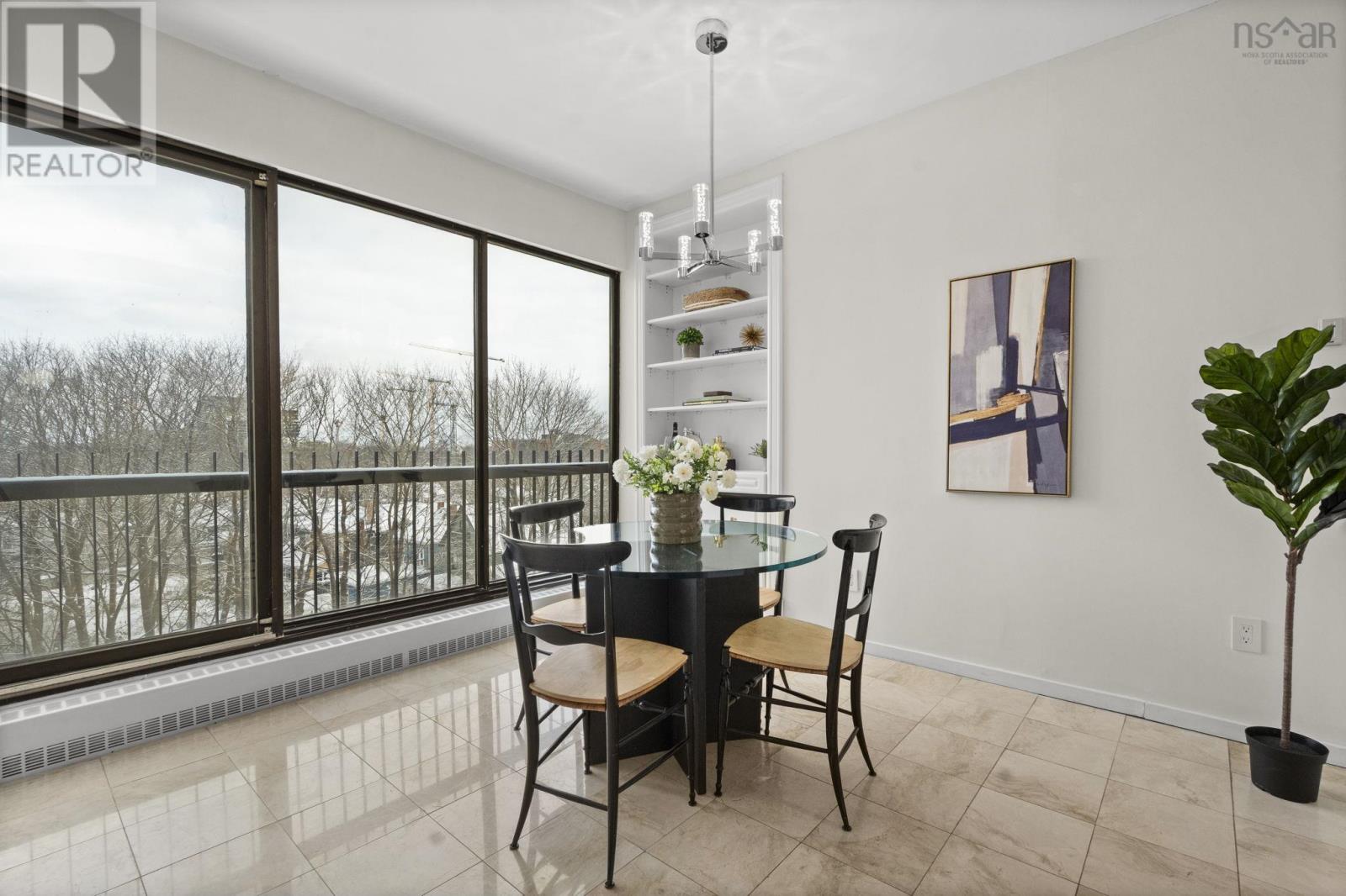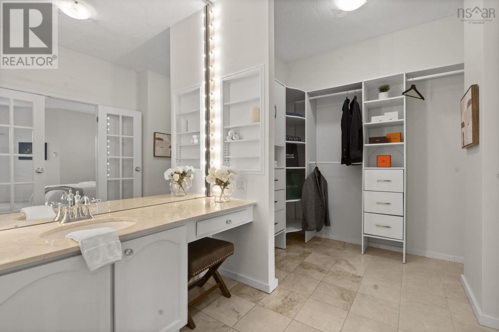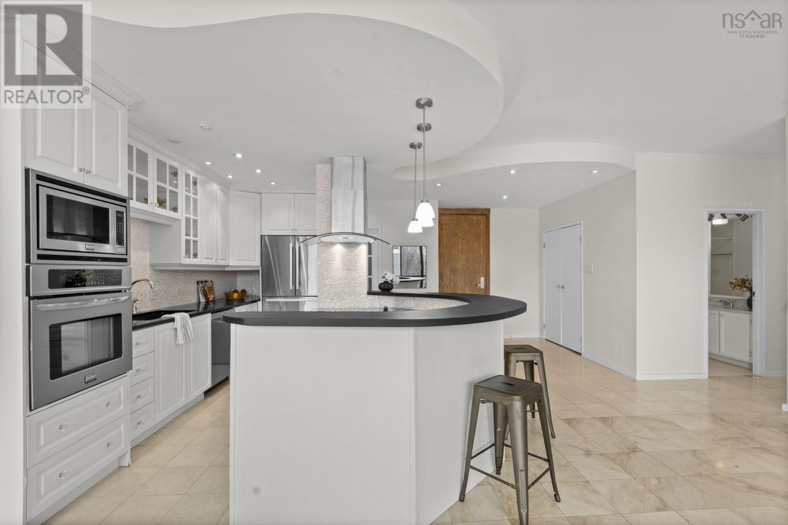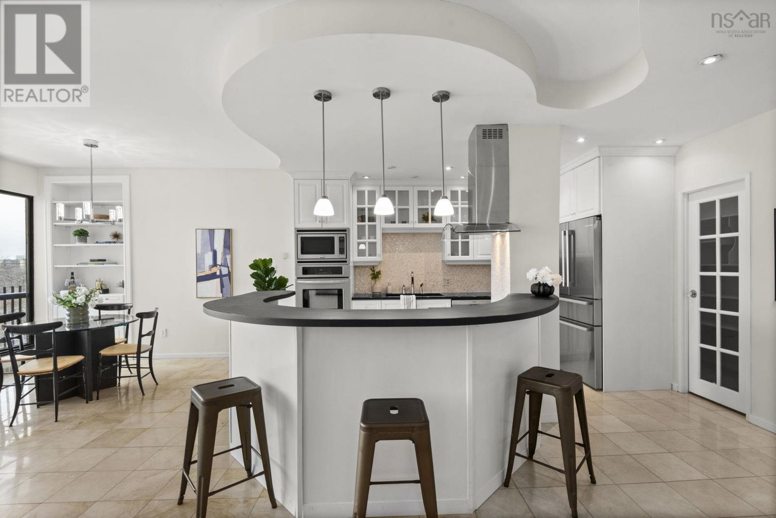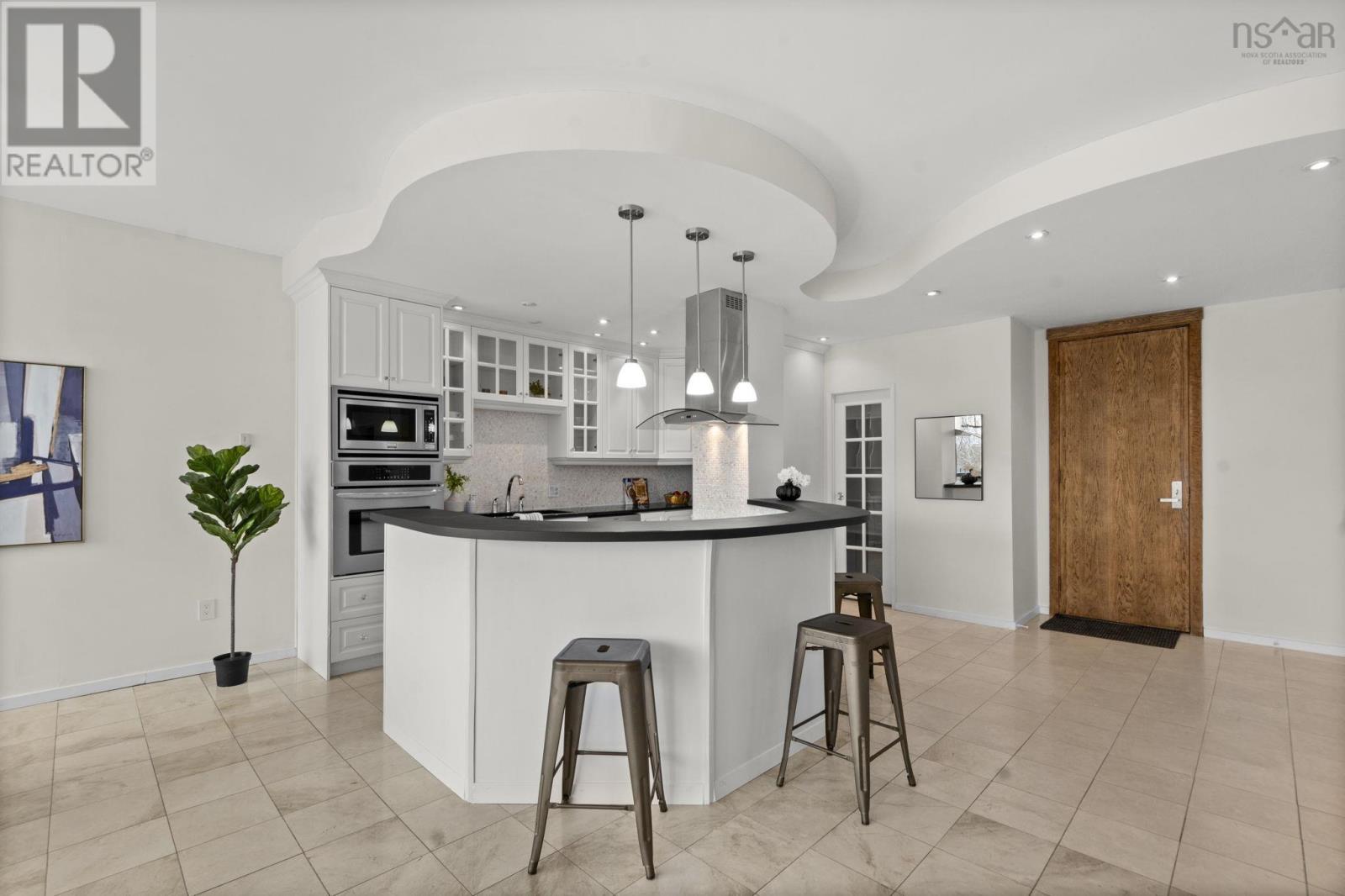 **Live Where Halifax Does Business The Carlyle** Step into the downtown lifestyle without sacrificing space, comfort, or character. This 2 Bedroom 2 Bath residence in **The Carlyle** offers something increasingly rare in Halifax: a spacious, elegantly designed condo tailored for professionals who want to live well, entertain often, and walk to work not squeeze into the micro-units dominating new construction condo market. From the moment you enter, the scale impresses. Nearly 9-foot ceilings and a oversized 8-foot entrance door set the tone, while a wall of expansive windows floods the open-concept living space with natural light. The redesigned floor plan flows effortlessly, built around a chef-inspired kitchen crafted for both cooking and entertaining. A semi-circular centre island anchors the space, complemented by wall-mounted oven and microwave, abundant cabinetry, generous seating, and a walk-in pantry. A dedicated dining area and spacious living room make hosting effortless. The primary suite is a retreat of its own oversized and refined, featuring double French doors leading to a Hollywood-style walk-in closet complete with seating area, illuminated mirrors, and boutique-style lighting, seamlessly connecting to a large private ensuite bath. A second bedroom and full bath offer flexibility for guests, home office, or both. Throughout the home, custom built-ins and elegant wall sconces add warmth and personality rarely found in newer builds. Every detail speaks to quality and timeless design. Ownership here also includes underground parking, storage locker, car wash bay, visitor parking, on-site superintendent, plus convenient access to the buildings gym and common lounge. This is downtown living for those who value space, character, and prestige a refined alternative to the compact condos now filling the skyline. Walk to work. Entertain with ease. Come home to class. Welcome to elevated living at The Carlyle. (231934808)