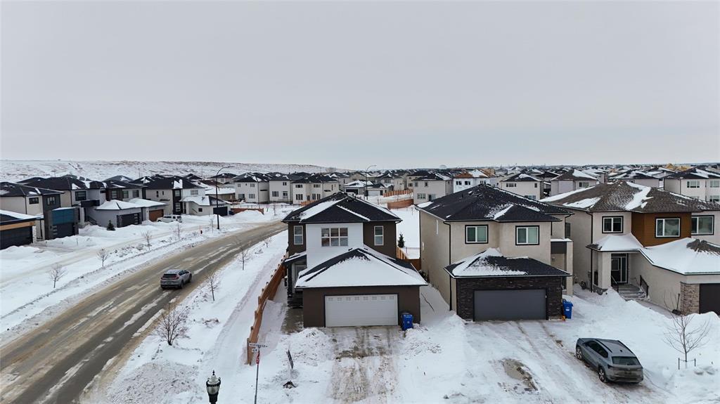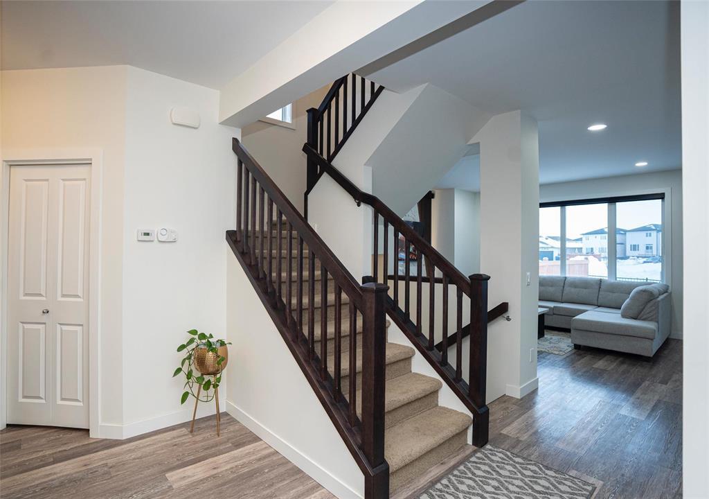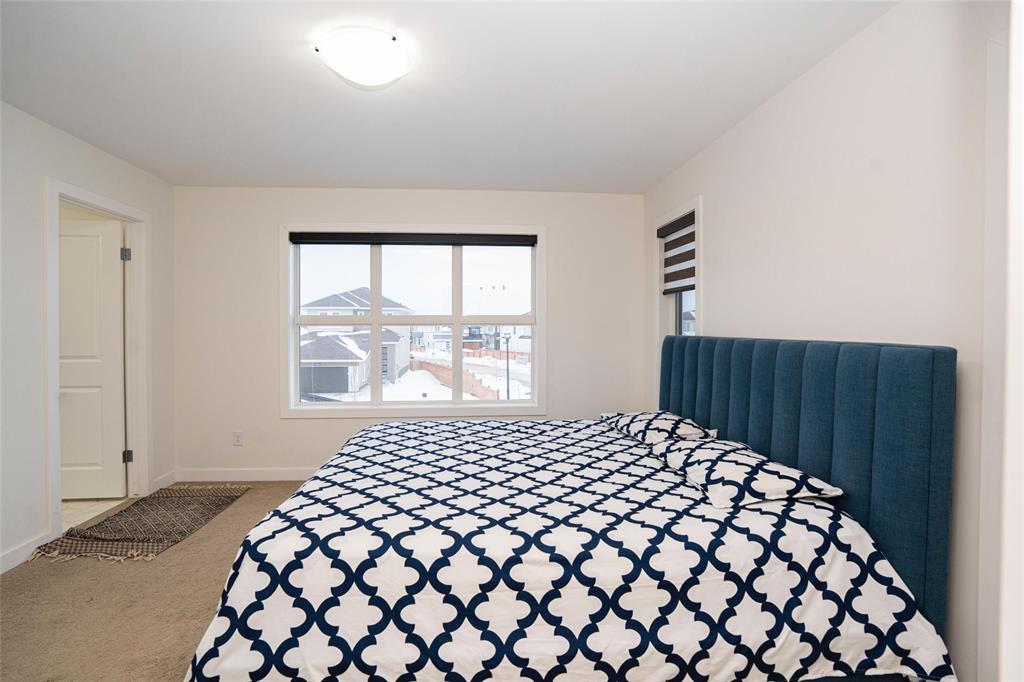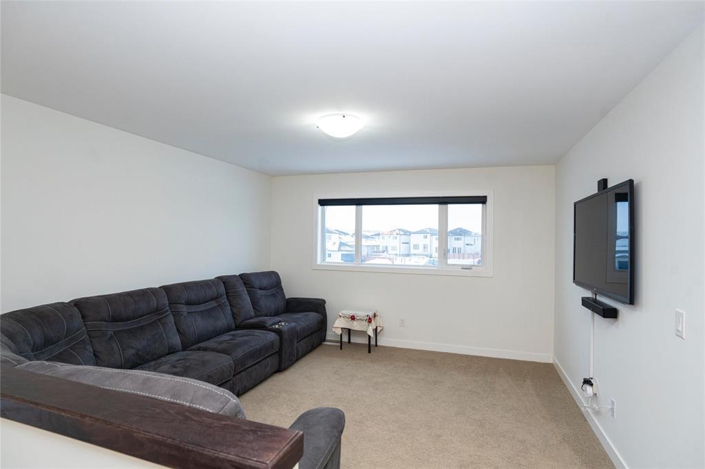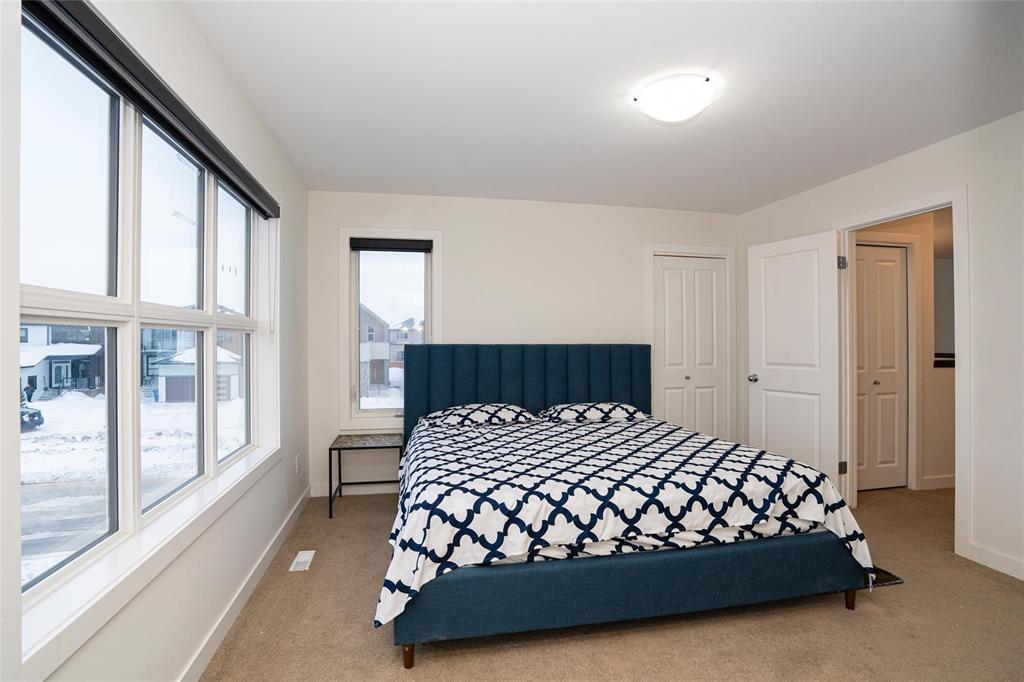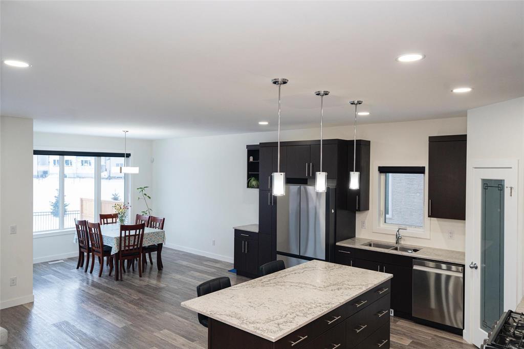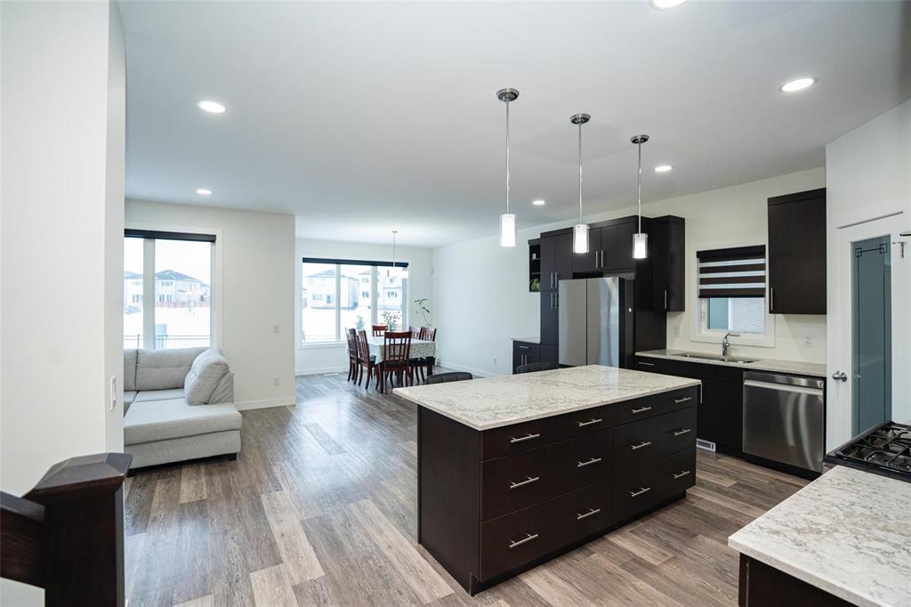 1R//Winnipeg/S/S Now. Offers presented as received. Welcome to this beautifully maintained, move-in-ready home in the most desirable Prairie Pointe community. This modern two-storey home offers 4 bedrooms, 3 full bathrooms, a full basement, and an oversized double attached garage (25.5 x 23 ), plus many quality upgrades.The main floor features 9-foot ceilings, vinyl plank flooring, tri-pane windows, abundant natural light, and an open-concept layout with a stylish cantilever design. The upgraded kitchen includes dark mocha soft-close cabinetry, 40 uppers, quartz countertops, large island with pendant lighting, pot lights, gas line for stove, and water line for fridge. A main-floor bedroom and full bath add flexibility.Upstairs offers three spacious bedrooms, including a primary suite with walk-in closet and deluxe ensuite, plus a full bath and a bright loft with oversized window ideal for office or play space.Additional highlights include upgraded vinyl in baths, cultured marble counters, upgraded front and garage doors, piano window, oversized patio door, added living space, and basement laundry with 20-amp outlet.This turn-key home has it all. Book your private showing today. (231934677)