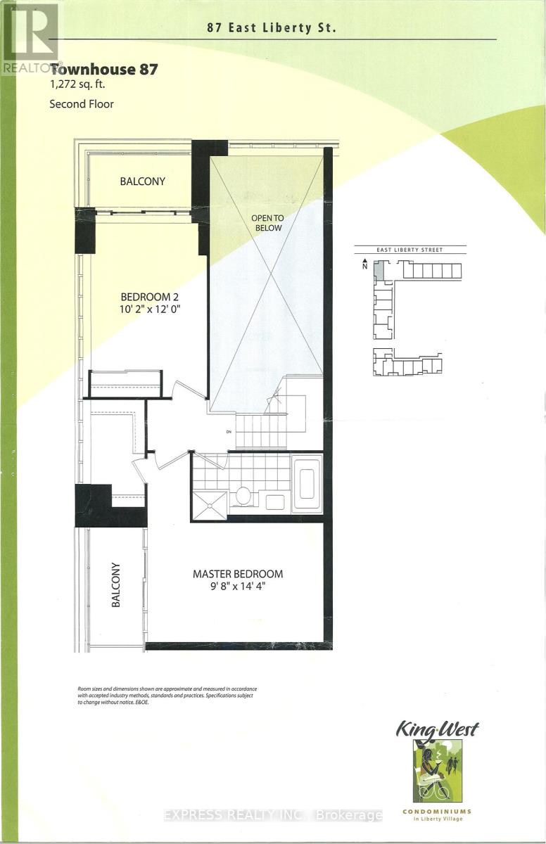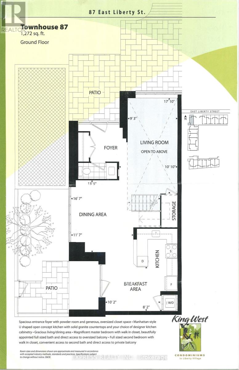 2 - Storey Townhouse at East Liberty Village, 1,272 SqFt. Feature with Spacious Entrance Foyer. Generous oversized Closet space. Living Room with High Ceiling Open to 2nd floor. Manhattan Style u shaped open concept Kitchen w Granite Counter top. Gracious Living / Dining Area. Magnificent Master Bedroom W W/I Closet. Direct access to Balcony . Exclusive use of patio ! 1 Parking & 1 Locker. (42097974)