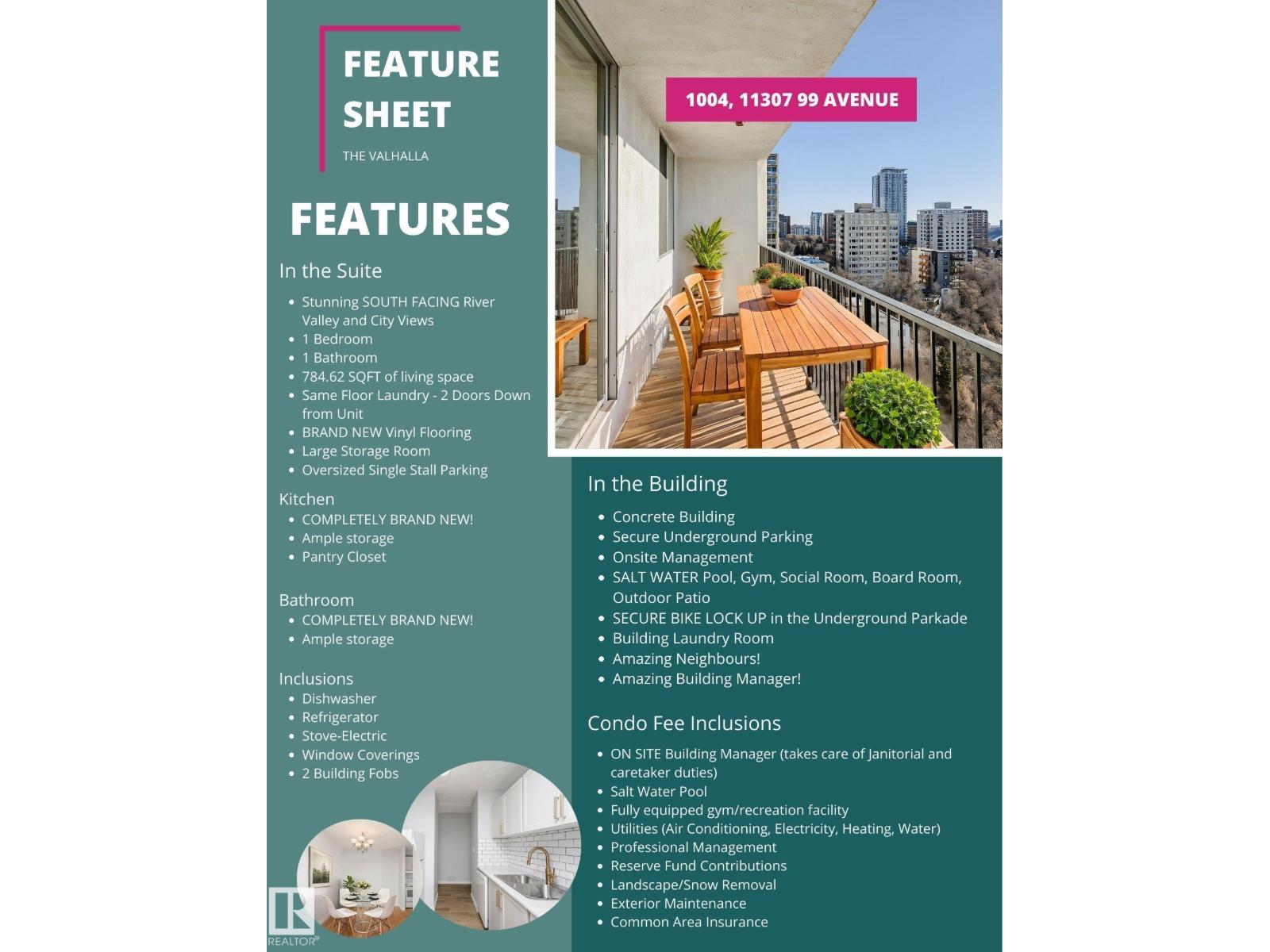 Welcome to Valhalla! An iconic, well maintained high rise offering outstanding amenities and unbeatable location. This RECENTLY UPDATED 1 bed, 1 bath condo is located on the 10th floor, ft. brand a NEWLY RENOVATED kitchen and bathroom, and showcases stunning SOUTH FACING VIEWS of the river valley & Victoria Golf Course from both the unit and the SPACIOUS BALCONY. Inside, the home has been refreshed with new paint and new flooring, creating a clean, modern feel throughout. The building features a well-equipped recreation facility, an INDOOR SALT WATER POOL WITH RIVER VALLEY VIEWS, outdoor patio, party room, visitor parking, and more. This CORNER END UNIT also includes one UNDERGROUND PARKING STALL. Valhalla is PET FRIENDLY with board approval. CONDO FEES INCLUDE UTILITIES and on site management, plus there is a nearby laundry room conveniently located on each floor. Enjoy walking distance to the Brewery District, Royal Glenora Club, River Valley, downtown dining, and countless amenities! (33805714)