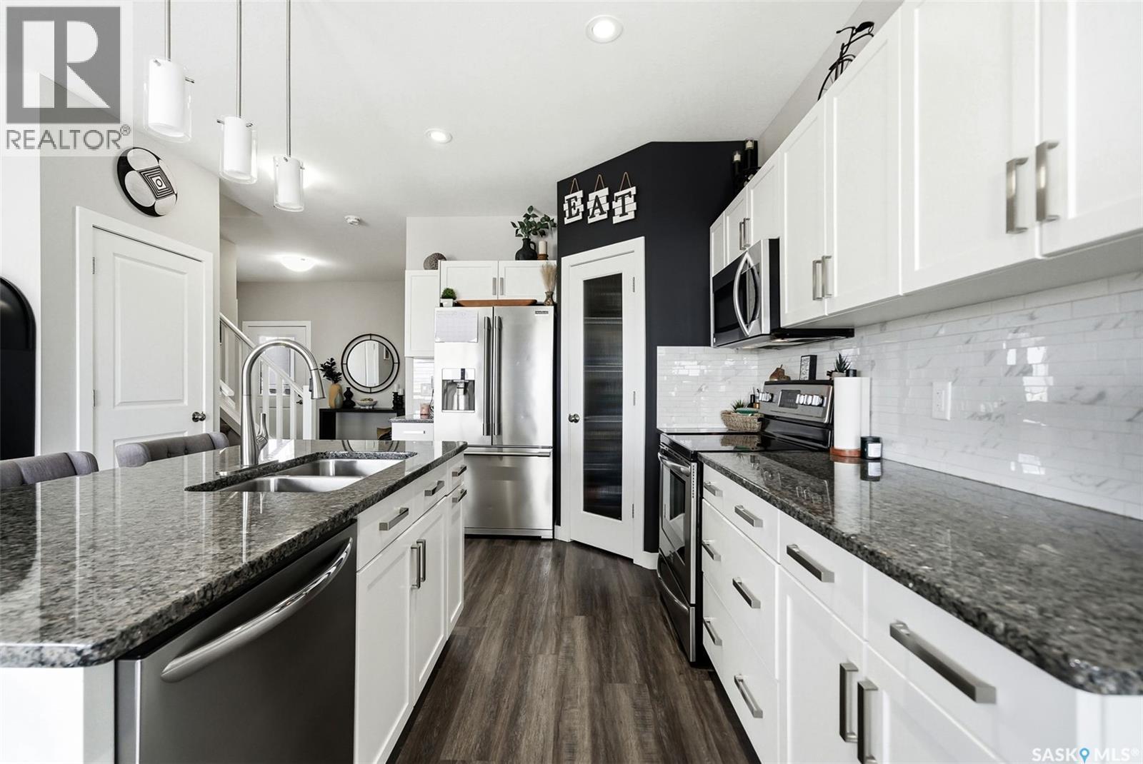 Gorgeous 1751 sq. ft. Open Concept 5 Bedroom, 4 Bathroom, two story built in 2016 with double attached garage and 1 bedroom basement suite located in Edgewater. Open concept on main floor with 9’ ceilings. Beautiful white kitchen with granite countertops, glass backsplash, work/eating island with pendant lighting, corner pantry, fridge, stove, b/I dishwasher, above the range microwave included vinyl plank flooring and overlooking spacious dining area. Livingroom with gas fireplace, wall shelves included, large picture window and vinyl plank flooring (Livingroom drapes not included). There are garden doors to a small deck. There is also a handy 2 pc bathroom on the main floor and direct entry to the insulated double attached garage. The upper-level features 4 bedrooms, primary with large walk-in closet and 4 pc ensuite. A handy spacious laundry room on the upper level (washer & dryer are not included) as well as the main 4 pc bathroom. The Basement features a 1 bedroom suite (with a separate entry from outside the home). Basement kitchen features white cabinetry with fridge, stove, microwave, b/I dishwasher included. Kitchen overlooks the Livingroom with a large window and laminate flooring. Spacious primary bedroom and 4 pc bathroom. The suite has its own laundry room with washer/dryer included. C/air, C/vac, HRV unit. Not included the gazebo & extra patio blocks in the backyard and the upper-level washer & dryer. A great family home! (29361397)
