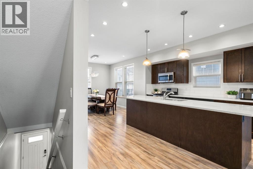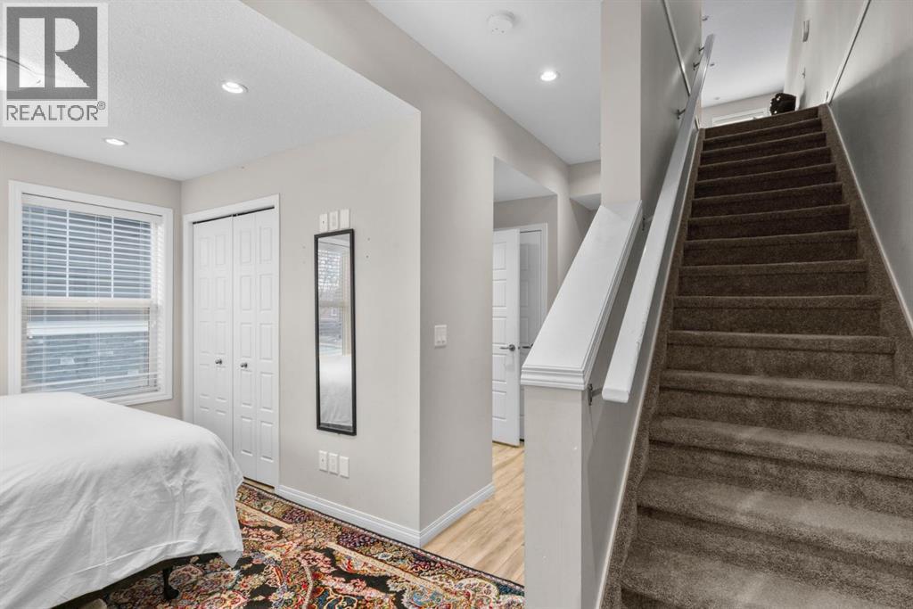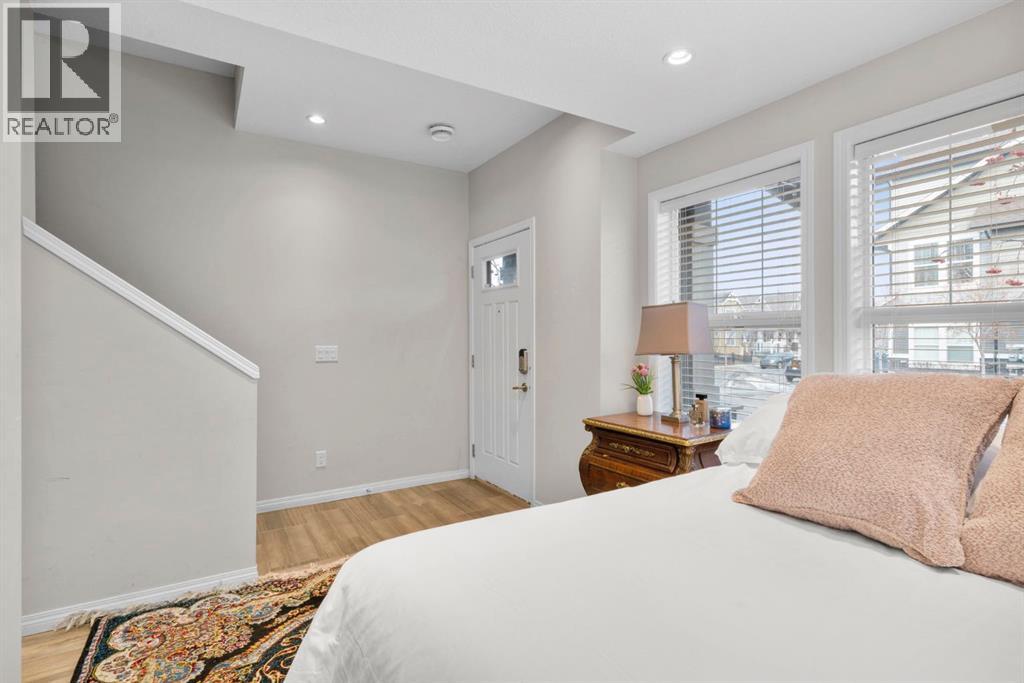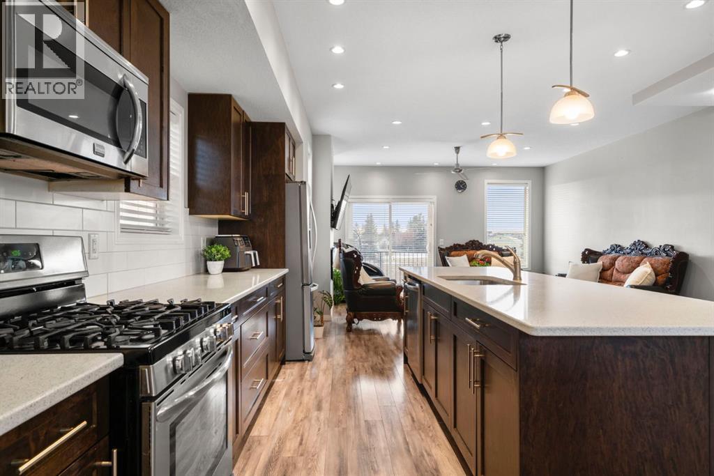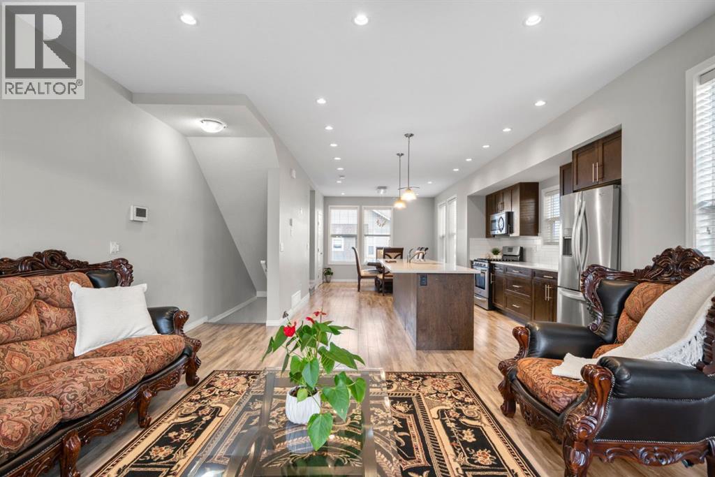 Welcome to this beautifully maintained three-level townhouse in the desirable community of Williamstown in Airdrie, offering 1,718.22 sq ft of well-designed living space, a functional layout, and a rare double attached garage. The ground-level entry provides a welcoming first impression with durable flooring and a bright, practical layout. This level features a spacious office space—ideal for guests, a home office, or multi-generational living—along with a full 3-piece bathroom, offering excellent flexibility and privacy. The main living level showcases an inviting open-concept floor plan designed for both everyday living and entertaining. The kitchen is the heart of the home, featuring quartz countertops, dark cabinetry, stainless steel appliances, a classic subway tile backsplash, and a large central island with seating. The kitchen flows seamlessly into the dining area and spacious living room, where a contemporary electric fireplace adds warmth and style. Large windows flood the space with natural light, and sliding doors lead to a private balcony—perfect for morning coffee or evening relaxation. A convenient main-floor powder room completes this level. Upstairs, the home continues to impress with three additional bedrooms, including a generous primary retreat featuring a 4-piece ensuite and ample closet space. A second full bathroom serves the additional bedrooms, while upper-floor laundry adds everyday convenience and efficiency. Outside, enjoy open sightlines and green space views, enhancing both privacy and lifestyle appeal. Located in a well-maintained complex, this home is close to walking paths, parks, schools, shopping, and offers easy access to major commuter routes. This move-in-ready townhouse delivers the perfect blend of space, comfort, and location—ideal for families, professionals, or investors seeking a low-maintenance lifestyle in one of Airdrie’s most welcoming communities. (31617690)