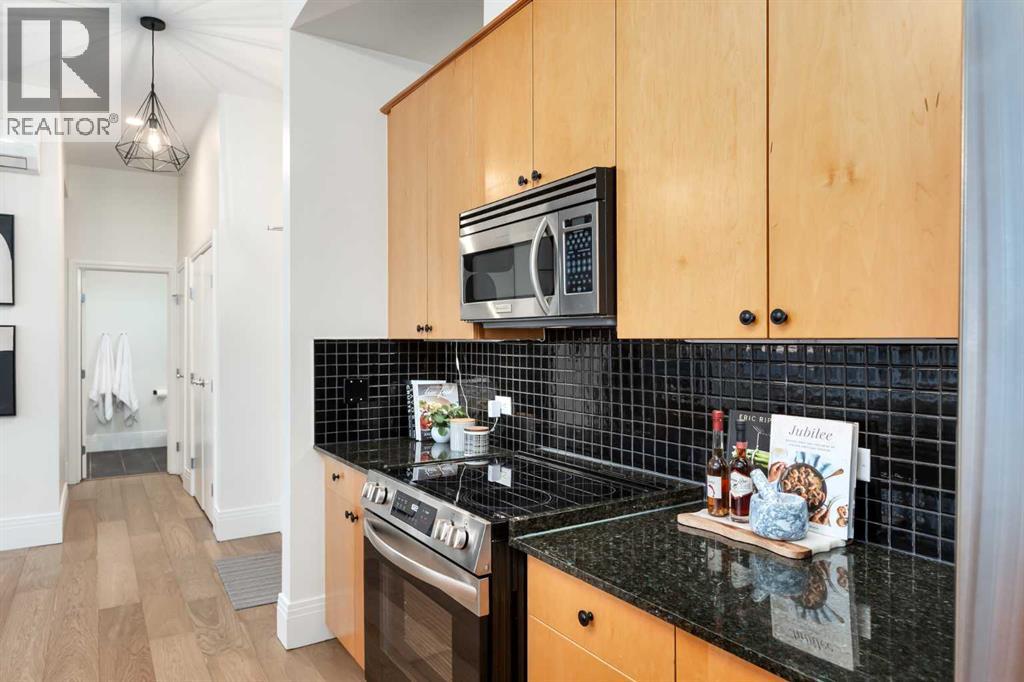 Step into this stunning 2-bedroom, 2-bathroom condo in one of Calgary's most sought-after inner-city neighbourhoods. With brand new hardwood flooring throughout and gorgeous wood-frame windows that flood the space with natural light, this home blends warmth and modern sophistication effortlessly.The open-concept living and dining area is anchored by a gas fireplace set against a striking dark feature wall, perfect for cozy evenings in. A sleek kitchen with granite countertops, stainless steel appliances, and a black tile backsplash flows seamlessly into the entertaining space, with bar seating at the island for casual meals.The generous primary bedroom easily accommodates a king-size bed with plenty of room to spare, and features a large walk-in closet and ensuite bathroom. One of this home's standout features is its private rooftop patio, a rare find! Offering sweeping neighbourhood views and the perfect spot for summer dinners and morning coffee. Speaking of coffee, there's a Starbucks on the main floor of the building for those on-the-go mornings.Additional highlights include underground parking, and condo fees that cover all utilities except electricity.Located in the heart of Bridgeland, you're steps from the pathways, local shops, plenty of restaurants, and just minutes to downtown Calgary. This is the lifestyle you've been looking for. (31617897)