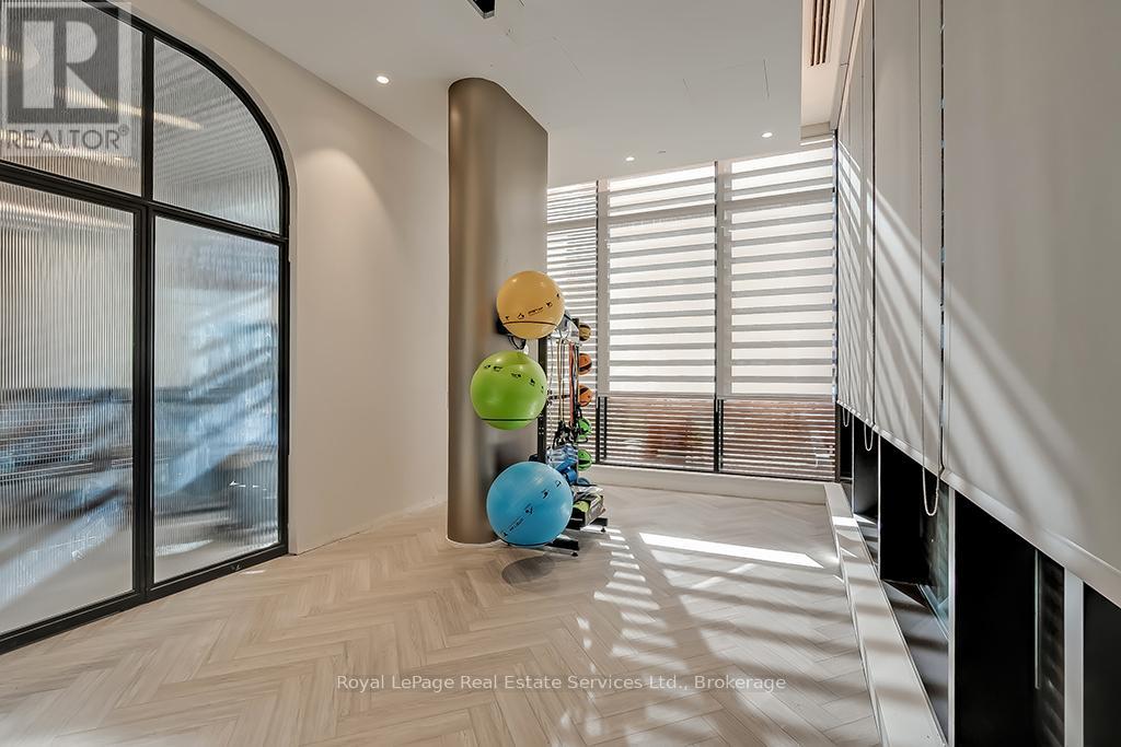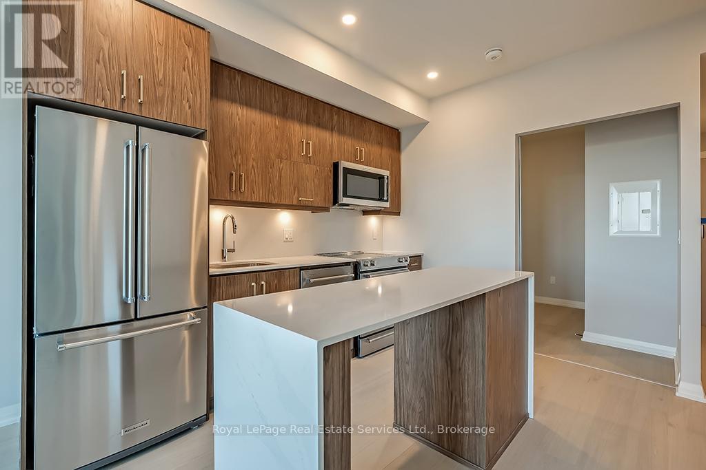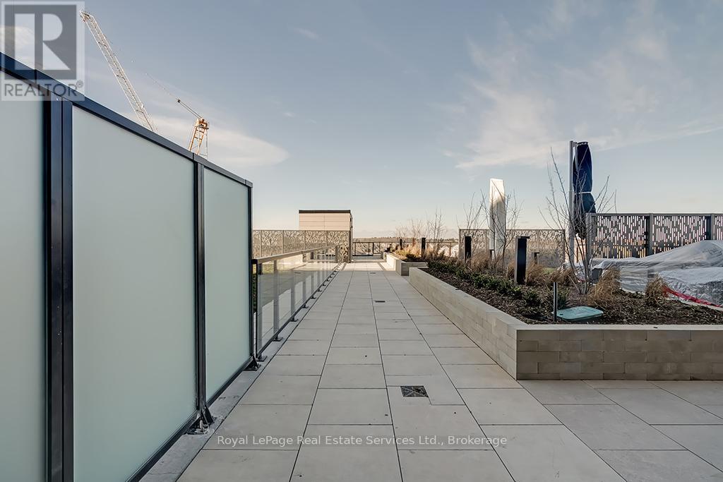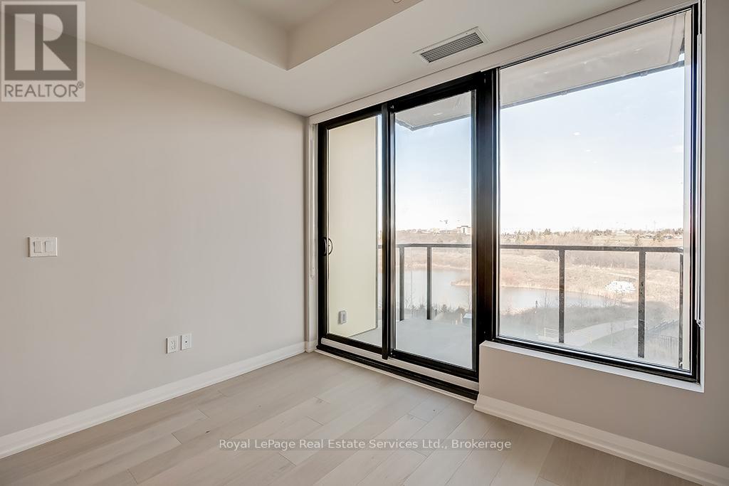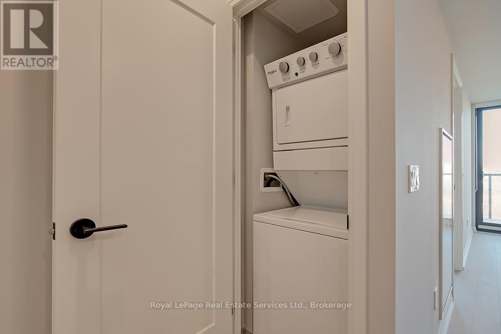 Beautiful 2 Bed, 2 Bath Condo in Mattamys Clockwork. Discover Modern Living in this Stunning Condo with almost $50k in Upgrades. Featuring an open-concept layout with hardwood flooring throughout, custom window treatments, soaring 9 ft ceilings, and an abundance of natural light. The sleek kitchen boasts contemporary cabinetry, stainless steel appliances, granite countertops, and a center island with storage and seating. Step into the living room, which opens to a private balcony overlooking a serene pond. The spacious primary bedroom is a retreat with large windows, ample closet space, and a luxurious 3-piece ensuite with a glass-enclosed shower. The unit also includes a second bedroom, a 4-piece bath, and a convenient in-suite laundry with stackable washer and dryer. Access to top tier building amenities including a state-of-the-art home smart home system (1VALET), Gym, Party/Meeting Room, Pet Spa + Rooftop Patio. 1 Underground Parking Spot + 1 Locker included! Tenant only responsible for Hydro + Water- internet is included in the rent! Located just minutes from highways, Oakville Hospital, trails, parks, shopping, and other amenities, this condo offers unparalleled convenience. (42102515)