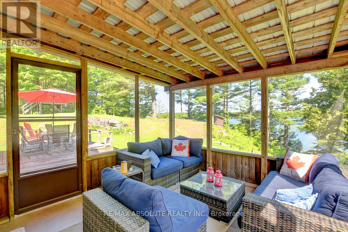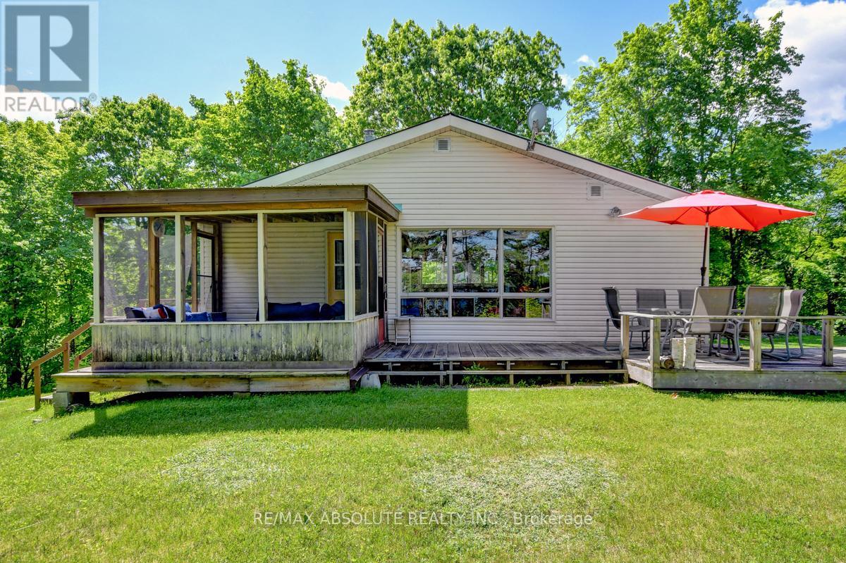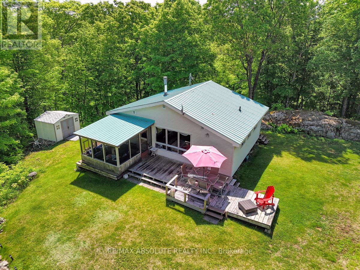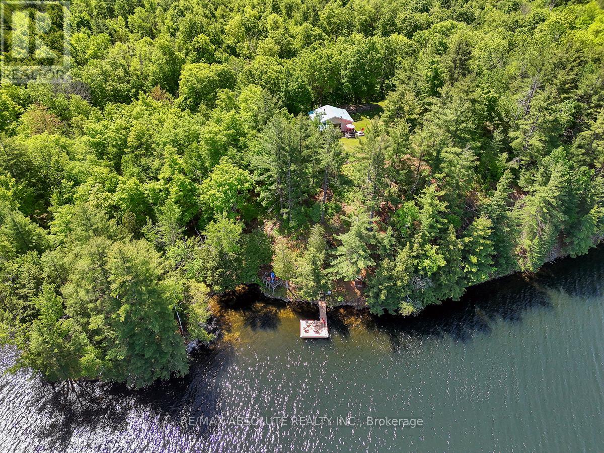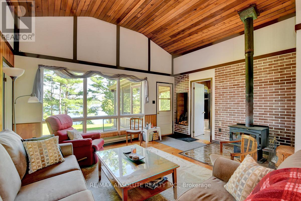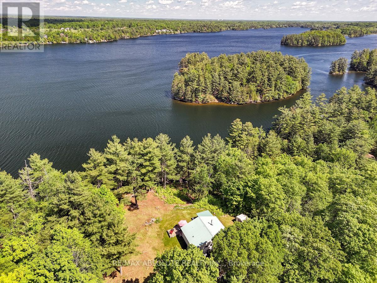 Rare opportunity to own 6.9 acres of waterfront with approximately 850 feet of shoreline and mature mixed forest offering exceptional privacy. This rustic three-season cottage features tongue and groove pine ceilings, a durable metal roof, and an open-concept living area with expansive lake-facing windows. Three bedrooms provide cozy accommodations, while a screened sunroom and spacious deck are ideal for outdoor entertaining. Set slightly elevated, a newer staircase leads down to the water and a large dock in a private bay, perfect for swimming and boating. Property offers excellent future potential to enjoy as-is, build, or explore severance possibilities (buyer to complete due diligence with township). Water source is lake intake. Annual road maintenance fee $134. 24-hour irrevocable on all offers. (42102553)