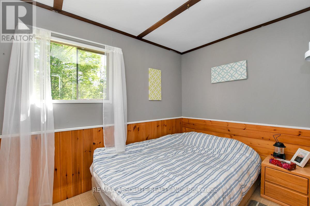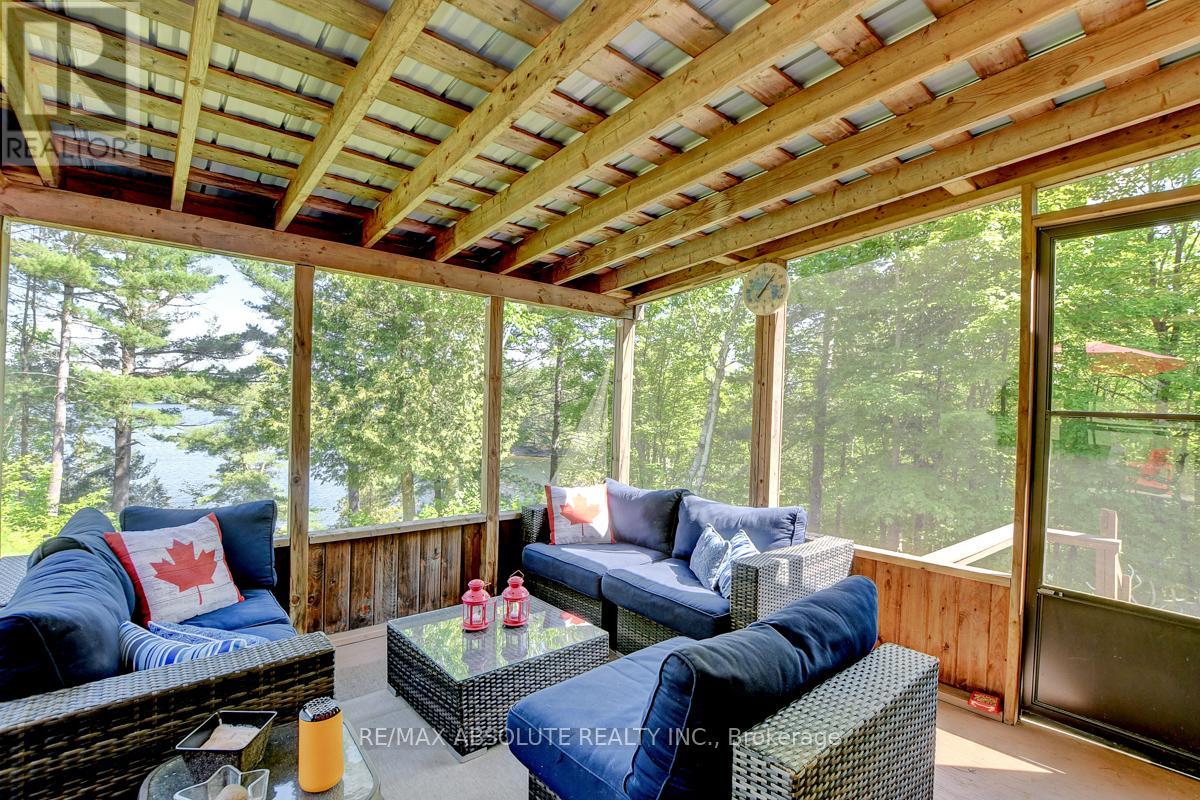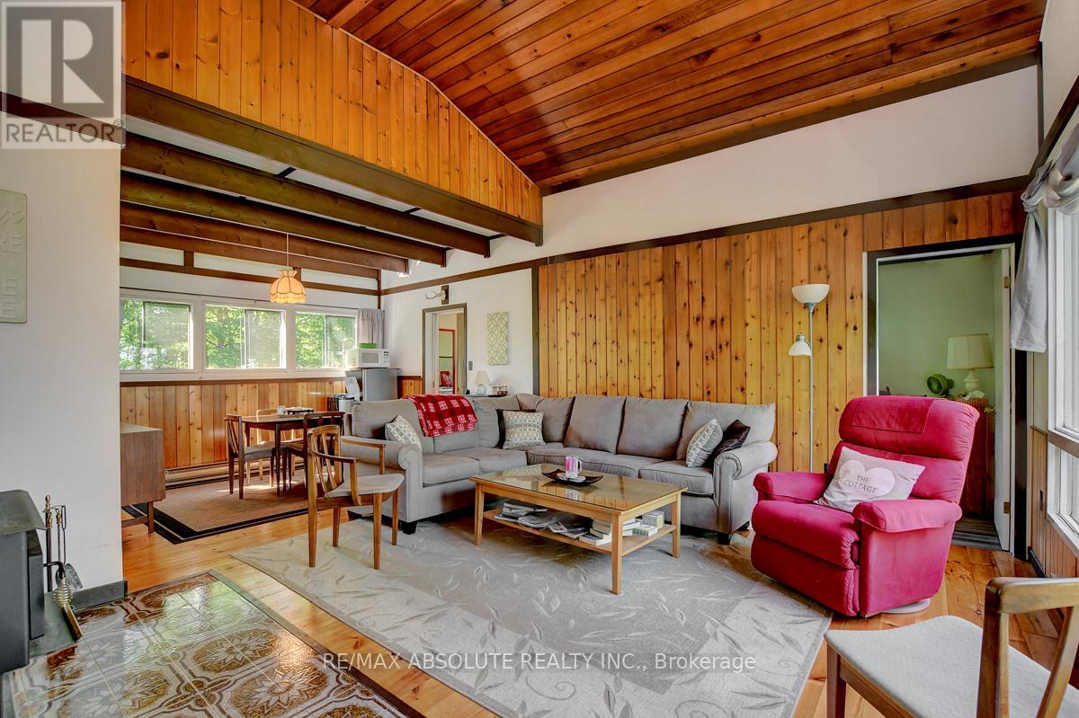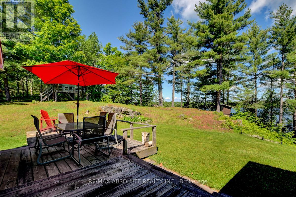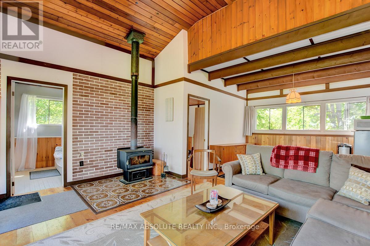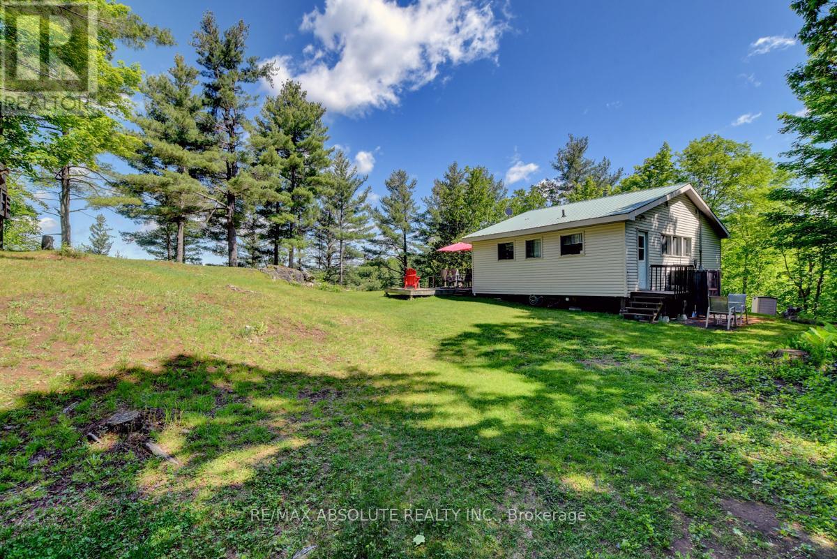 Rare opportunity to own 6.9 acres of waterfront with approximately 850 feet of shoreline and mature mixed forest offering exceptional privacy. This rustic three-season cottage features tongue and groove pine ceilings, a durable metal roof, and an open-concept living area with expansive lake-facing windows. Three bedrooms provide cozy accommodations, while a screened sunroom and spacious deck are ideal for outdoor entertaining. Set slightly elevated, a newer staircase leads down to the water and a large dock in a private bay, perfect for swimming and boating. Property offers excellent future potential to enjoy as-is, build, or explore severance possibilities (buyer to complete due diligence with township). Water source is lake intake. Annual road maintenance fee $134. 24-hour irrevocable on all offers. (42102553)
