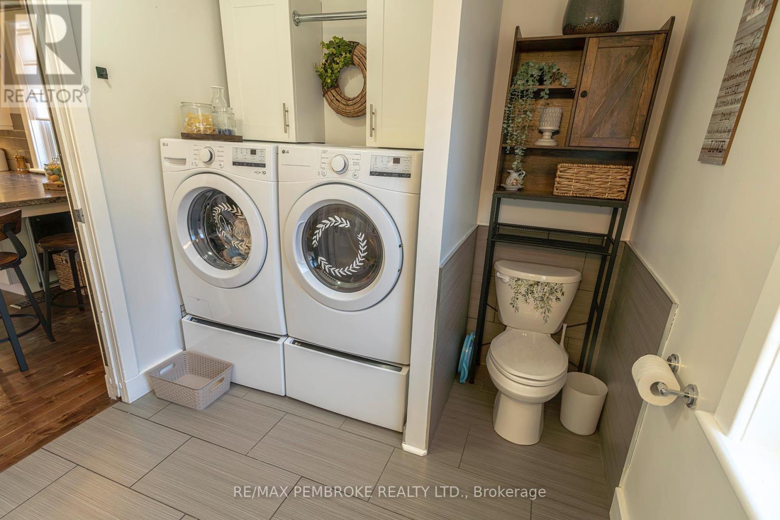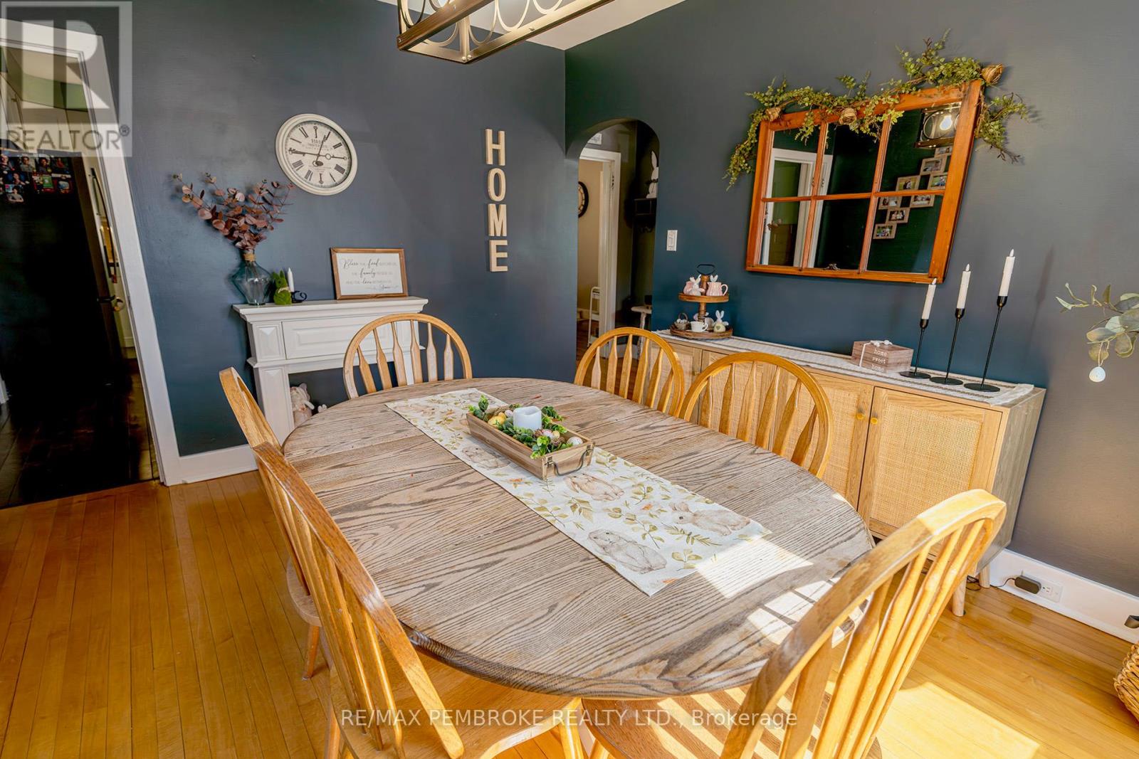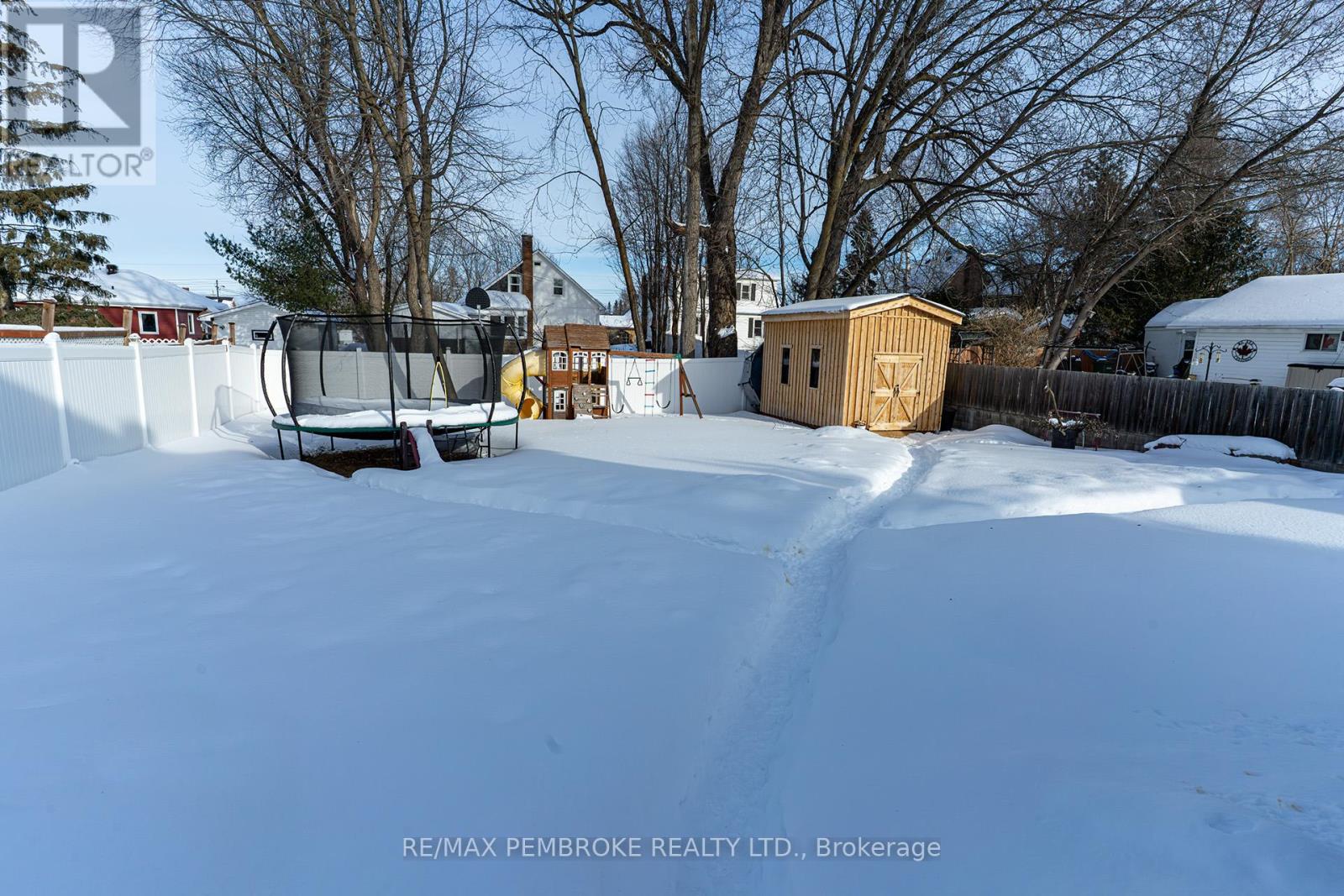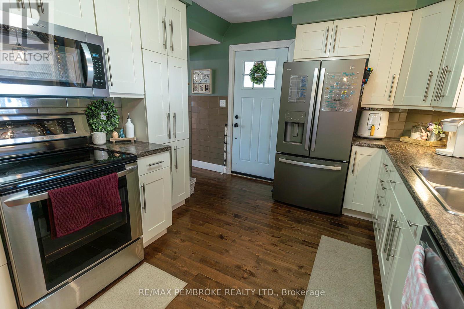 Exceptional brick 2 Storey family home, close to schools, shopping and the Pembroke Regional Hospital. Enter the large breezeway/mudroom, leading into a LARGE updated, modern white kitchen with ample cabinets and tons of counter space including a handy breakfast nook. A convenient full bath and laundry are also on the main level. The Living room and formal dining room are bright filled with natural light and roomy with hardwood flooring and numerous windows. Upstairs you will find 3 spacious bedrooms - all with hardwood floors and a modern 4pc bath. Head downstairs to a finished basement with another bath (2 pc), a family room with a kitchenette. Loads of space in this charming family home. A bonus exercise room is off the breezeway. Outside is a oversized deep fenced in lot with patio area with pergola and LARGE storage shed. (42103174)