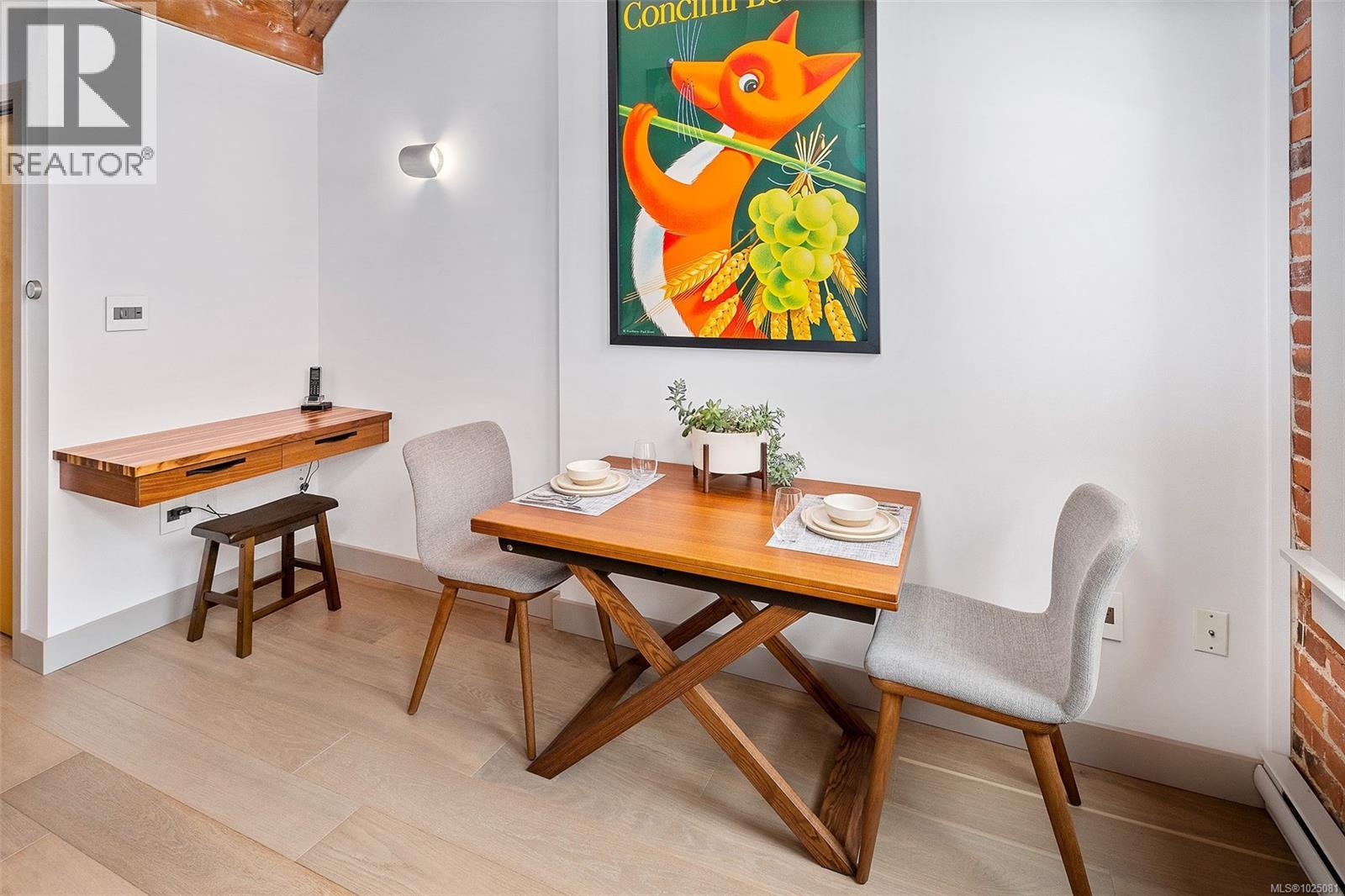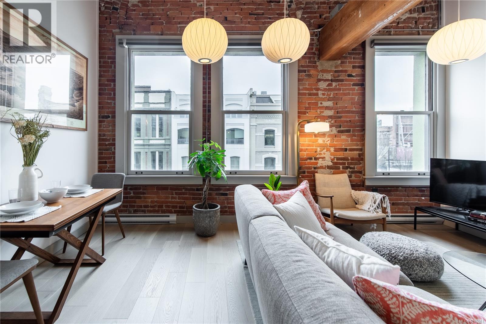 Heritage loft living in the heart of Old Town Victoria at The Vogue, a premier steel and concrete heritage conversion offering exceptional character and quality. This luxury heritage loft combines historic charm with extensive modern upgrades, featuring soaring 21-foot ceilings, exposed old-growth beams, a brick feature wall, and dramatic floor-to-ceiling windows fitted with Hunter Douglas remote-controlled sheers and blackout blinds ($7,500 value). The gourmet kitchen is thoughtfully designed with custom cabinetry, stone countertops, glass subway tile backsplash, and high-end European appliances including a Bosch dishwasher ($2,500), Blomberg gas range ($4,000), and Blomberg refrigerator ($3,000), plus premium sink and fixtures ($2,000). The open living space is anchored by a new Valor gas fireplace installed in 2025 ($7,500 value) with custom tile surround, creating a warm and inviting focal point. Additional upgrades include custom lighting ($5,000), custom bathroom cabinetry ($8,000), a built-in desk ($2,500), in-suite laundry, and radiant heated floors throughout. The spacious loft level features 11-foot ceilings and comfortably accommodates a king-size bed and full furnishings, complete with an ensuite that can be converted back to a shower if desired. Enjoy outdoor space with a 17-foot private balcony with irrigation, as well as access to a shared rooftop deck offering an elevated urban retreat. The home includes one secure underground parking stall and a storage locker. Located steps from Victoria’s best shops, cafés, dining, and transit, this is a rare opportunity to own a beautifully upgraded loft in one of the city’s most iconic heritage buildings. Over $77,000 in upgrades. For more information or to arrange a private showing, contact Christian at 778-678-3098. (30360606)
