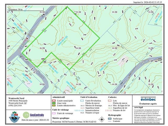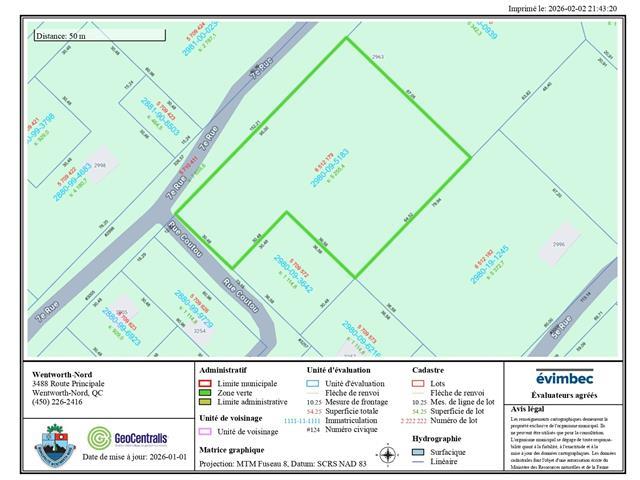 Rare opportunity in Wentworth-Nord. Wooded residential lot of 56,565 sq. ft. offering 312 linear feet of frontage, located at the corner of 7th Street and Coutou Street, only 450 m from the municipal beach of Lake Laurel. Single-family residential zoning (H-39), public road with municipal snow removal. Prepared construction file including soil study, percolation tests, professional report, septic system plans and specifications, site plan, proposed well location, and complete house plans. Well-thought-out project allowing for reduced timelines. Peaceful and sought-after Laurentians area, ideal for a residential project. (50869621)