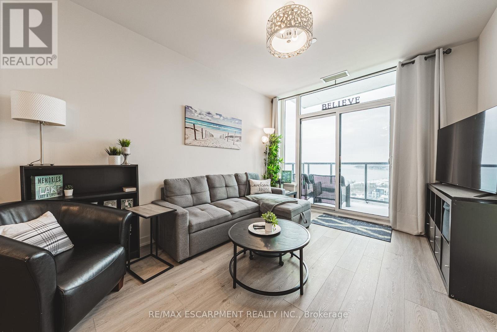 Enjoy breathtaking views of Lake Ontario and the Niagara Escarpment from this bright, modern condo in a highly desirable waterfront community. Just steps from the beach, local shops, cafes, dining, and scenic lakefront trails. Huge upgrade with two parking spots logistically positioned side by side and steps from the elevator. Approximately 12 k in upgrades. This thoughtfully designed unit features sleek laminate flooring throughout with massive island, stainless steel appliances, and an open-concept layout. The spacious den offers versatility-ideal for dinette and entertaining, guest room, office or nursery. Floor-to-ceiling windows flood the space with natural light, creating a warm and inviting atmosphere. Resort-style building amenities include a fully equipped gym, yoga/spin studio, self-serve pet spa, rooftop terrace with BBQs and indoor/outdoor dining, a sky lounge with fireplace, stylish party room, indoor bicycle storage, 24-hour concierge, and security cameras for peace of mind. Located just 30 seconds from the QEW for easy commuting. Includes one parking spot and one locker. Costco, Metro, LCBO, coffee shops, and restaurants are just across the street. Ideal for first-time buyers, professionals, or investors looking for lifestyle and location in one unbeatable package. (42106398)
