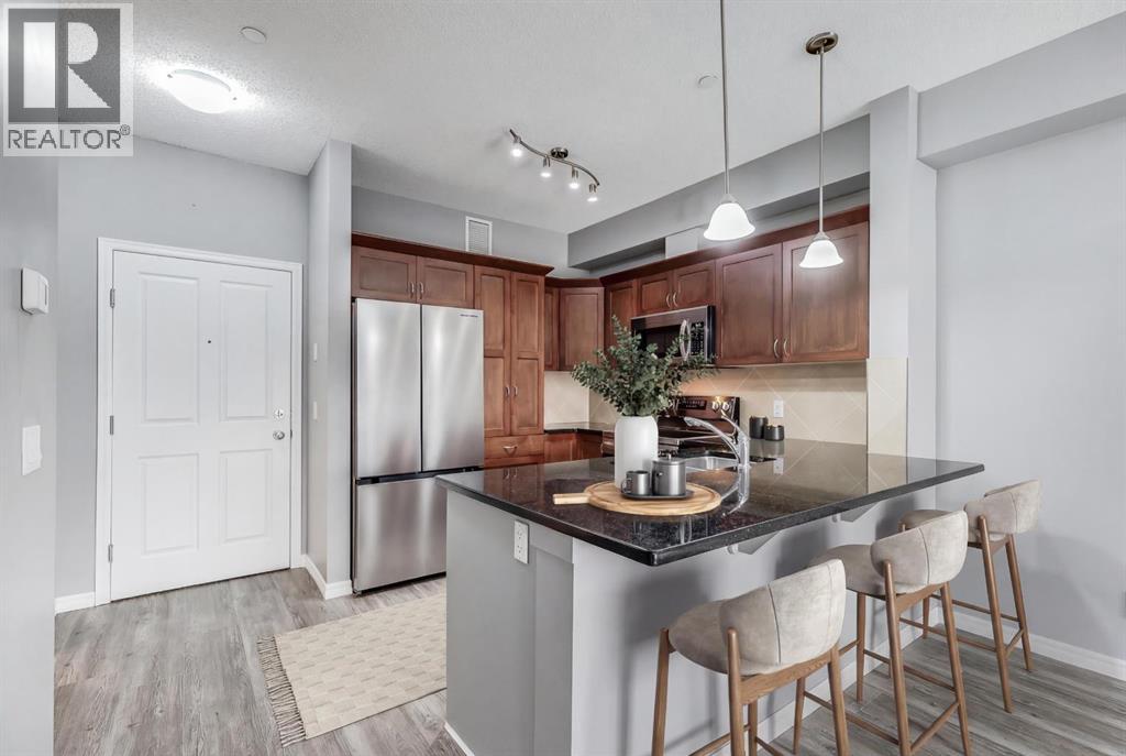 ABSOLUTELY PERFECT LOCATION for this stunning ground-floor 1-bedroom condo in The Courtyards of King’s Heights! One of the best features of this unit is its private entrance from the spacious covered patio—ideal for morning coffee or easy access when entertaining guests. Step inside to discover a bright, open-concept layout with luxury vinyl plank flooring throughout. The kitchen is beautifully finished with rich cabinetry, granite countertops, an eating bar, newer stainless steel appliances, and plenty of workspace for those who love to cook. The dining area offers ample room for hosting friends and family, while the living room is warm and inviting, highlighted by large windows overlooking the meticulously maintained central courtyard. The spacious bedroom features 2 large closets and ensuite access to the 4-piece bathroom with a tub/shower combination. Additional conveniences include in-suite laundry, ample storage within the unit, plus a separate storage locker downstairs (Storage Room 2 – Locker 20). The complex itself is beautifully maintained, offering plenty of visitor parking and a gorgeous courtyard filled with perennials, a charming gazebo lit at night, and well-kept grounds that show true pride of ownership (10/10!). Additional features include rough-ins for a security system and garburator, satellite TV hookups, and a Thermolec fresh air circulation system for enhanced air quality. This unbeatable location is within walking distance to Kingsview Market, home to fantastic restaurants, grocery stores, and more. Your assigned parking stall (128A) is conveniently located near Building 2000, positioned on a corner, and includes a plug-in. (31623565)