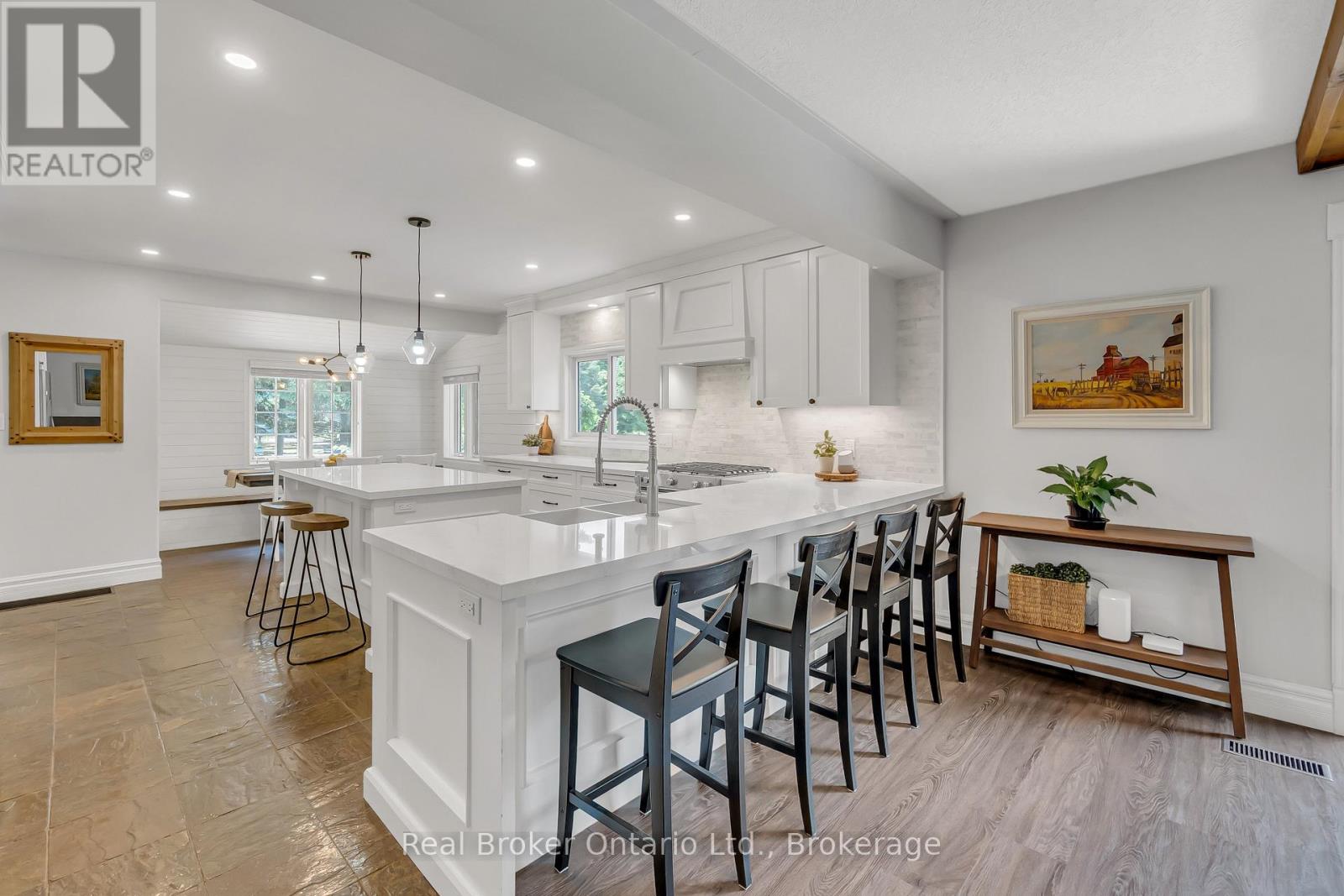 Welcome to 6566 Concession Rd 4, a beautifully updated country retreat offering the perfect blend of modern comfort and rural charm. This 3- bedroom, 3-bathroom home sits on a private, landscaped lot in the heart of Puslinch - just 5 minutes to Guelph, less than 5 minutes to Cambridge, and with quick access to the 401 for commuters. Families will appreciate being in the Kortright Hills Public School catchment (JKGrade 8), offering excellent education within reach. Inside, the heart of the home is the bright, open-concept kitchen, featuring quartz countertops, a large island, custom cabinetry, and stainless steel appliances. The adjoining living area is equally inviting, with exposed wood beams and a cozy fireplace that makes it perfect for gathering. Extensive renovations over time include a fully finished basement, a luxurious new ensuite bathroom, and heated floors in the kitchen, basement, ensuite, and kid's bathroom - ensuring comfort throughout the seasons. Step outside to your own private oasis. The fenced, fully landscaped backyard includes a covered patio, outdoor kitchen, and hot tub - perfect for entertaining or relaxing in peace. A standout feature of the property is the detached garage with both front and rear garage doors, offering added functionality, storage, and easy access for yard equipment or recreational vehicles. Additional highlights include a drilled well (approx. 120+ ft deep with excellent water quality), a septic system installed around 2015, and the rare benefit of natural gas on a country property. With modern conveniences, scenic surroundings, and an unbeatable location close to top schools, trails, and amenities, this move-in ready home offers an exceptional lifestyle opportunity in one of Wellington County's most desirable rural communities. (42110732)