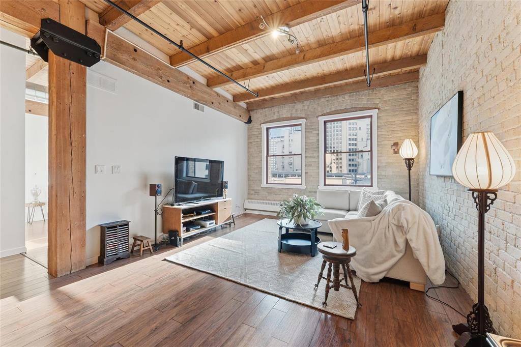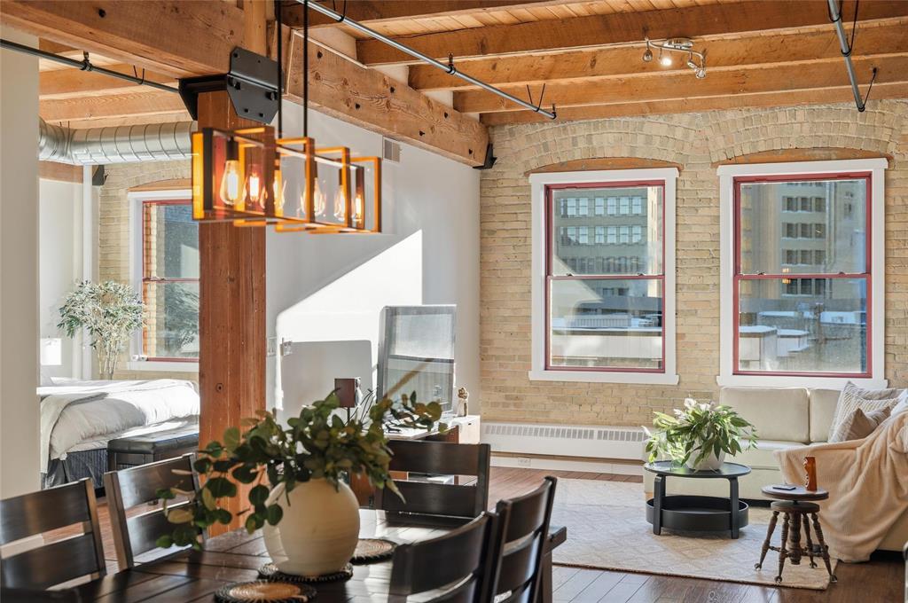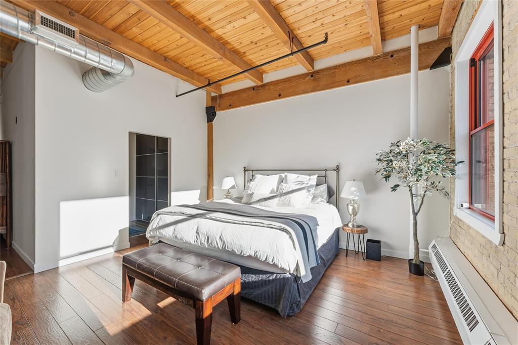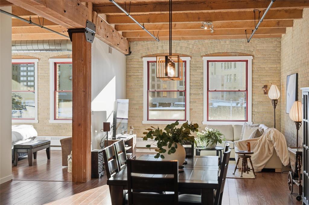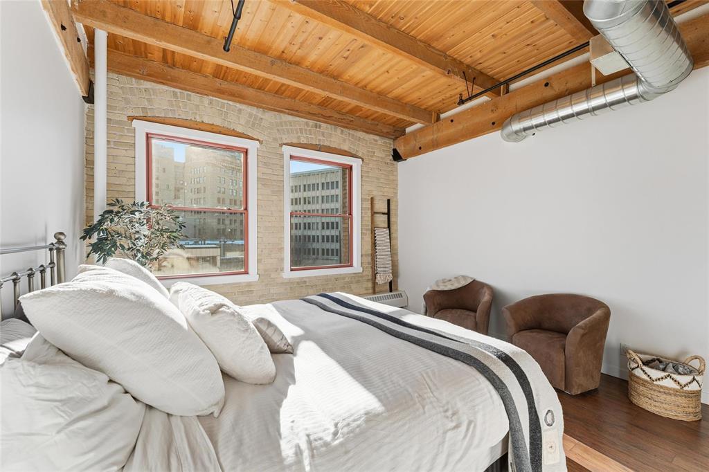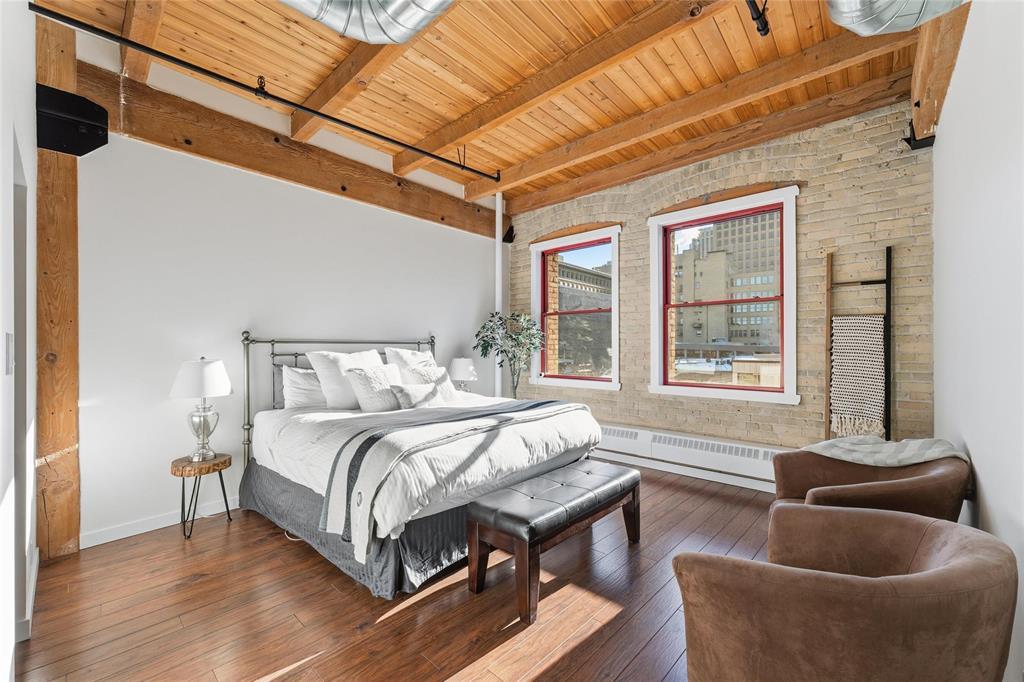 9A//Winnipeg/Looking for space?This expansive Loft condo has almost 1800sq ft on one level and will not disappoint!One of only 5 of the largest units out of 100 condos in the ever so popular Ashdown Warehouse!Located in the heart of the Exchange District this well established condo corp since 1987. South facing and absolutely flooded with light as there are 4 large South facing windows to let the sun shine in! Incredible downtown views! Gorgeous walls of reclaimed brick! Beautiful upgrades throughout this condo! Kitchen has been completely redone and expanded with tons of cabinet space and a huge Island with gorgeous granite! Lots of nice custom touches everywhere such as a coffee bar and a wine bar area with wine fridge! Unique custom cedar ceiling for added aesthetic,additional sound barrier plus enhances the "Loft" feel and accentuates the massive Fir beams! The primary bedroom is bright and sunny with a walkthrough closet/closet systems leading to an ensuite bath*.Second extra large bedroom and bath! Wood floors throughout! Oversized underground heated parking and heat included in condo fees! Pet friendly building! This is one condo you need to come and see for yourself! Check out the video!! (231944005)