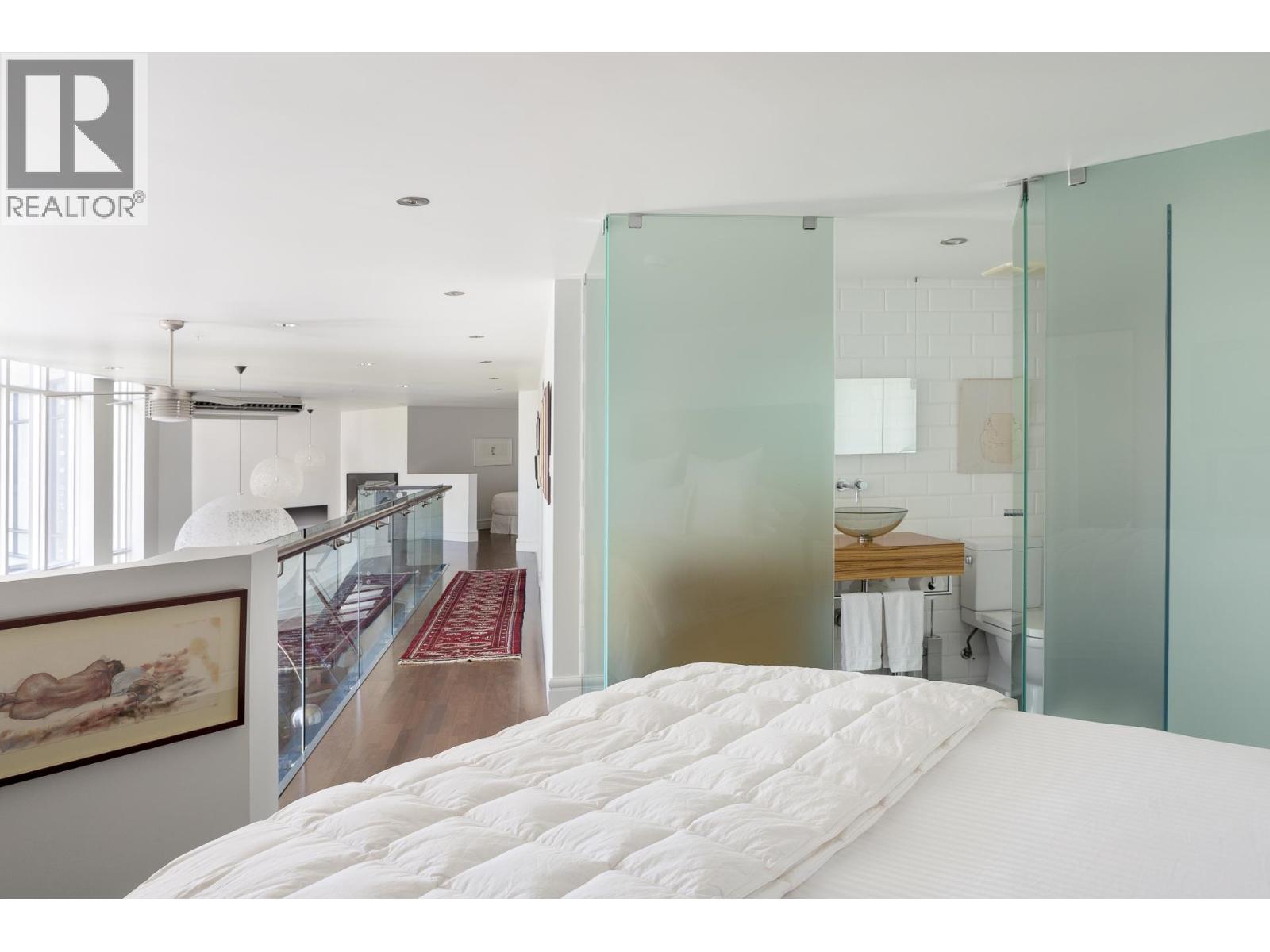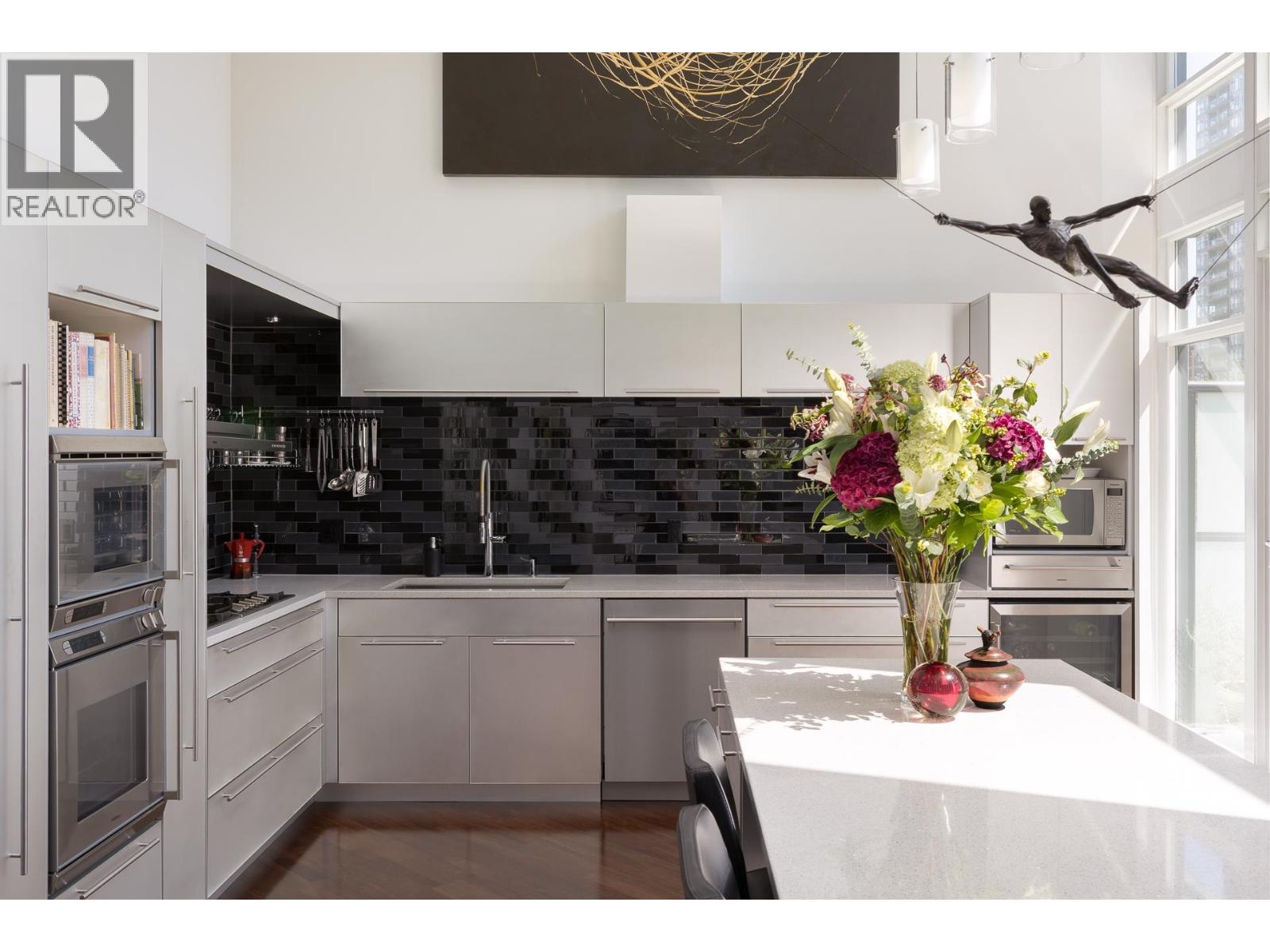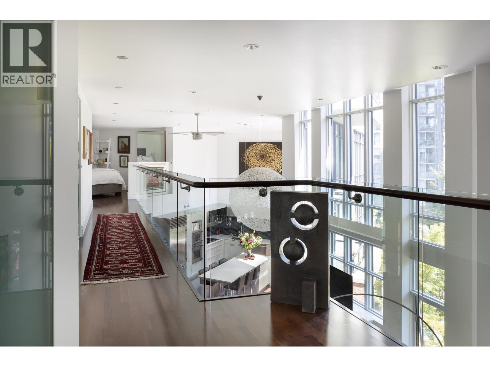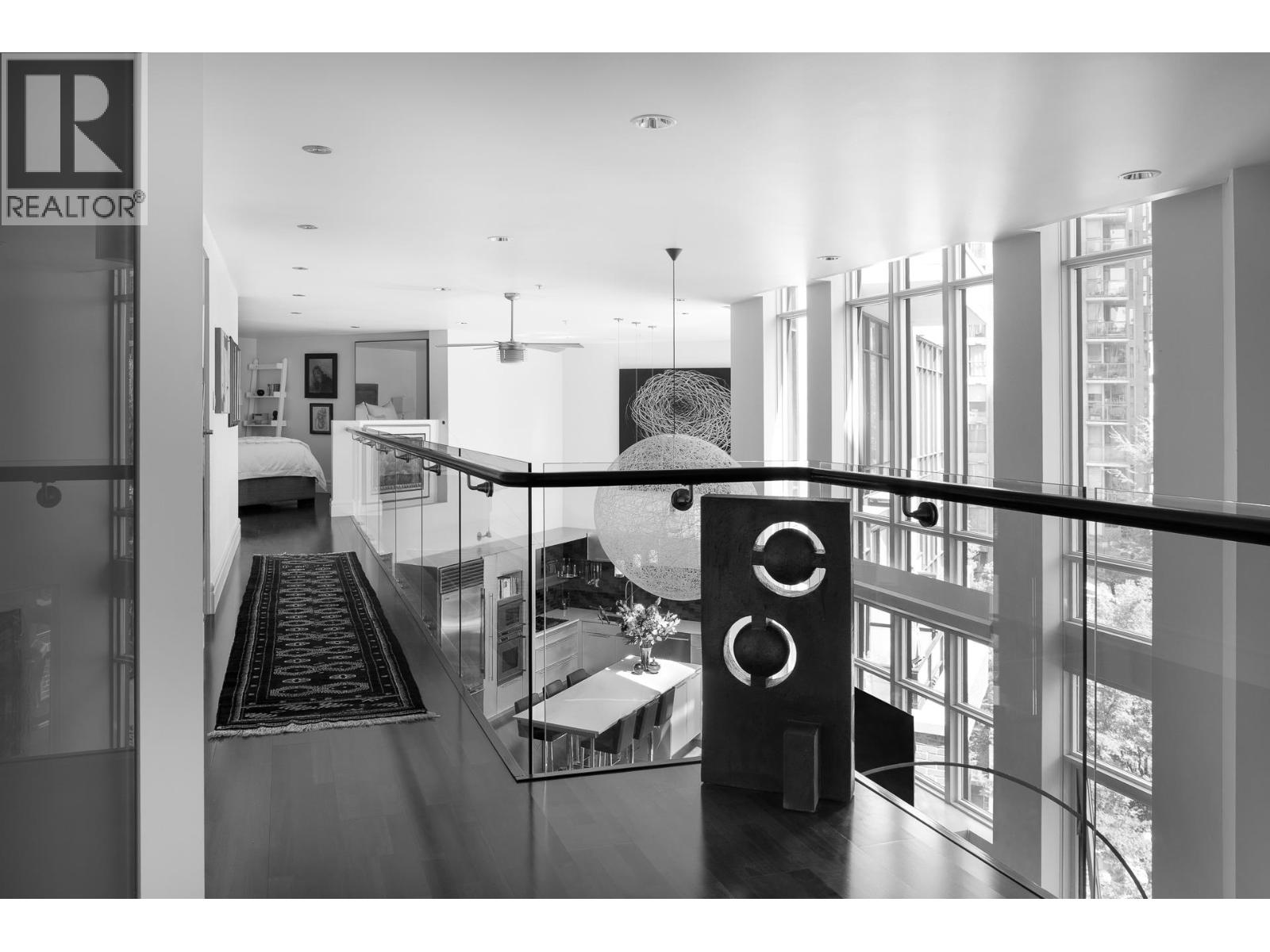 The right art changes how you live; the right space makes it possible. Those who value art and design will appreciate the grandeur in this 2,000 square ft loft, created when the developer of boutique "Tribeca Lofts" combined two strata lots for a "WOW" space unique to Yaletown. Sixteen-foot ceilings with floor-to-ceiling windows and motorized blinds create uninterrupted wall space and shifting natural light. Concrete construction optimizes for acoustic privacy while the shape of the home, wrapped around the quiet courtyard, provides solitude from main roads. A refined interior centers around the oversize kitchen island and upgrades which include an architectural staircase and glass balustrades. Two lofted, king-sized ensuite bedrooms maintain connection to the gallery-like living space below; two parking and private storage room connect you to pragmatism. Some spaces are occupied; others stay with you. Open House Sunday 2:30 - 4pm (32431292)