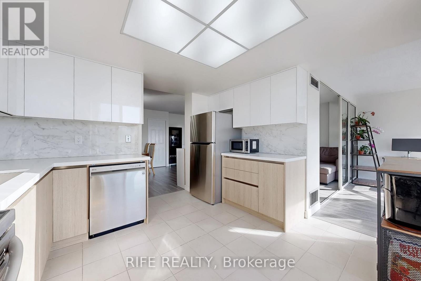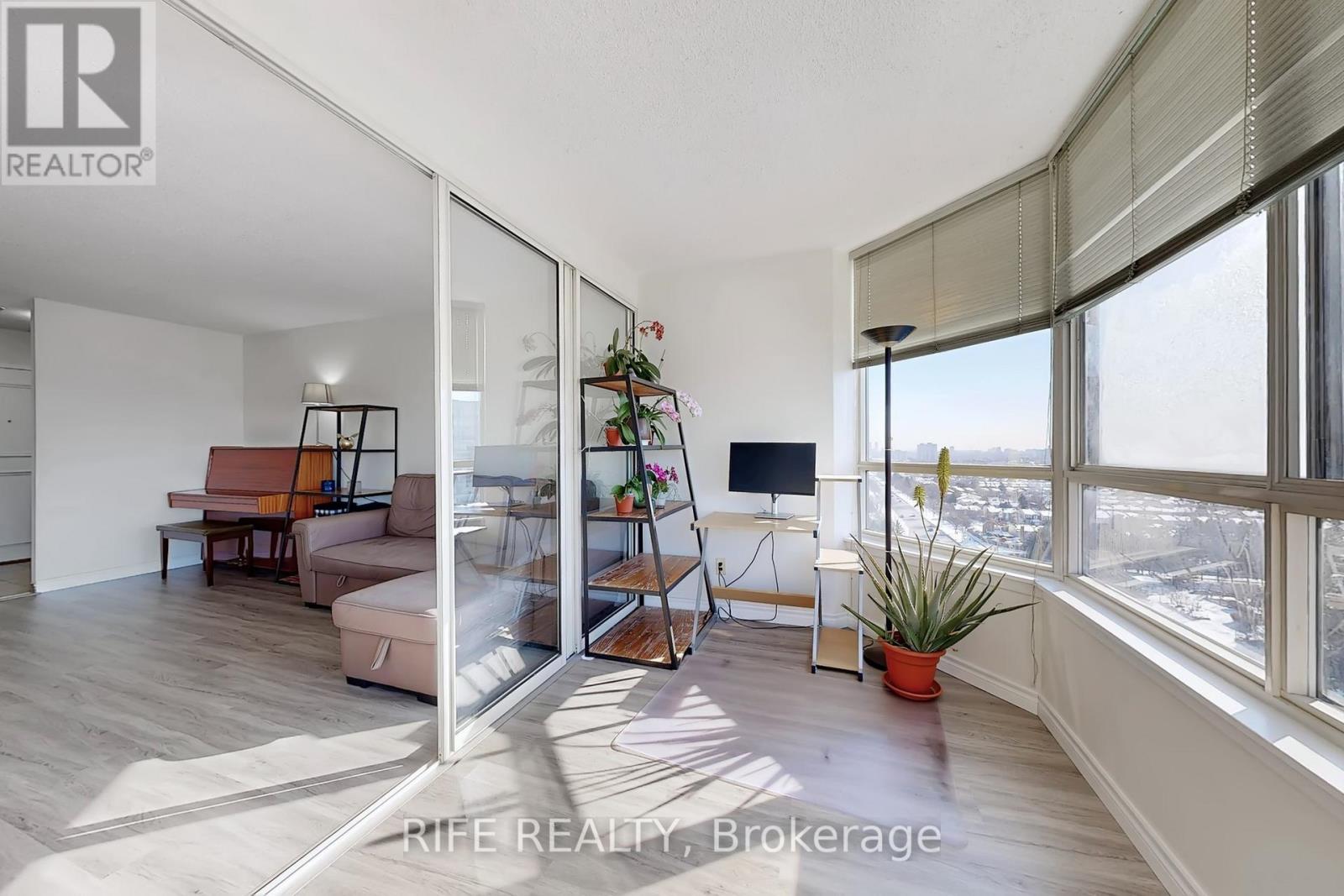 Bright & Spacious Corner Unit Approx. 1,300 Sq. Ft. Newly renovated with laminate flooring throughout. This sun-filled suite offers 2 large bedrooms, 2 full bathrooms, plus a fully enclosed den with door and window, featuring breathtaking, unobstructed views-easily convertible into a third bedroom, home office, or guest room. The primary bedroom includes a private ensuite, walk-in closet, and elegant bay window. Large windows provide exceptional natural light with no buildings blocking the view, and on clear days, even a glimpse of Toronto's downtown skyline. Separate laundry room with large storage area. Exceptionally well-maintained building with condo fees including water, heat, A/C, hydro, and cable TV. Unbeatable location with a supermarket and a variety of restaurants right downstairs; banks within a 5-minute walk, and quick access to Highways 401 and 404 within a 10-minute drive. Exceptionally well-maintained building with condo fees including water, heat, A/C, hydro, and cable TV. (42117679)