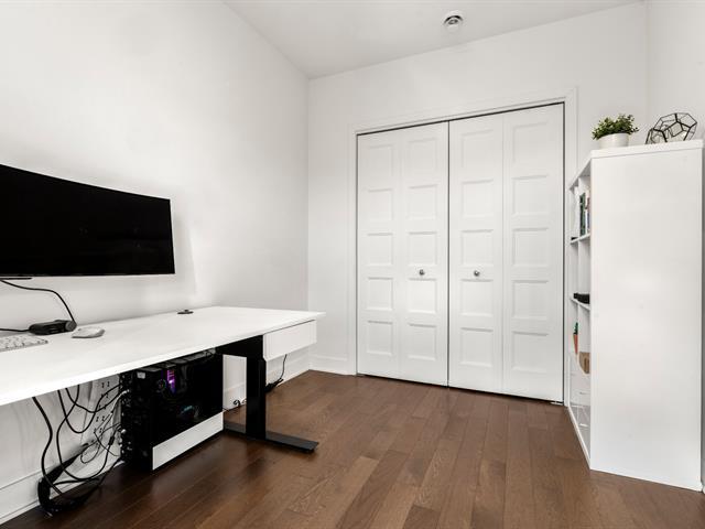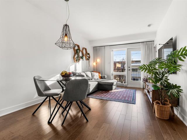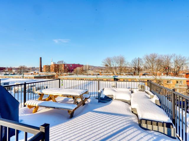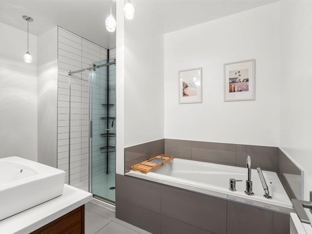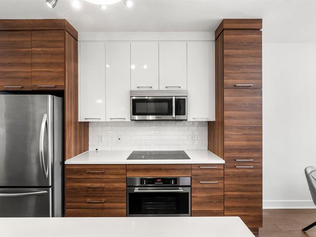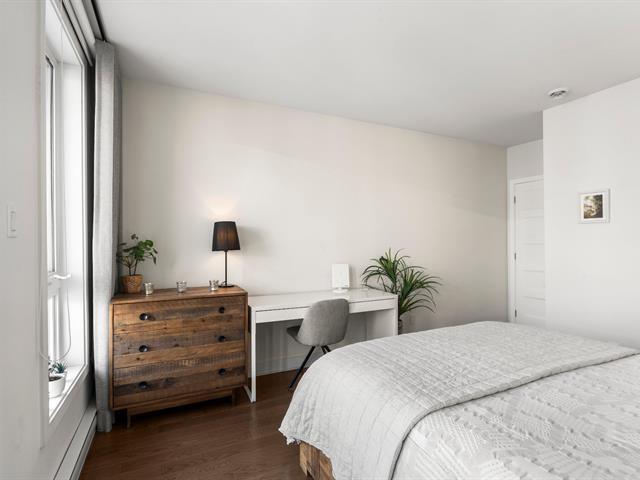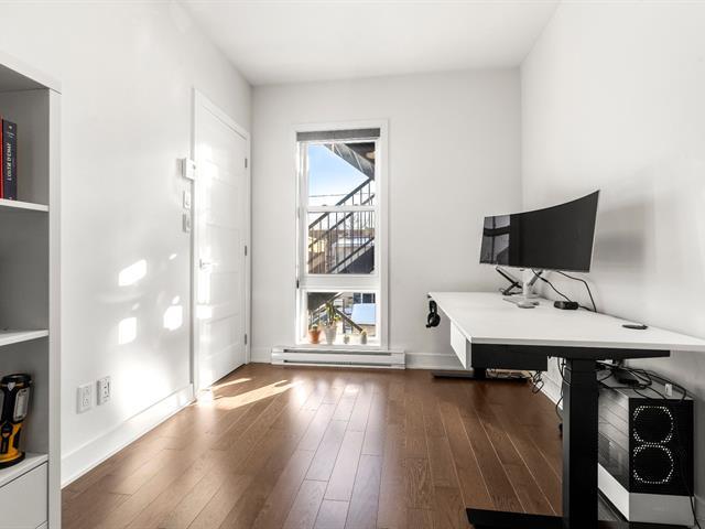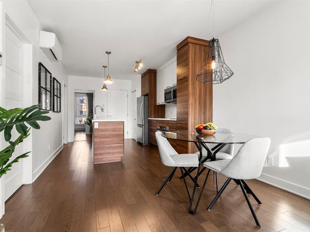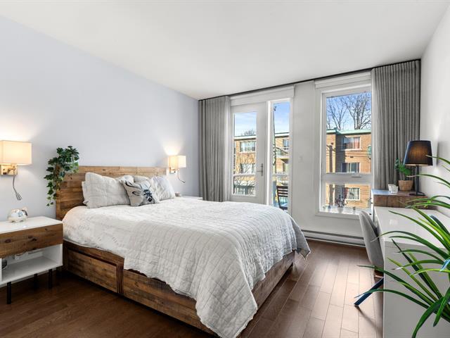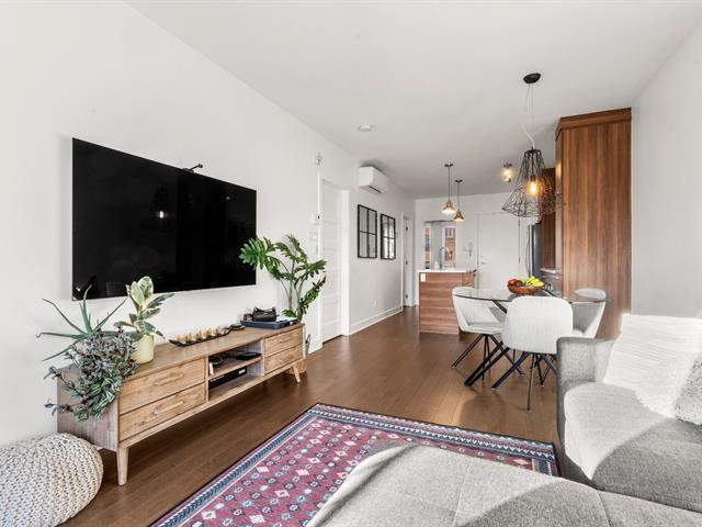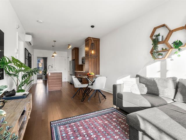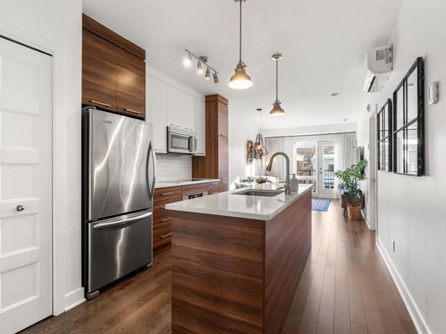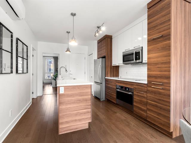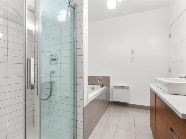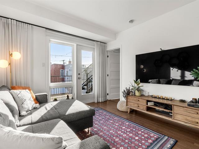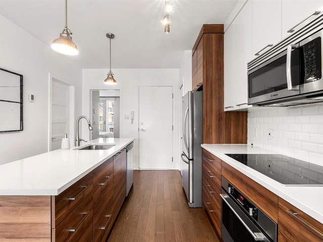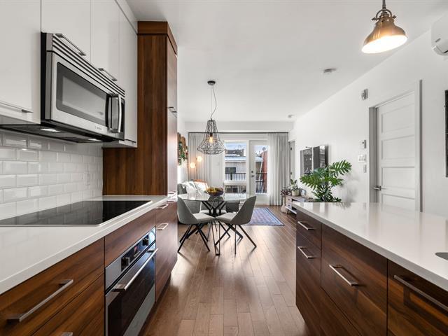 Rare opportunity! Stunning ultra-modern condo located in a highly sought-after area of Montreal, featuring exceptional natural light thanks to large windows at both the front and rear and a beautiful open-concept layout ideal for entertaining. Spacious kitchen with quartz countertops, generous primary bedroom with large walk-in closet and private balcony, versatile second bedroom, and a modern bathroom with separate glass shower and bathtub. Enjoy a large rear terrace as well as a shared rooftop terrace with spectacular city views. Outdoor parking included. (54625167)