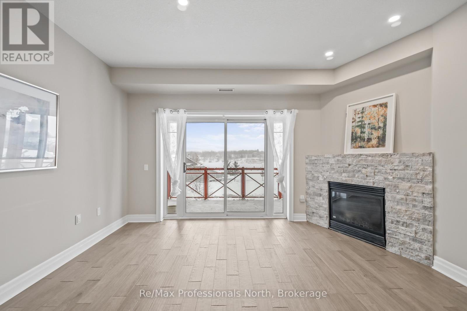 Experience lakeside living at its finest in this bright, open-concept condo overlooking Lake Muskoka! This stunning 4th floor lakeview condo at Muskoka Wharf has 1,278 sqft. 2 Bedrooms, 2 Bathrooms, 1 covered carport parking space with storage locker and has received many recent upgrades. The spacious living, dining, and kitchen areas flows seamlessly, with sliding doors opening to a covered terrace for breathtaking lake views and a bonus natural gas BBQ hookup for entertaining. The living room features a cozy gas fireplace cladded in stone, while the updated kitchen boasts stainless steel appliances, stone countertops, ample cabinet space, and an island perfect for meal prep and casual seating. Thoughtfully designed with privacy in mind, the condo is separated into 2 wings: a primary suite and a guest wing. The primary suite offers lake views, a large walk-in closet, and a luxurious 3-piece ensuite with oversized vanity and tiled shower. The guest bedroom is spacious with beautiful lake views as well and ensuite privileges with the 4 Piece main bathroom. A large laundry room with additional storage completed the functional floorplan. Hardwood floors throughout enhance the bright, clean aesthetic. Enjoy all the Muskoka Wharf has to offer, from boat show, dockside festivals, farmers' markets, Ribfest, and fireworks to nearby restaurants, museums, and shops-all just steps from your door. One covered parking space with storage unit and all utilities are included with the sale. Condo fees are approximately $1,002/month. This is a premium unit and incredible opportunity to enjoy relaxing, maintenance-free lakeside living without the taxes and maintenance in one of Muskoka's most desirable locations! (42120163)