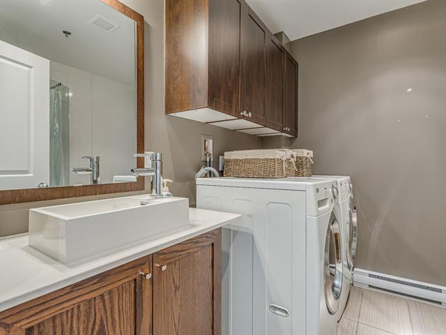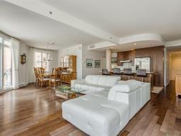 Welcome to Château Barnett II. This bright corner-unit condo offers an open-concept layout with a spacious kitchen and large island overlooking the living and dining areas, complete with a cozy gas fireplace. Enjoy a private balcony with serene green views. The primary suite features a walk-in closet and ensuite bath, plus a second bedroom ideal for guests or a home office. One of the select units offering central air conditioning, two full bathrooms and includes indoor parking and a locker. Secure, well-managed building with superb amenities including a gym, sauna, and more. (46187355)