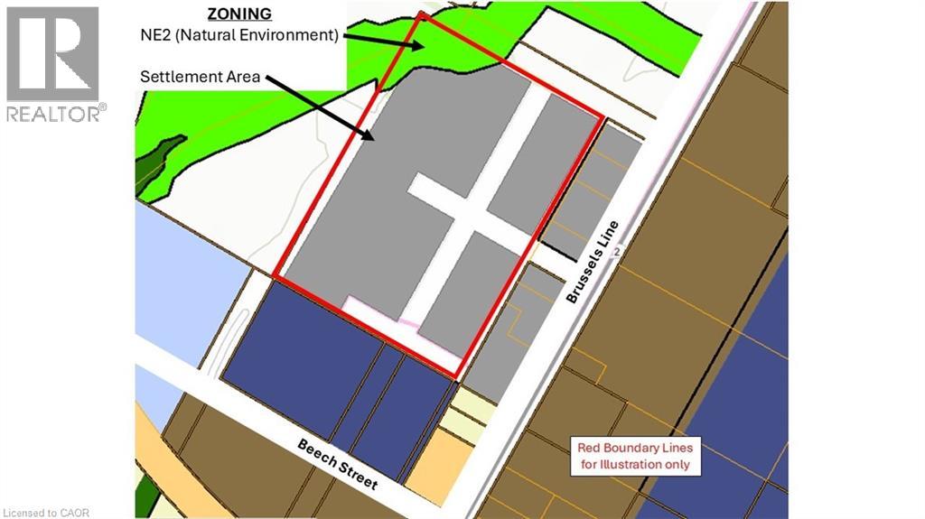 Sizeable 11.5 acre industrial property just off Brussels Line in busy Brussels ON. Services available at highway. Zoned DNE2 (Settlement Area with small Natural Environment piece). Can be purchased separately or together with adjoining parcel to the South (MLS# 40803935). (70149699)