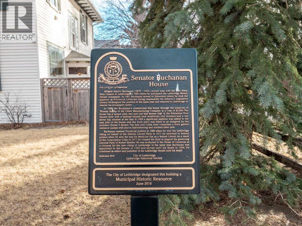 Welcome to a RARE piece of Lethbridge history - the Senator Buchanan House, an elegant Edwardian era residence built in 1908 and rich with original architectural character. This distinguished home stands as a testament to early 20th century craftsmanship and heritage charm. Step inside to discover spacious principal rooms with original details including crafted wood trim and paneling, hardwood floors, as well as arched openings and doors. The main level is ideal for entertaining, gracious with space, while the second floor offers generous bedroom sizes and the flexibility to turn the study and attic into 2 more bedrooms. The backyard offers tons of space as well as an extra long single detached garage with alley access. Whether you're a historical enthusiast or a family seeking a unique legacy home this home blends historic charm with exciting potential! (31632110)