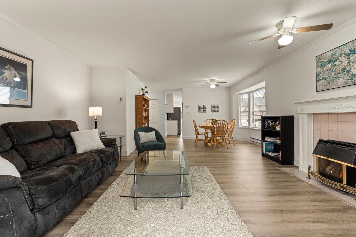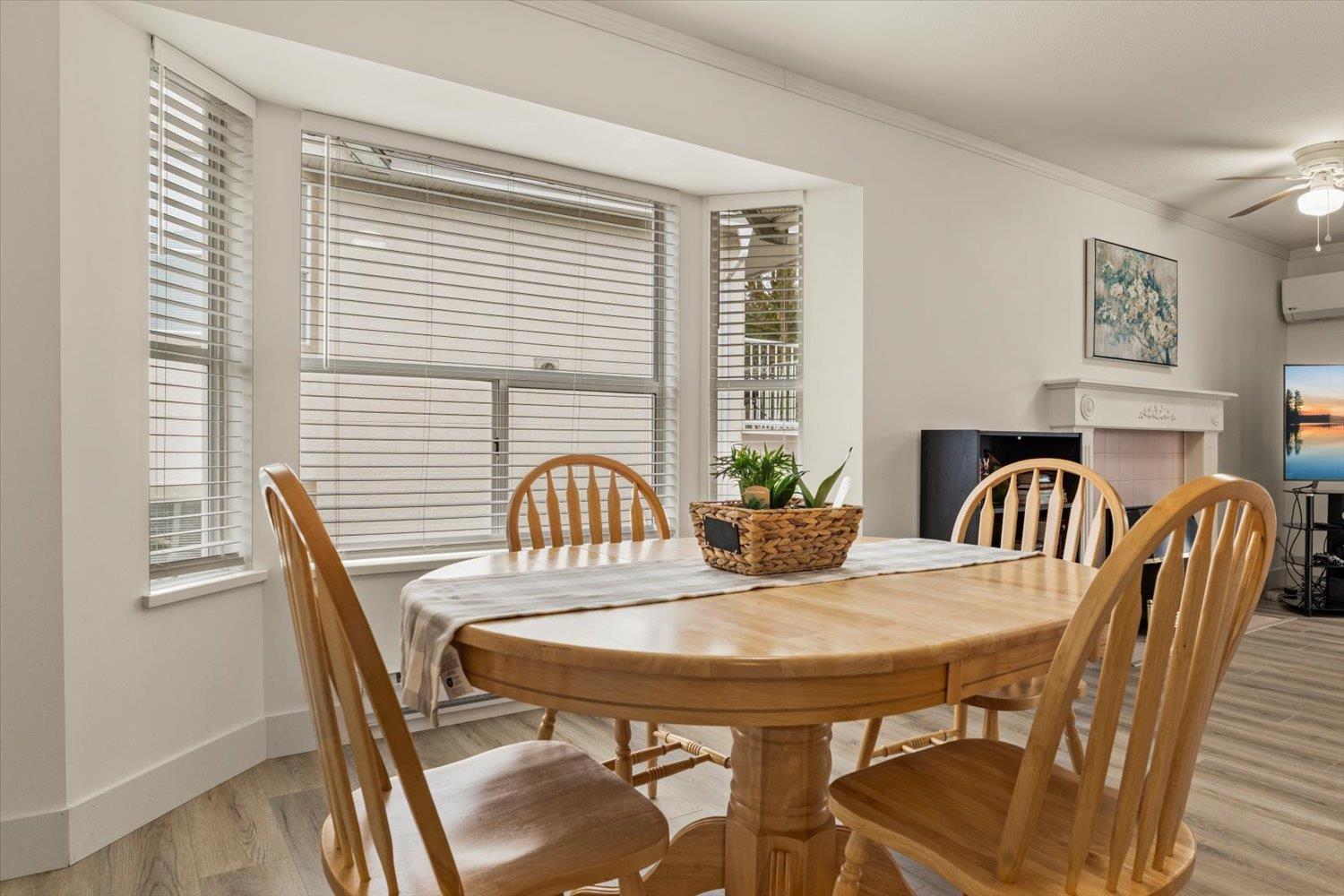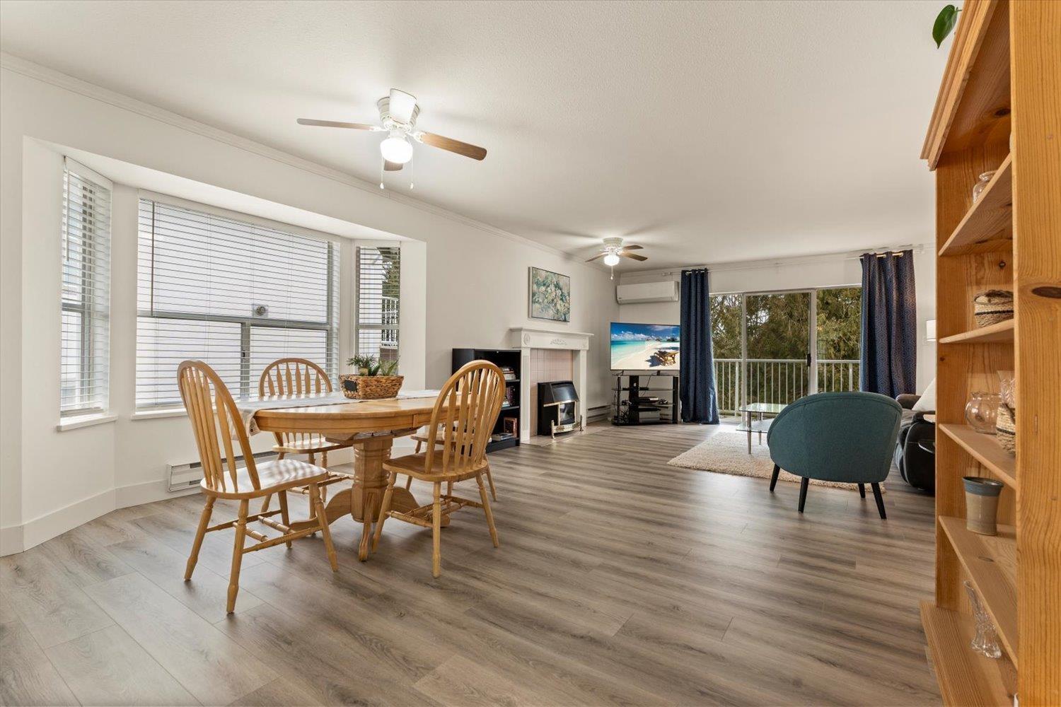 Welcome to Forest Edge! A quiet 55+ community backing onto parkland. This upper floor unit shows like new! Spacious & bright with 2 bedrooms/2 full bathrooms, gas fireplace, air conditioning, open layout living/dining area plus kitchen nook. Large primary bedroom with beautiful full ensuite. Thoughtfully updated for low-maintenance living. Updates include: flooring, baseboards/controls, appliances, heat pump with two mini-splits, updated lighting, ceiling fans, and refreshed bathrooms. Enjoy morning sun from the large east-facing balcony with forest views. Rentals allowed, one cat or dog permitted (14" at shoulders), two parking stalls (one covered). Close to shopping, parks, and recreation. Must be seen to be appreciated. Nothing to do here, but move in and enjoy! Book a showing today! (32435817)