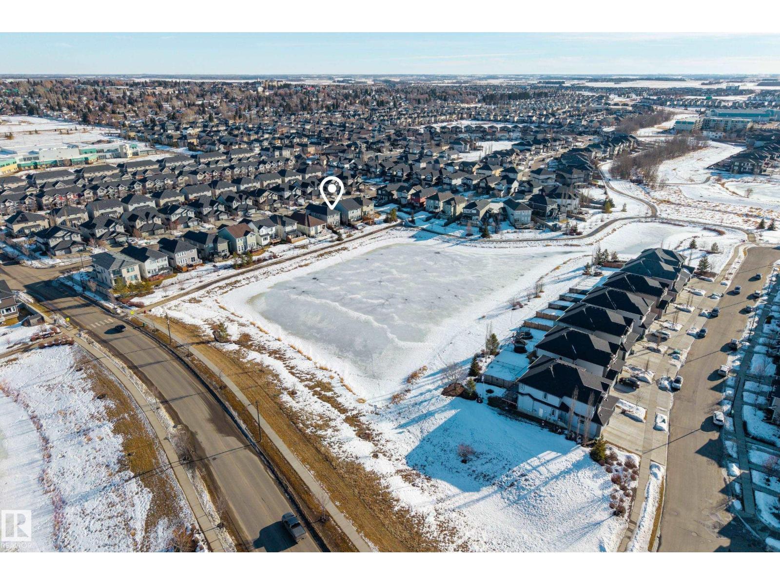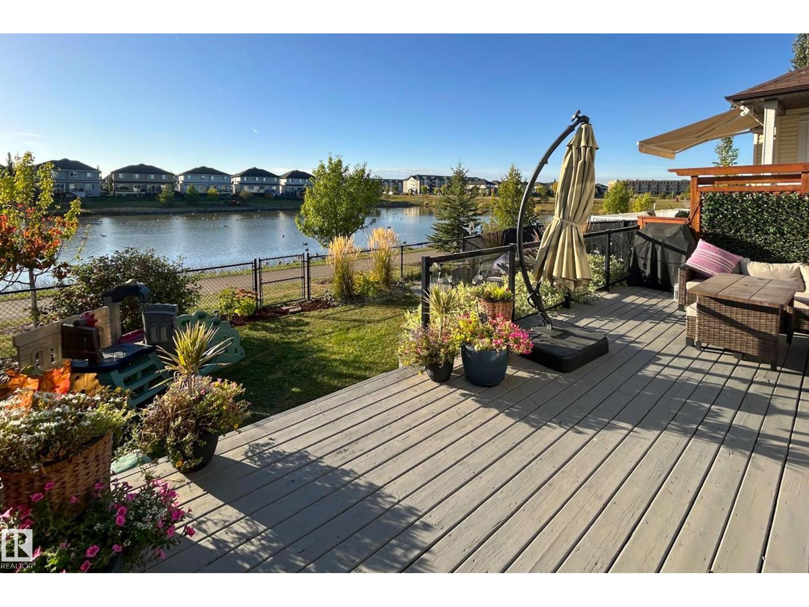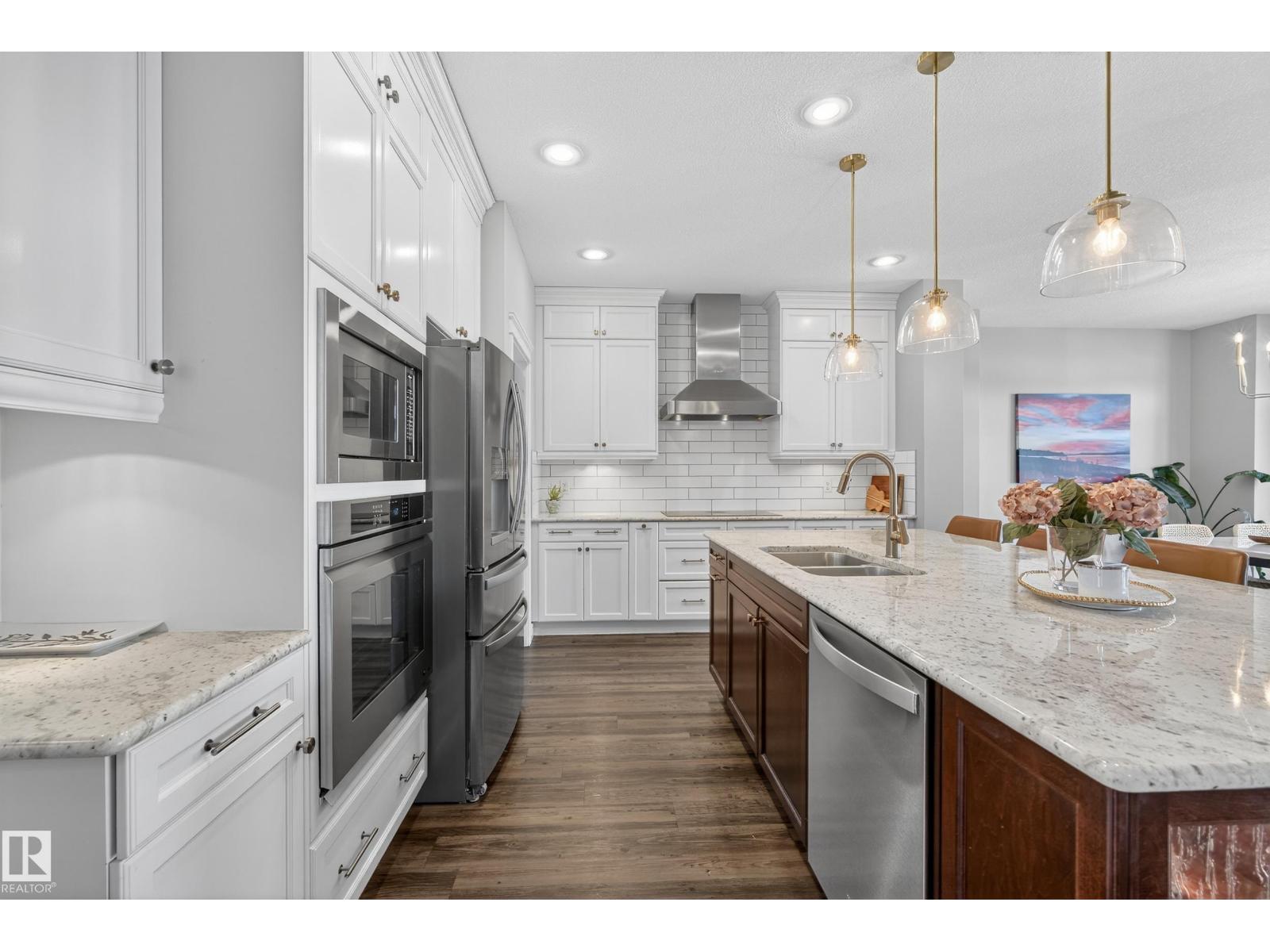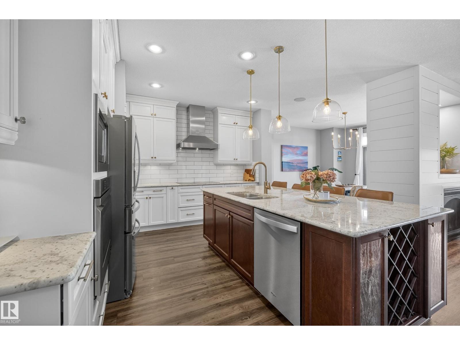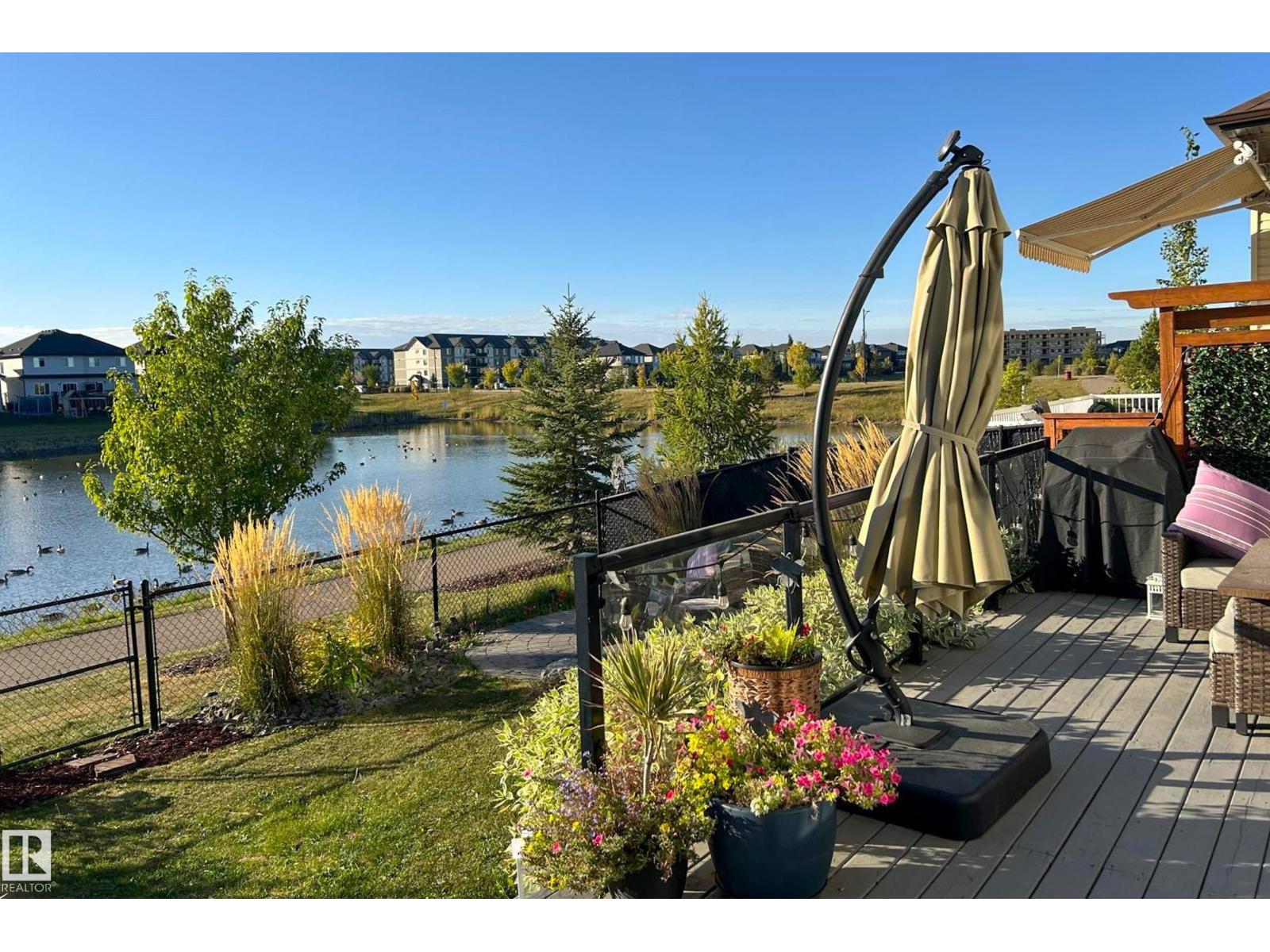 Enjoy stunning pond views and breathtaking west-facing sunsets from the spacious back deck of this beautifully designed home. Built by Pacesetter, it features a unique layout with two elegant double-sided fireplaces that add warmth and character to the main living areas. The bright open-concept design showcases oversized windows and luxury vinyl plank flooring. The chef-inspired kitchen is perfect for entertaining, complete with a large granite island, built-in wall oven, professional hood fan, full-height cabinetry, and classic white subway tile backsplash. Upstairs offers generous bedrooms with walk-in closets, a vaulted bonus room, convenient laundry, and a luxurious primary suite with spa-style ensuite, deep soaker tub, separate shower, heated towel rack, and its own two-way fireplace. The fully finished basement adds valuable living space with a bedroom, full bath, and spacious rec room. Oversized heated double attached garage. Close to pond trails, parks, amenities, and just steps to the K-9 school. (33822395)