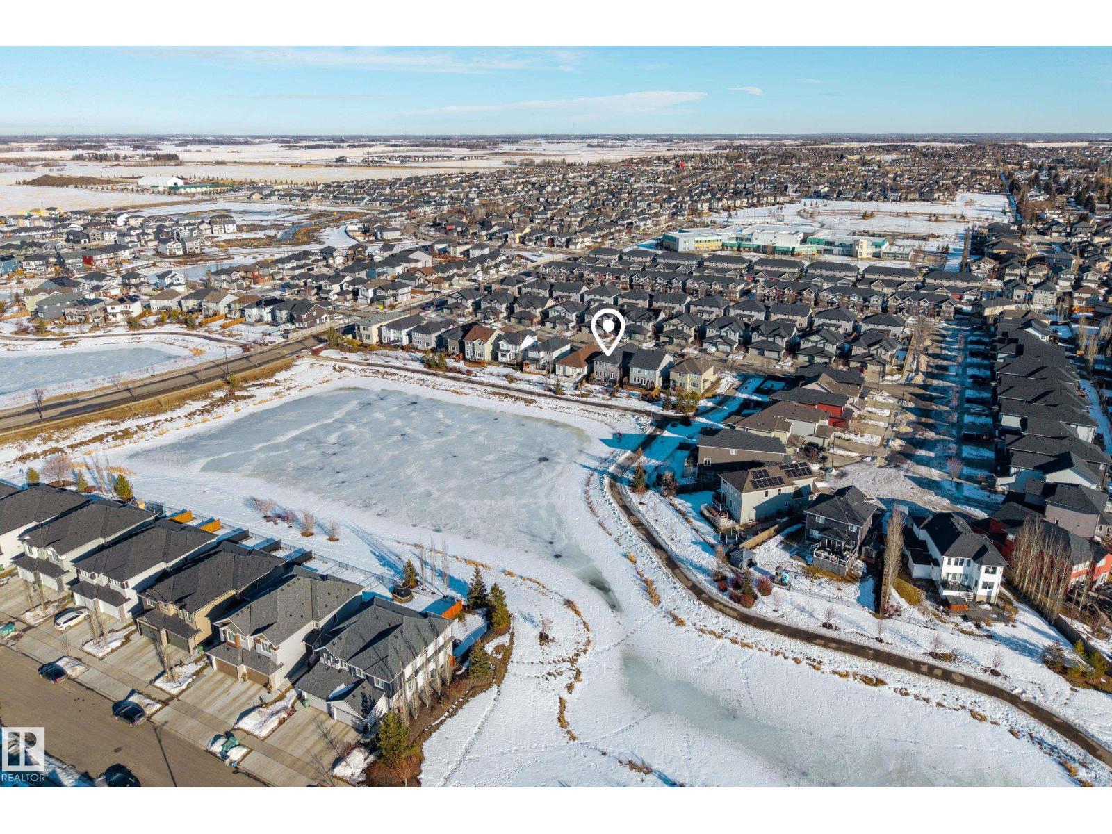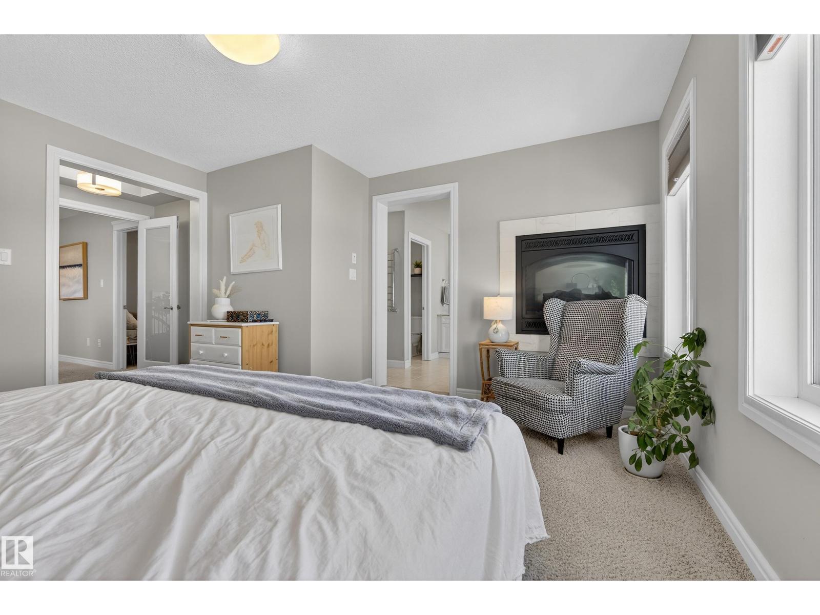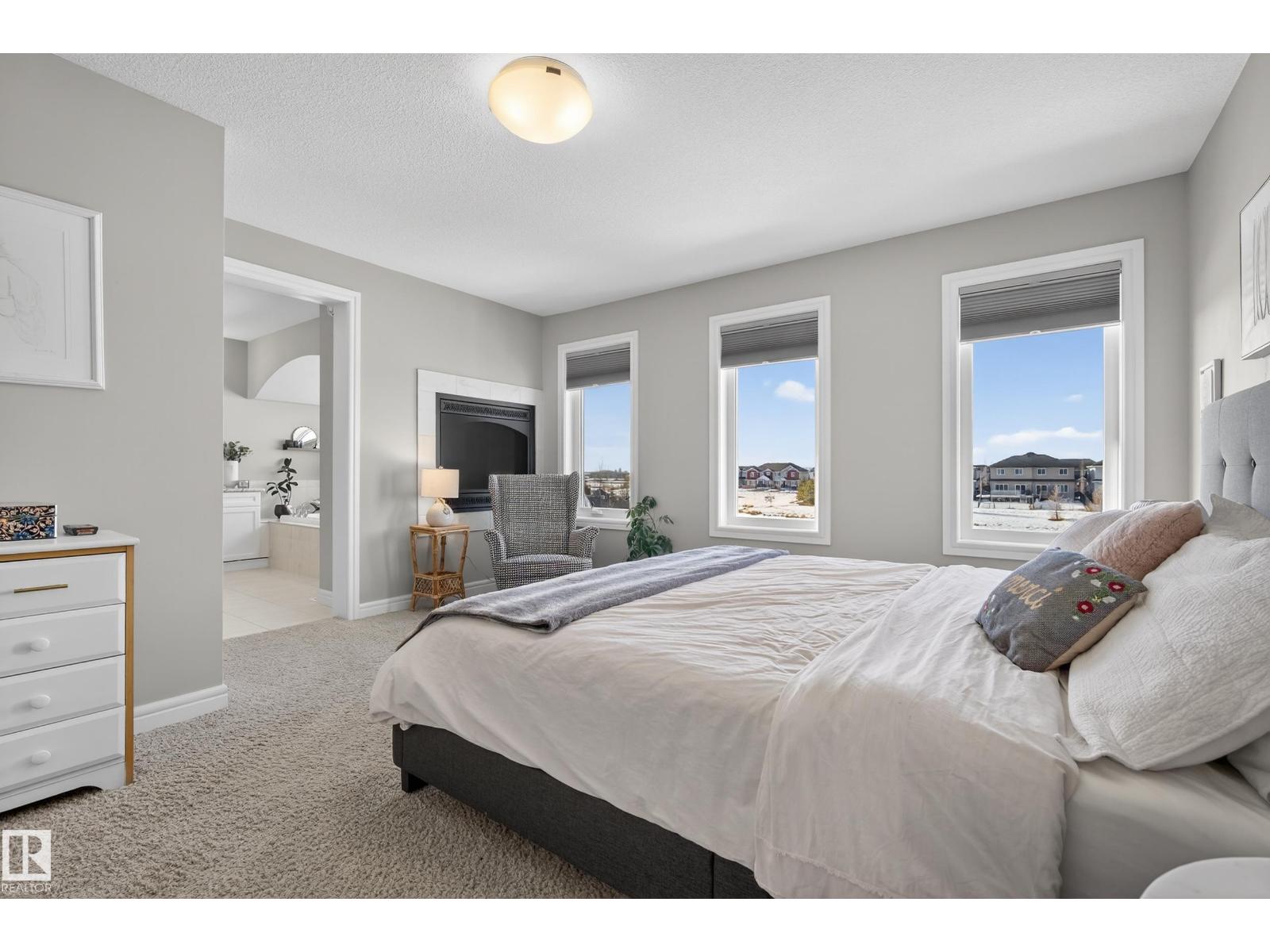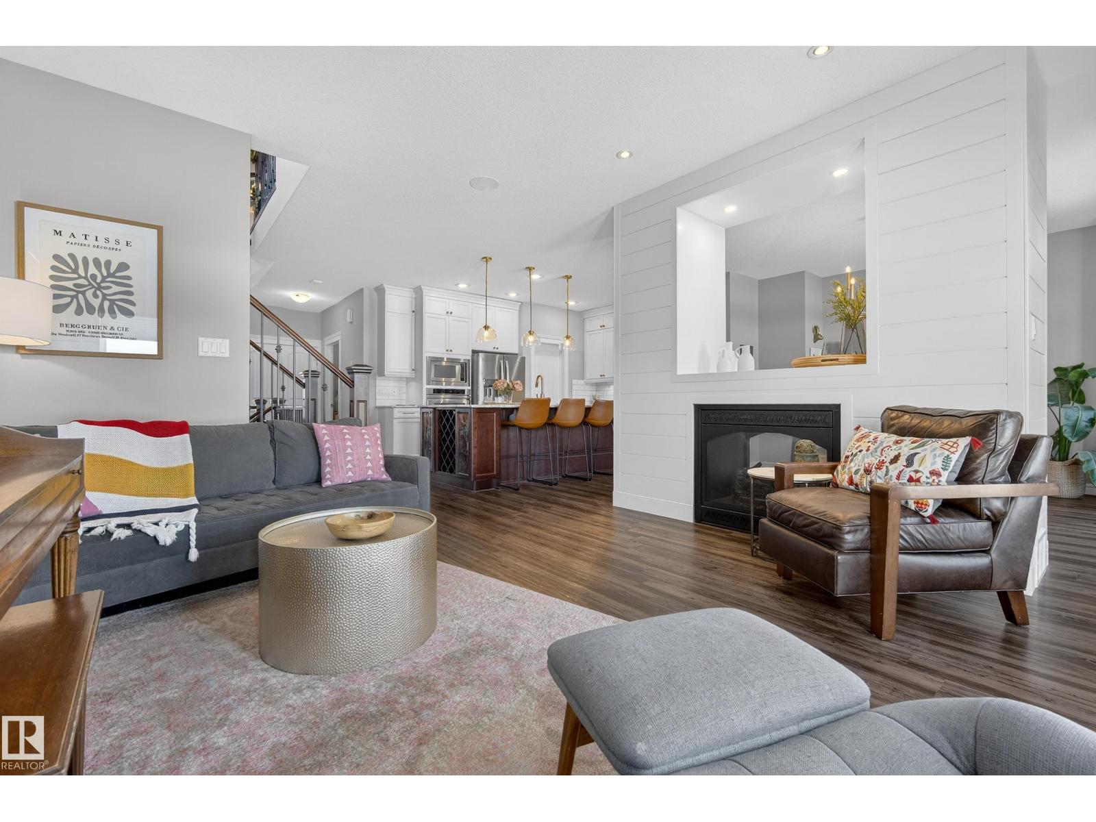 Enjoy stunning pond views and breathtaking west-facing sunsets from the spacious back deck of this beautifully designed home. Built by Pacesetter, it features a unique layout with two elegant double-sided fireplaces that add warmth and character to the main living areas. The bright open-concept design showcases oversized windows and luxury vinyl plank flooring. The chef-inspired kitchen is perfect for entertaining, complete with a large granite island, built-in wall oven, professional hood fan, full-height cabinetry, and classic white subway tile backsplash. Upstairs offers generous bedrooms with walk-in closets, a vaulted bonus room, convenient laundry, and a luxurious primary suite with spa-style ensuite, deep soaker tub, separate shower, heated towel rack, and its own two-way fireplace. The fully finished basement adds valuable living space with a bedroom, full bath, and spacious rec room. Oversized heated double attached garage. Close to pond trails, parks, amenities, and just steps to the K-9 school. (33822395)