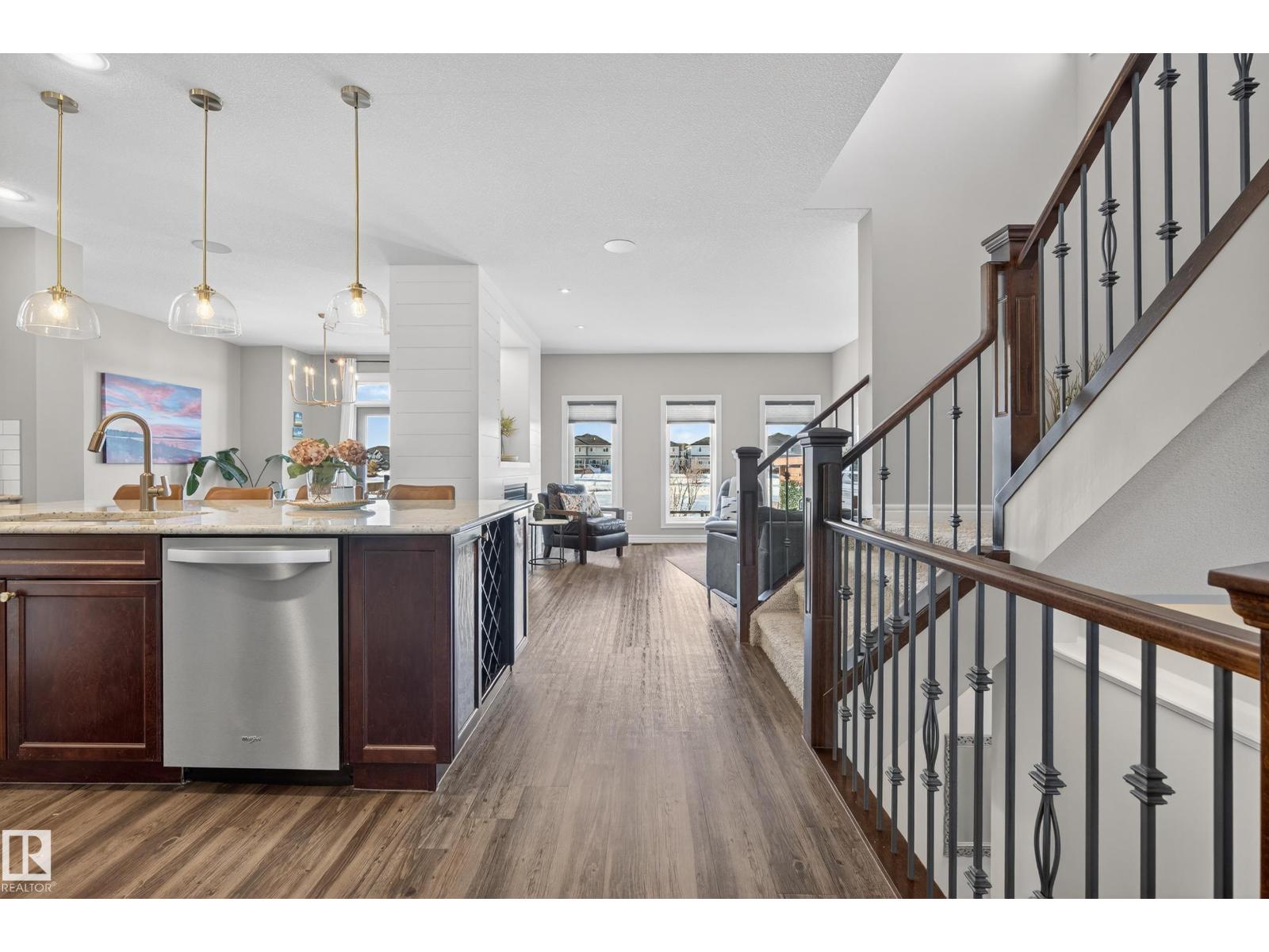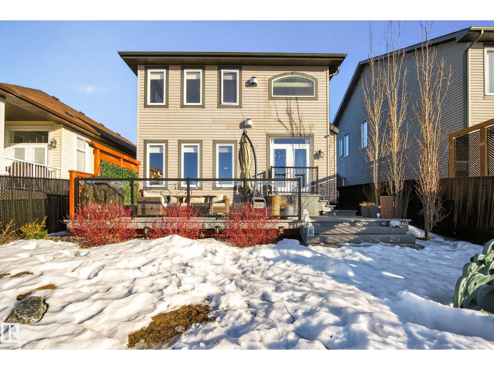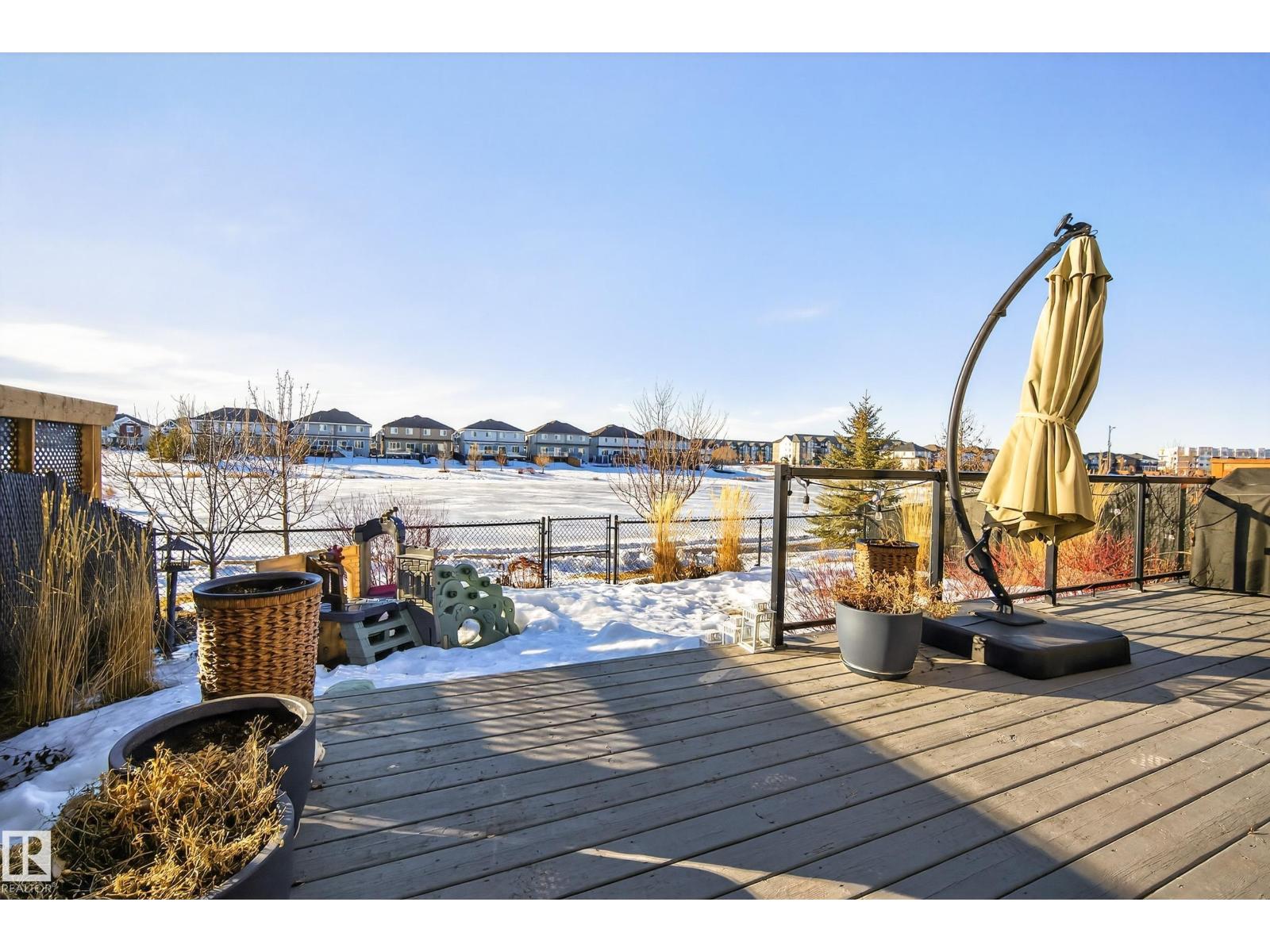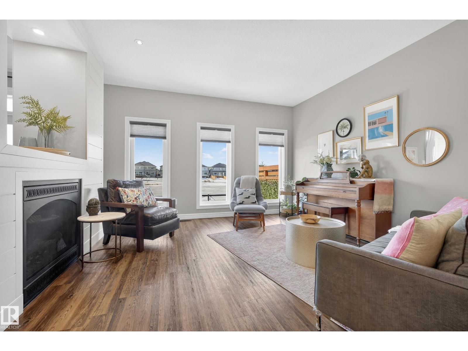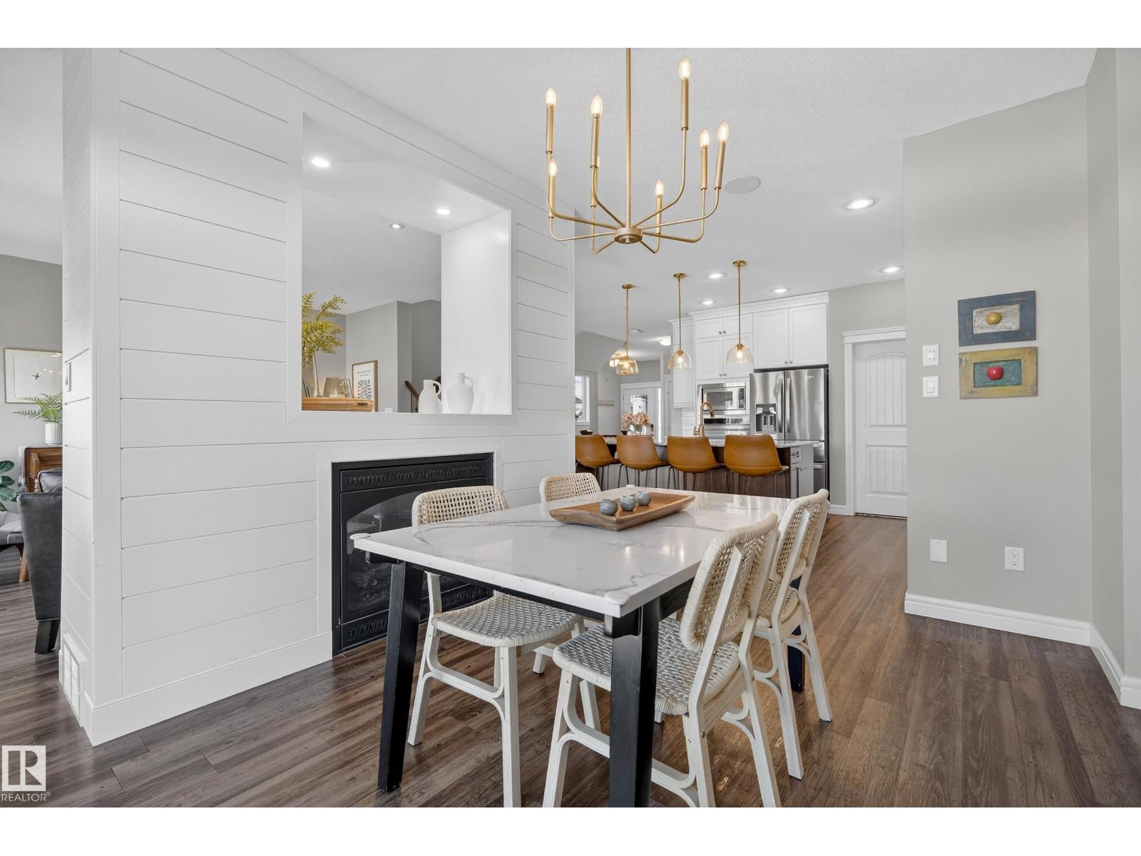 Enjoy stunning pond views and breathtaking west-facing sunsets from the spacious back deck of this beautifully designed home. Built by Pacesetter, it features a unique layout with two elegant double-sided fireplaces that add warmth and character to the main living areas. The bright open-concept design showcases oversized windows and luxury vinyl plank flooring. The chef-inspired kitchen is perfect for entertaining, complete with a large granite island, built-in wall oven, professional hood fan, full-height cabinetry, and classic white subway tile backsplash. Upstairs offers generous bedrooms with walk-in closets, a vaulted bonus room, convenient laundry, and a luxurious primary suite with spa-style ensuite, deep soaker tub, separate shower, heated towel rack, and its own two-way fireplace. The fully finished basement adds valuable living space with a bedroom, full bath, and spacious rec room. Oversized heated double attached garage. Close to pond trails, parks, amenities, and just steps to the K-9 school. (33822395)