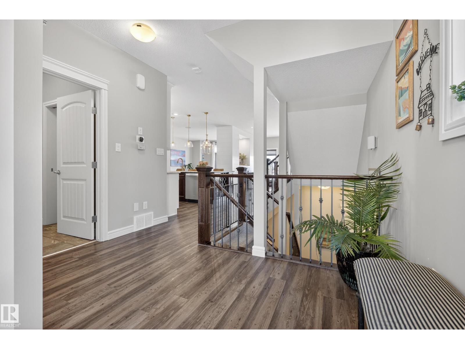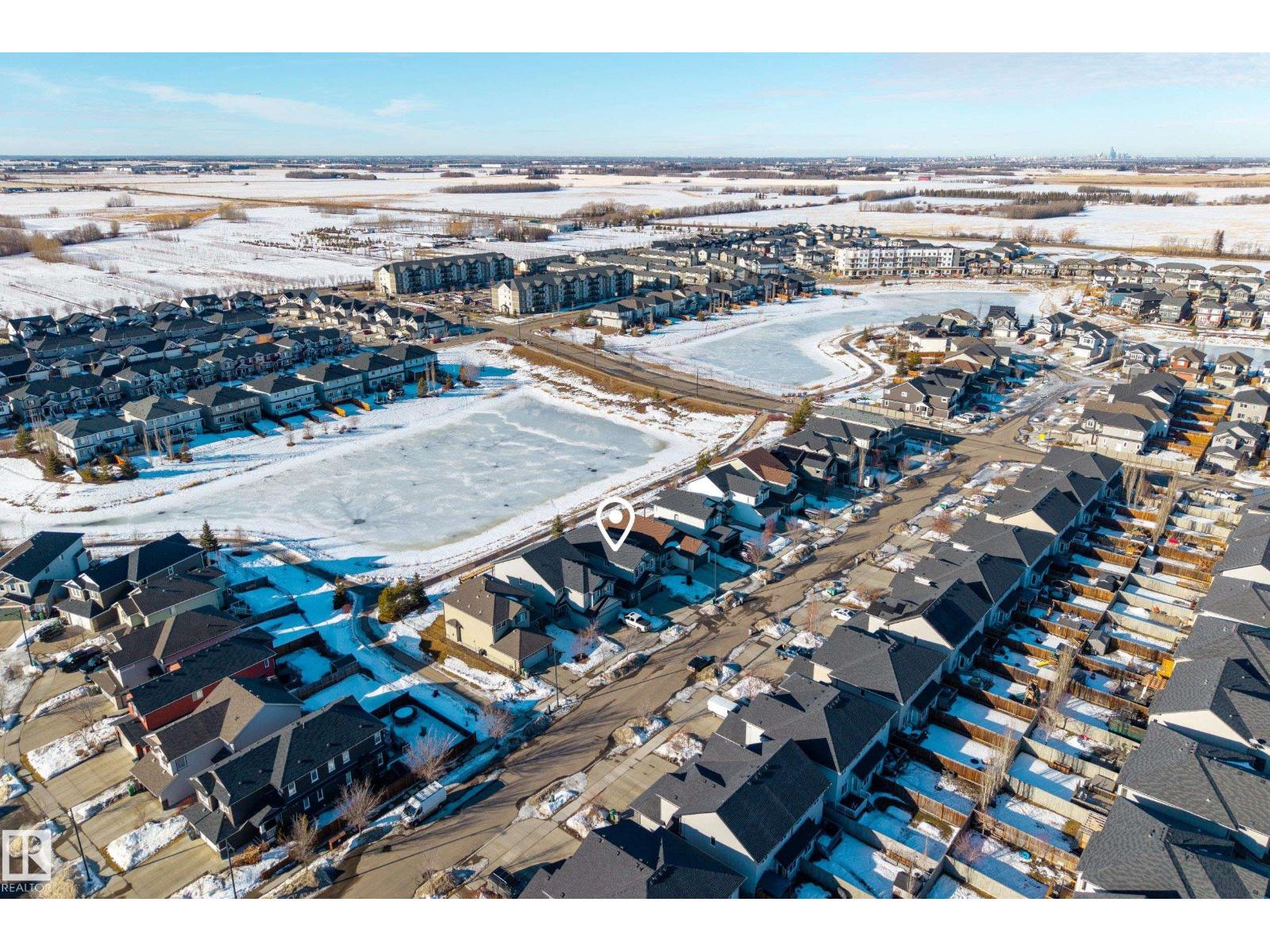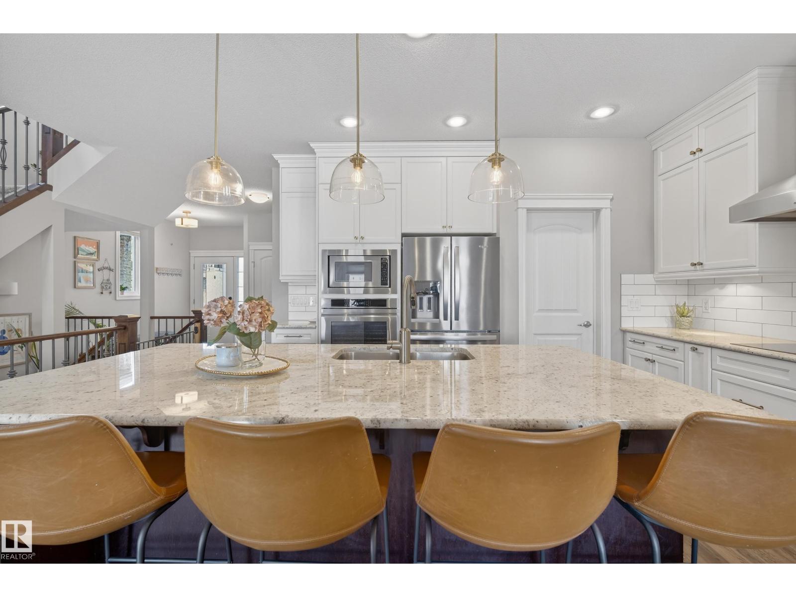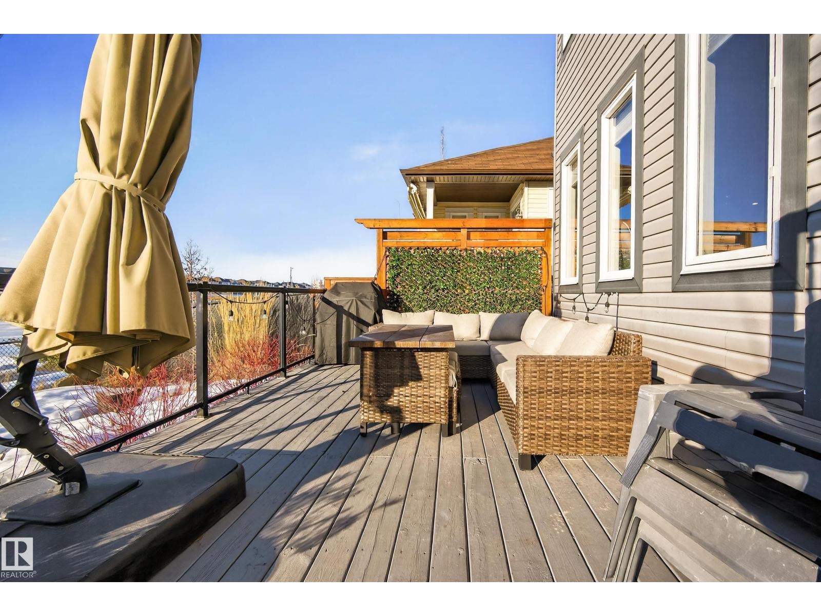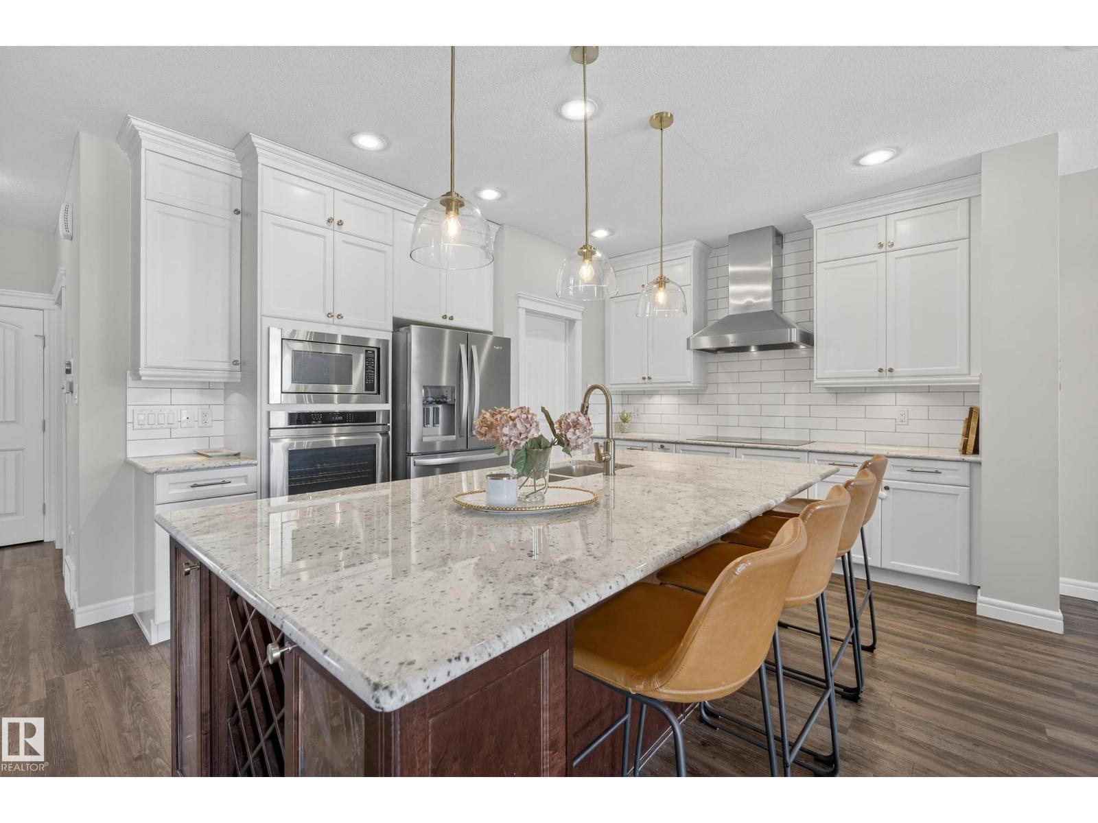 Enjoy stunning pond views and breathtaking west-facing sunsets from the spacious back deck of this beautifully designed home. Built by Pacesetter, it features a unique layout with two elegant double-sided fireplaces that add warmth and character to the main living areas. The bright open-concept design showcases oversized windows and luxury vinyl plank flooring. The chef-inspired kitchen is perfect for entertaining, complete with a large granite island, built-in wall oven, professional hood fan, full-height cabinetry, and classic white subway tile backsplash. Upstairs offers generous bedrooms with walk-in closets, a vaulted bonus room, convenient laundry, and a luxurious primary suite with spa-style ensuite, deep soaker tub, separate shower, heated towel rack, and its own two-way fireplace. The fully finished basement adds valuable living space with a bedroom, full bath, and spacious rec room. Oversized heated double attached garage. Close to pond trails, parks, amenities, and just steps to the K-9 school. (33822395)