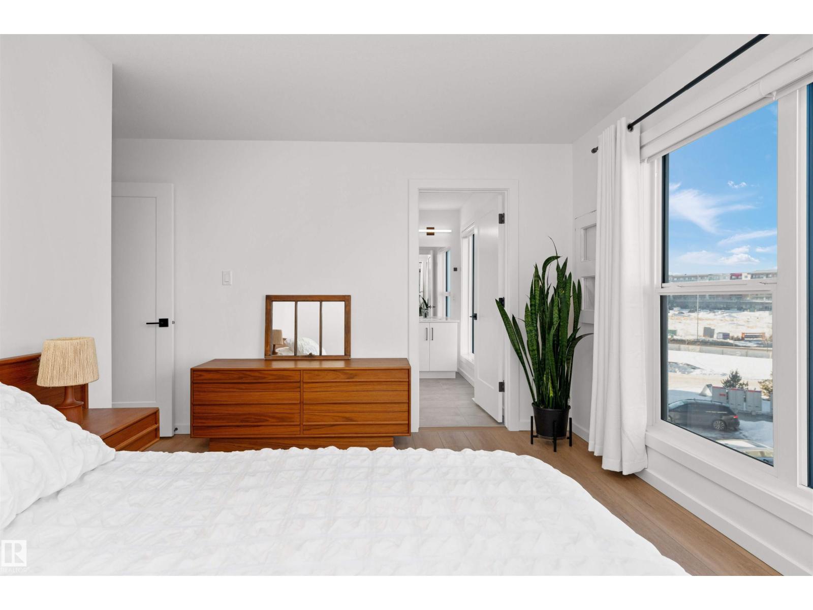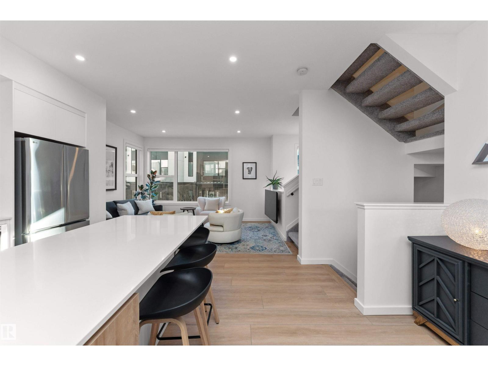 This exceptional end-unit, corner townhome offers 1,775ft2 of contemporary living, thoughtfully designed for those who appreciate elevated finishes, & effortless indoor-outdoor living. With 9ft ceilings & expansive windows, the main level is flooded w/ natural light, creating a sophisticated & inviting atmosphere. At the centre of the home is a chef-inspired kitchen, full-depth custom cabinetry with open shelving, quartz counters, outdoor deck, & upgraded LG Smart appliances. An open-concept layout flows into the dining & living areas, enhanced by luxury vinyl plank flooring that offers both elegance & durability. The upper level is a private retreat, offering two large bedrooms & upgraded full-size laundry room. The ground floor is a versatile flex space provides the perfect setting for home office or fitness studio. Addt. upgrades include central AC & custom blackout & privacy blinds. With west-facing exposure, the oversized rooftop patio is a true showpiece. Welcome to Midtown, welcome home. (33822906)
