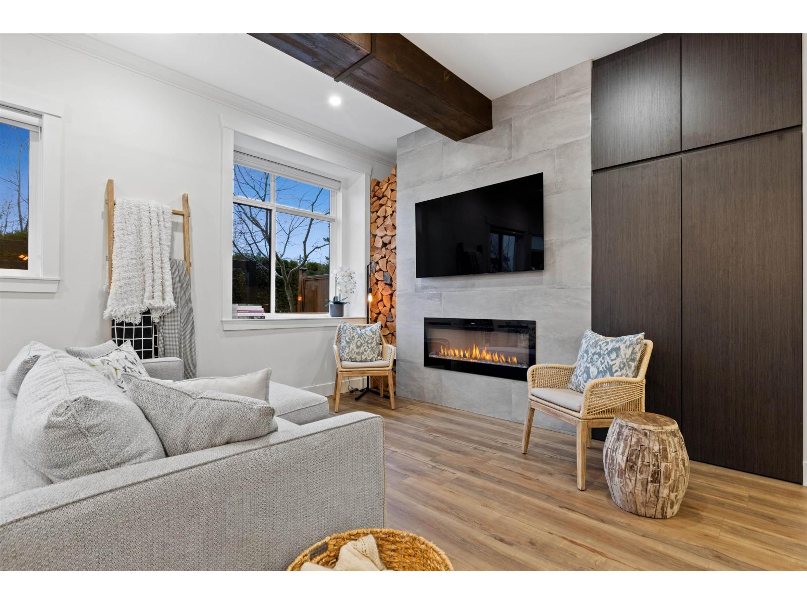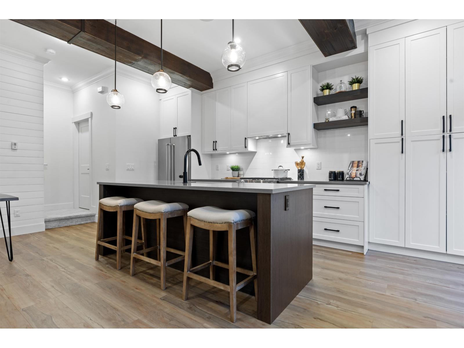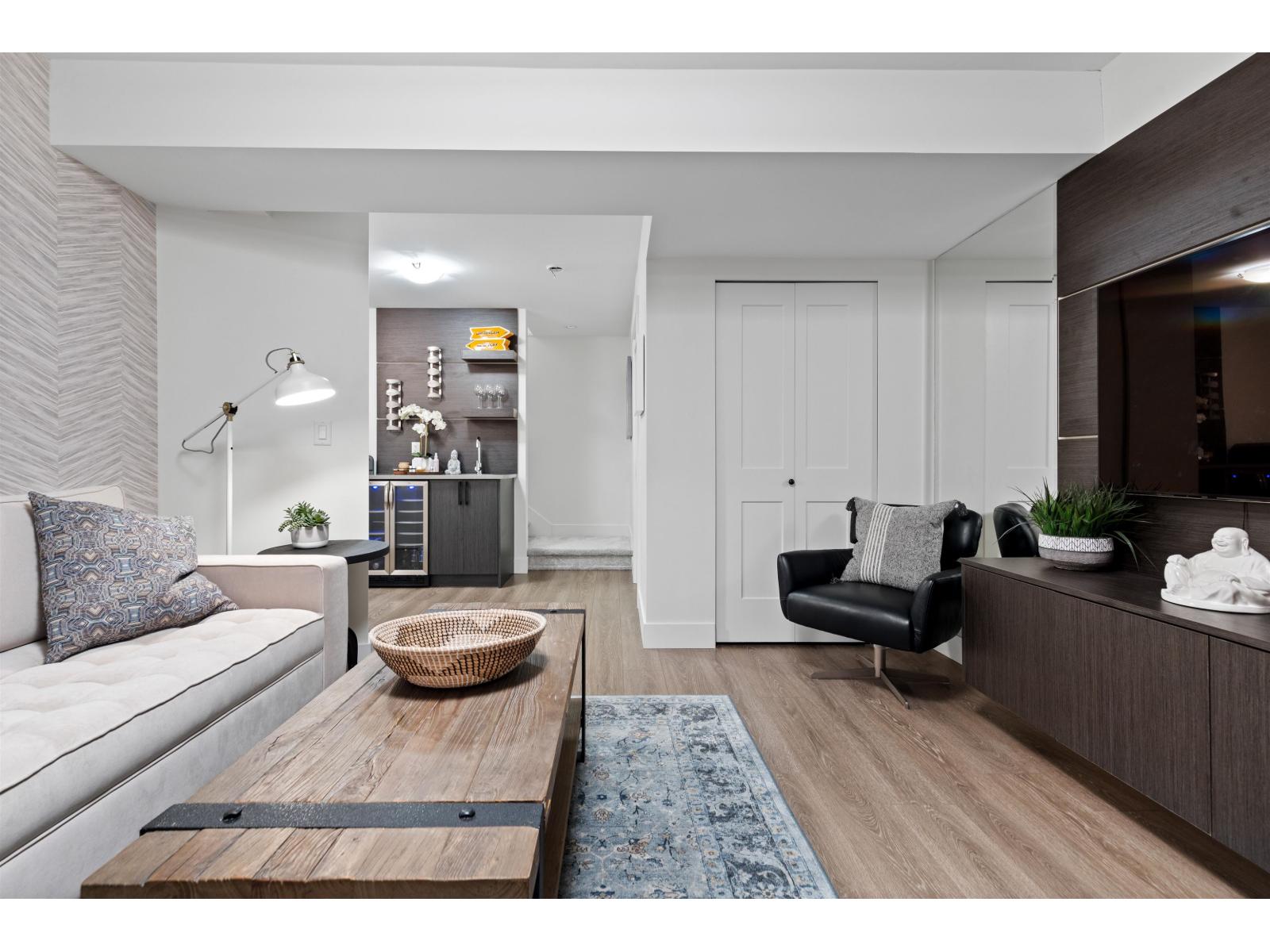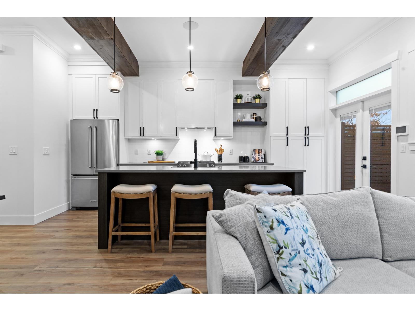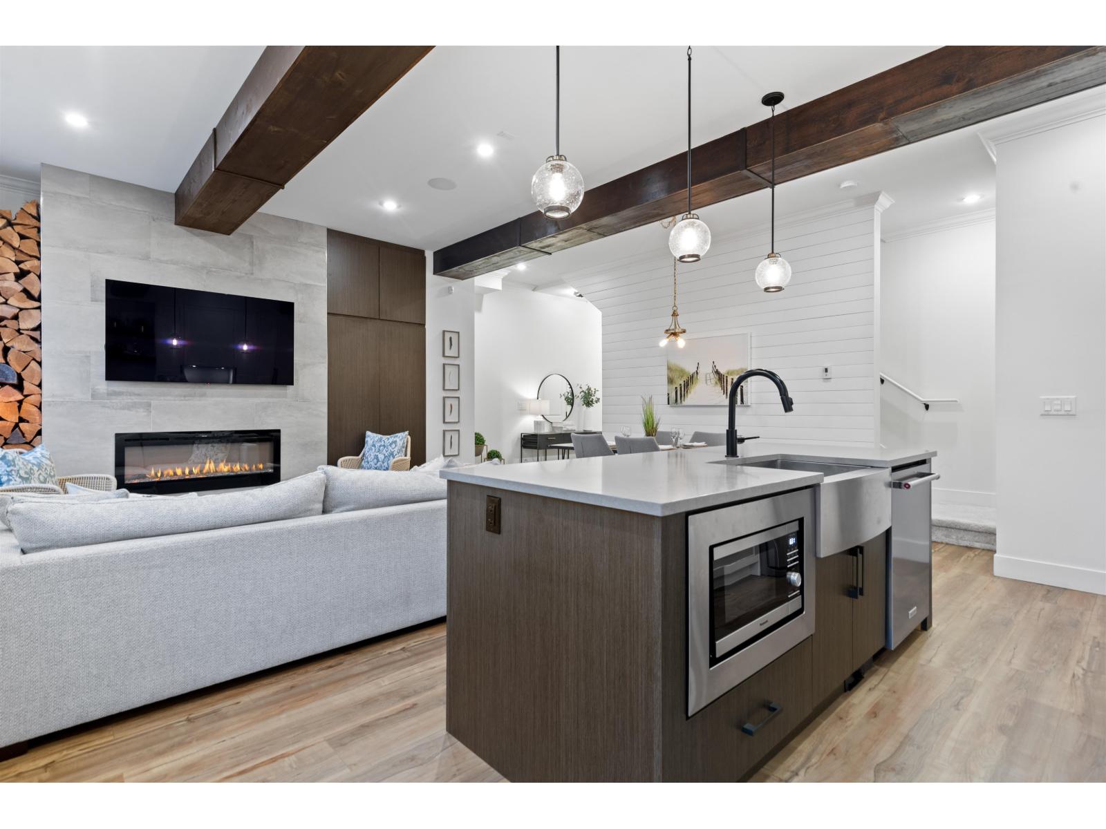 Step into luxury at Marca by Mortise, South Surrey. Former show home, Unit 2 is the former show home w/double wide garage & large driveway for 2 more vehicles. Chalet-inspired design, wood beams, smart home tech, A/C & iControl4 features. Feels like a house w/2300+sqft across 3 levels featuring many built-ins, custom shelving, new laminate flooring throughout, new carpets, newer light fixtures & fresh paint. Main offers white cabinetry, quartz counters, s/s appliances, gas range, island & SW exposure. Upstairs features 3 beds & flex, incl oversized primary w/w-i closet & ensuite w/double sinks. Downstairs includes large rec room w/custom bar, wine fridge & built-ins, plus 4th bed & storage. Enjoy 2 balconies or fenced yard. (32438913)