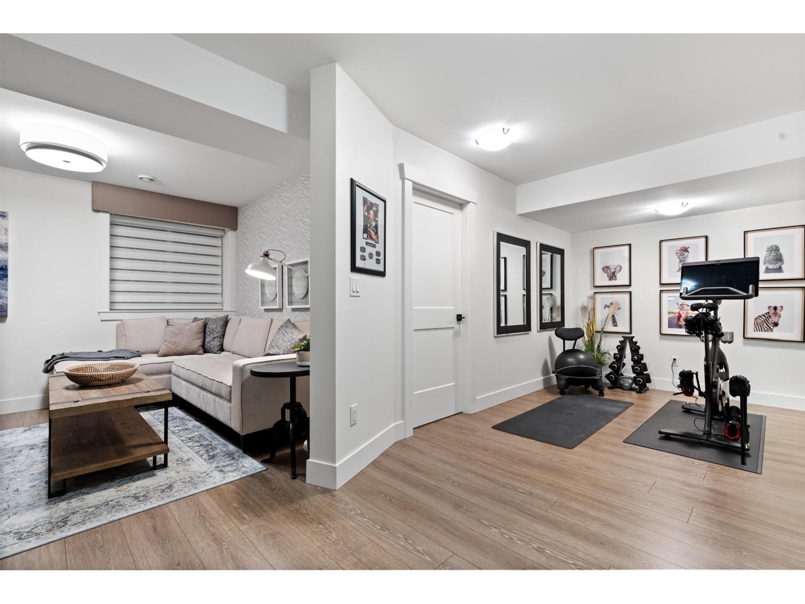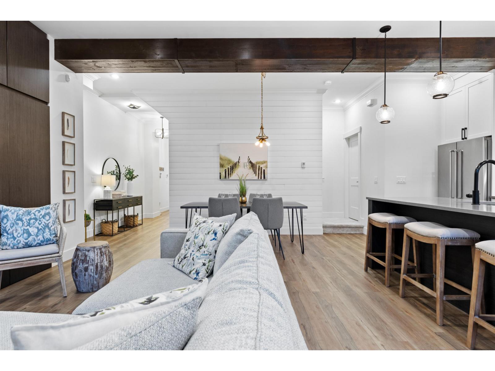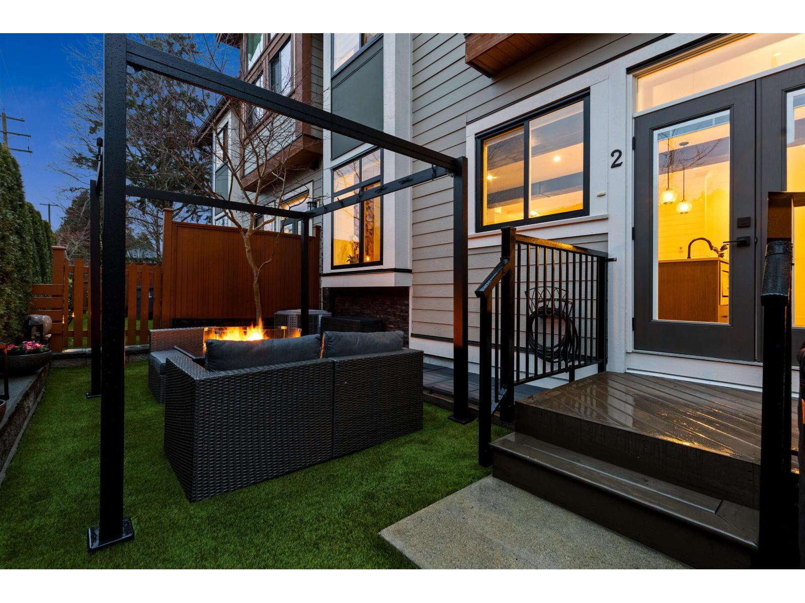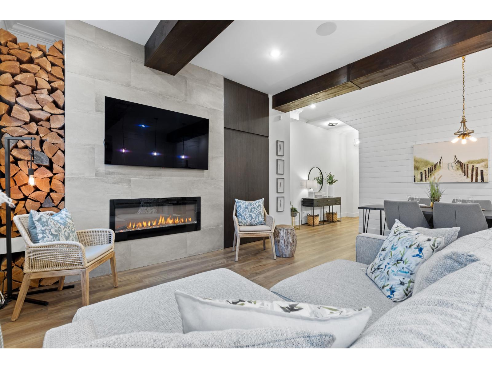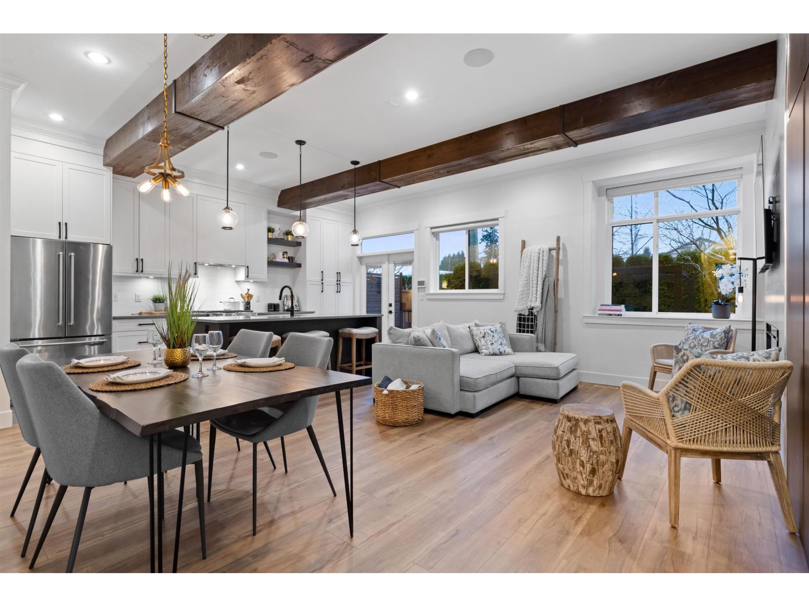 Step into luxury at Marca by Mortise, South Surrey. Former show home, Unit 2 is the former show home w/double wide garage & large driveway for 2 more vehicles. Chalet-inspired design, wood beams, smart home tech, A/C & iControl4 features. Feels like a house w/2300+sqft across 3 levels featuring many built-ins, custom shelving, new laminate flooring throughout, new carpets, newer light fixtures & fresh paint. Main offers white cabinetry, quartz counters, s/s appliances, gas range, island & SW exposure. Upstairs features 3 beds & flex, incl oversized primary w/w-i closet & ensuite w/double sinks. Downstairs includes large rec room w/custom bar, wine fridge & built-ins, plus 4th bed & storage. Enjoy 2 balconies or fenced yard. (32438913)