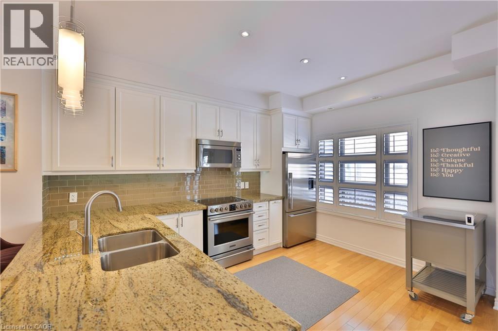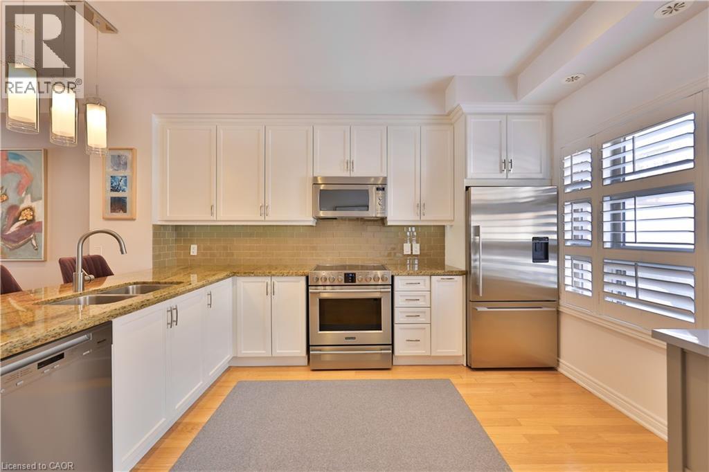 Welcome to this beautifully appointed 3-bedroom, 3-bath executive townhome in sought-after Joshua Creek, perfectly positioned in a premium location within the complex facing private parkland and green space. This light-filled home is bright and airy with an open-concept main level featuring 9-foot ceilings, spacious living and dining areas, and an eat-in kitchen (currently configured with a convenient work from home office). Enjoy upgraded granite countertops, stainless steel appliances, hardwood flooring throughout, and a walk-out to the private back deck. Upstairs, the primary suite features a walk-in closet with custom organizers, a 4-piece ensuite, and a walk-out to a private balcony. Two additional bedrooms, a full 4-piece bath, and upper-level laundry for added convenience. The finished lower level offers ample storage and direct walk out access to the updated garage. Enjoy amenities in the nearby condominium building including the indoor pool, fitness, billiards, theatre and party rooms. Ideally located steps to shops, restaurants, and everyday amenities, centrally located with easy access to major highways and situated in an excellent school district. This exceptional home combines style, convenience, and an unbeatable location (70155024)