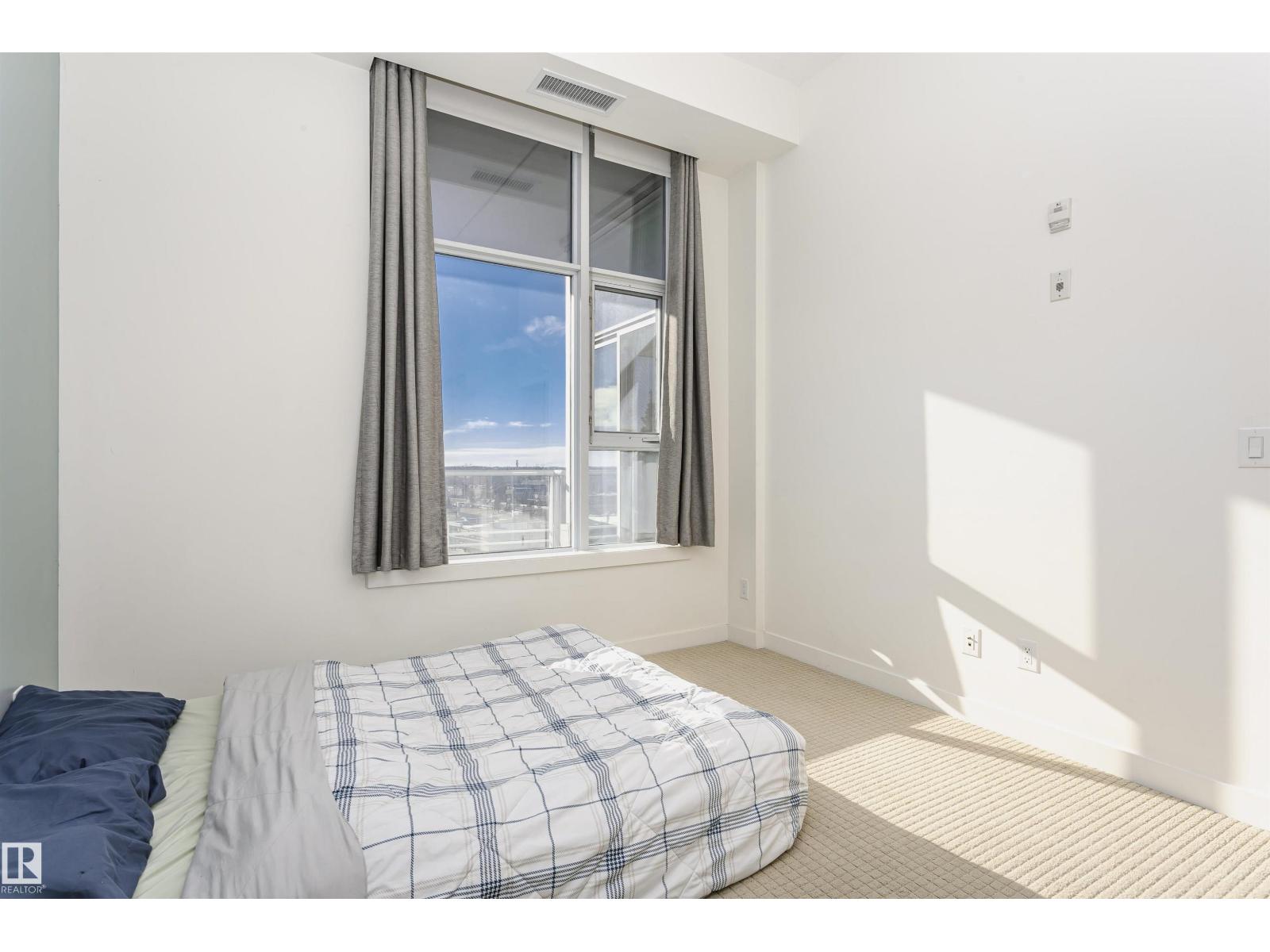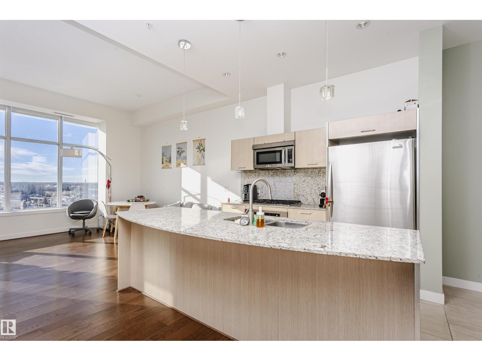 Top-floor, south-facing in sought-after Century Park! Soaring ceilings and expansive windows flood the open-concept layout with natural light, creating a bright and airy atmosphere. Just off the entrance, a versatile flex space offers the perfect spot for a home office, dining area, or reading nook. The modern kitchen showcases granite countertops, a gas stovetop, built-in oven and microwave, plus a large island. The spacious bedroom features dual closets and convenient dual-entry access to the 4-piece ensuite. Relax outdoors on your sunny private balcony with gas BBQ hookup. Complete with titled underground parking, a separate titled storage cage, fitness centre access, and ALL utilities included in the condo fees. Just steps to the LRT, shopping, restaurants, and minutes to major routes. This is urban convenience at its best! (33827385)