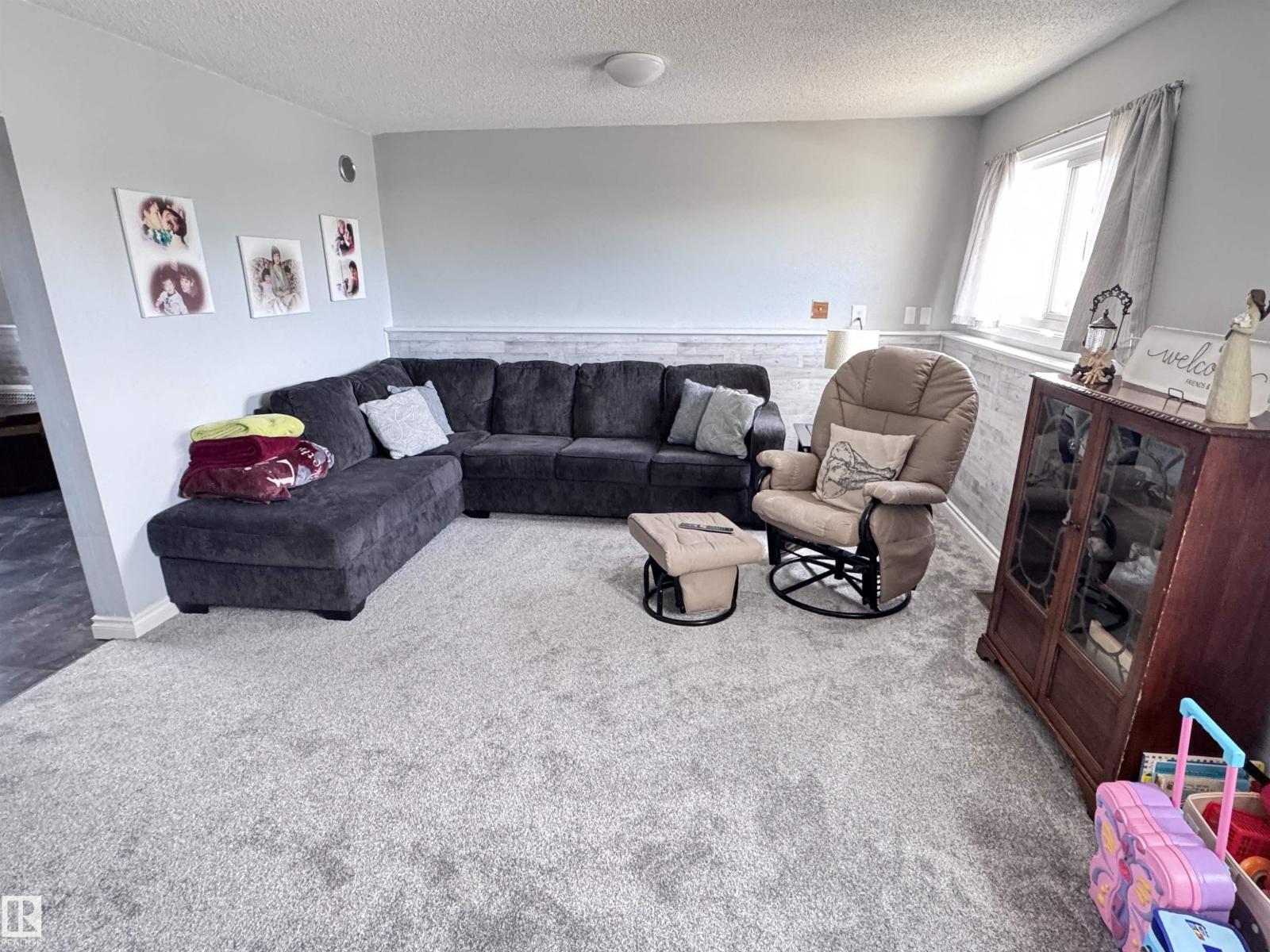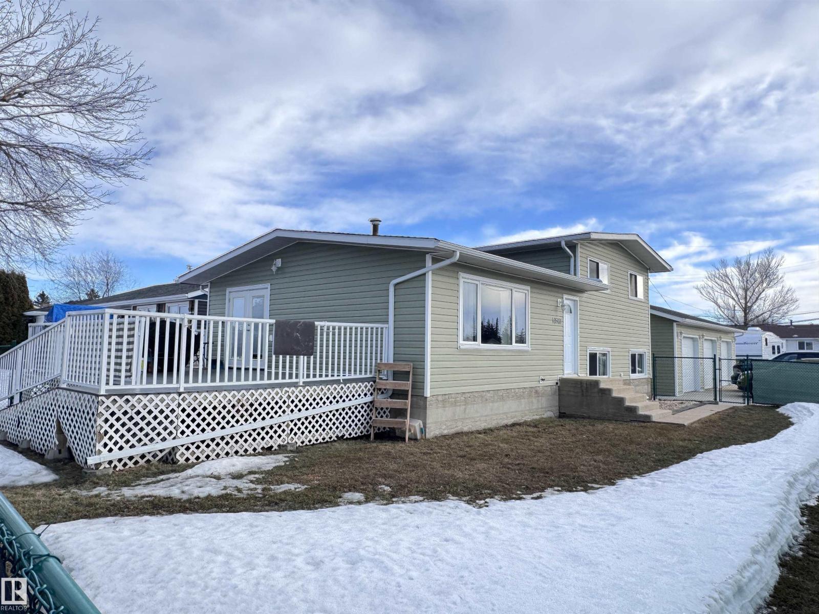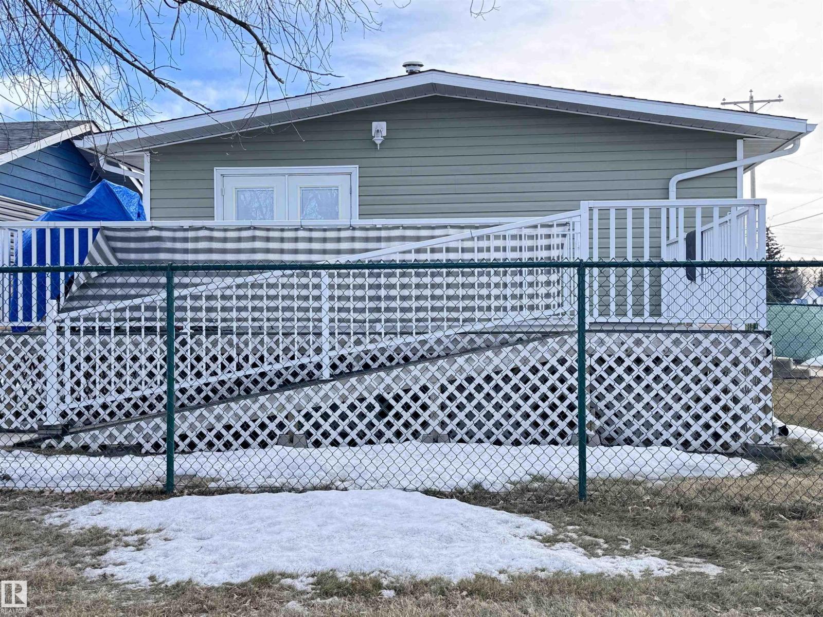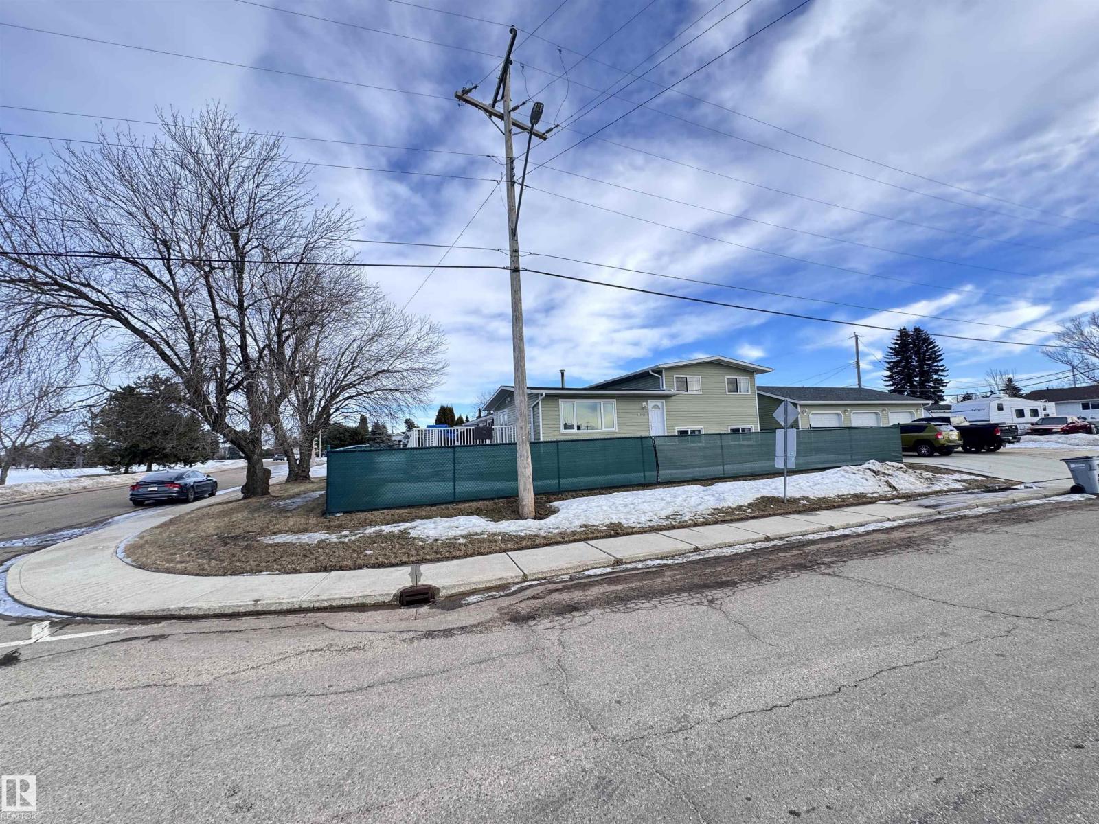 Beautiful family home with a 26×38.5 triple garage, perfectly located right across from Westlock Elementary! Offering over 2,225 sq ft of finished living space, this well-maintained property features a huge rear mudroom leading to a cozy family room, plus a bright main floor with a spacious kitchen, abundant solid oak cabinetry, generous counter space, and dining area with access to the composite deck with aluminum railing. The front living room completes the main level. Upstairs you’ll find a renovated 4-pc bath and three bedrooms, including a primary suite with his-and-hers closets. The basement offers a large rec room, storage, vented cold room, mechanical area, 3-pc bath, and laundry. Outside, enjoy chain-link fencing, a massive patio, and ample parking. With only one neighbor to the east and direct access to school, park, and outdoor rink, this is an ideal family property with exceptional space and storage. Wheel chair ramp is removable if not needed. (33827557)
