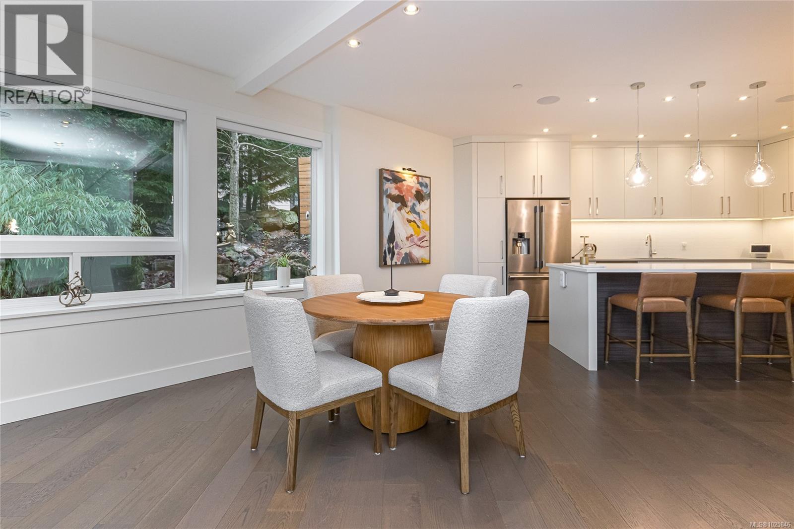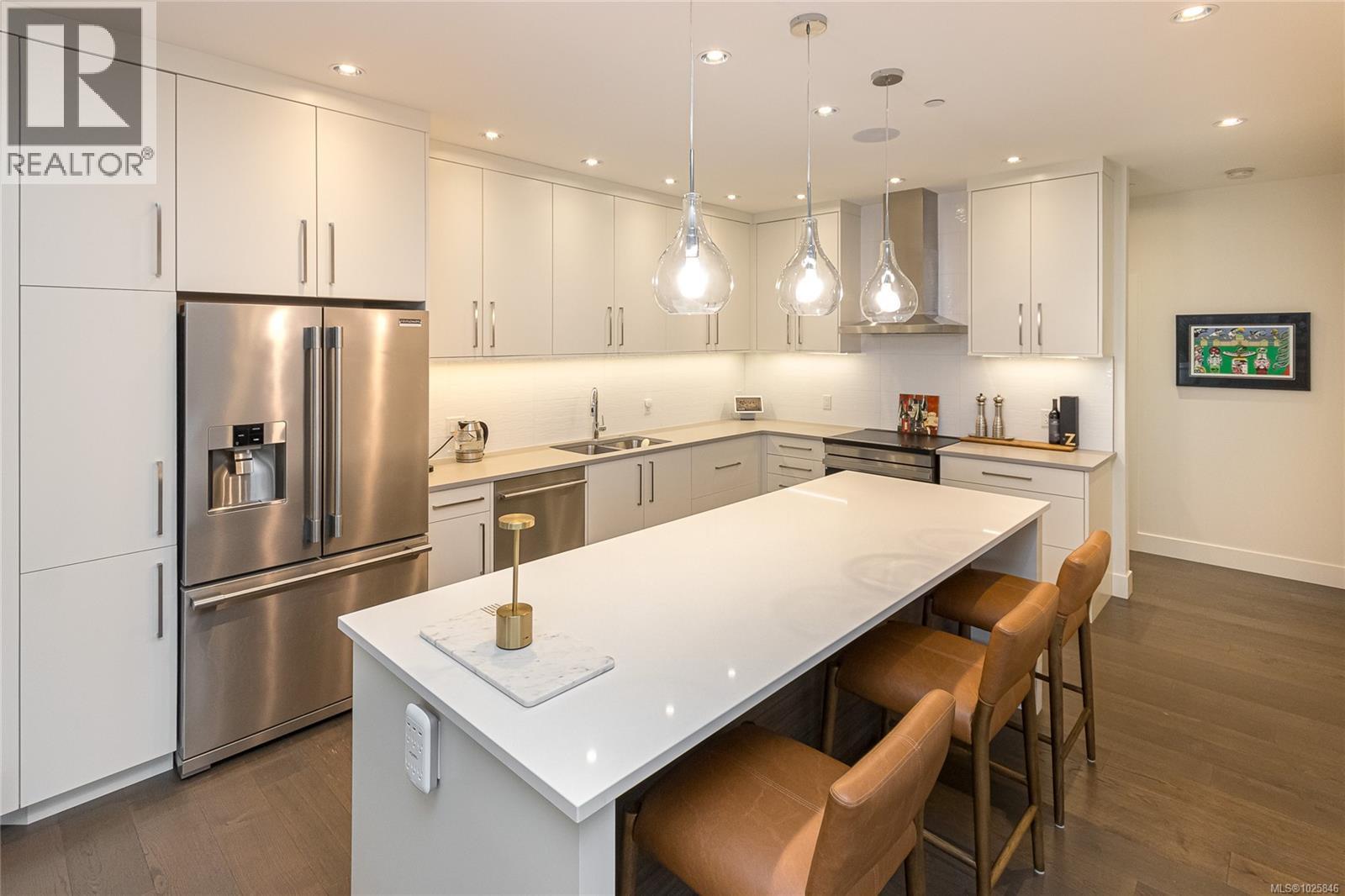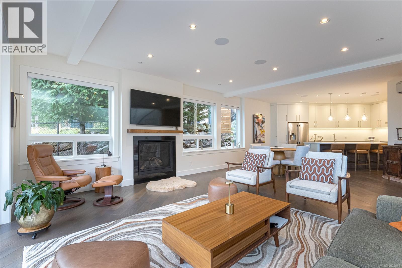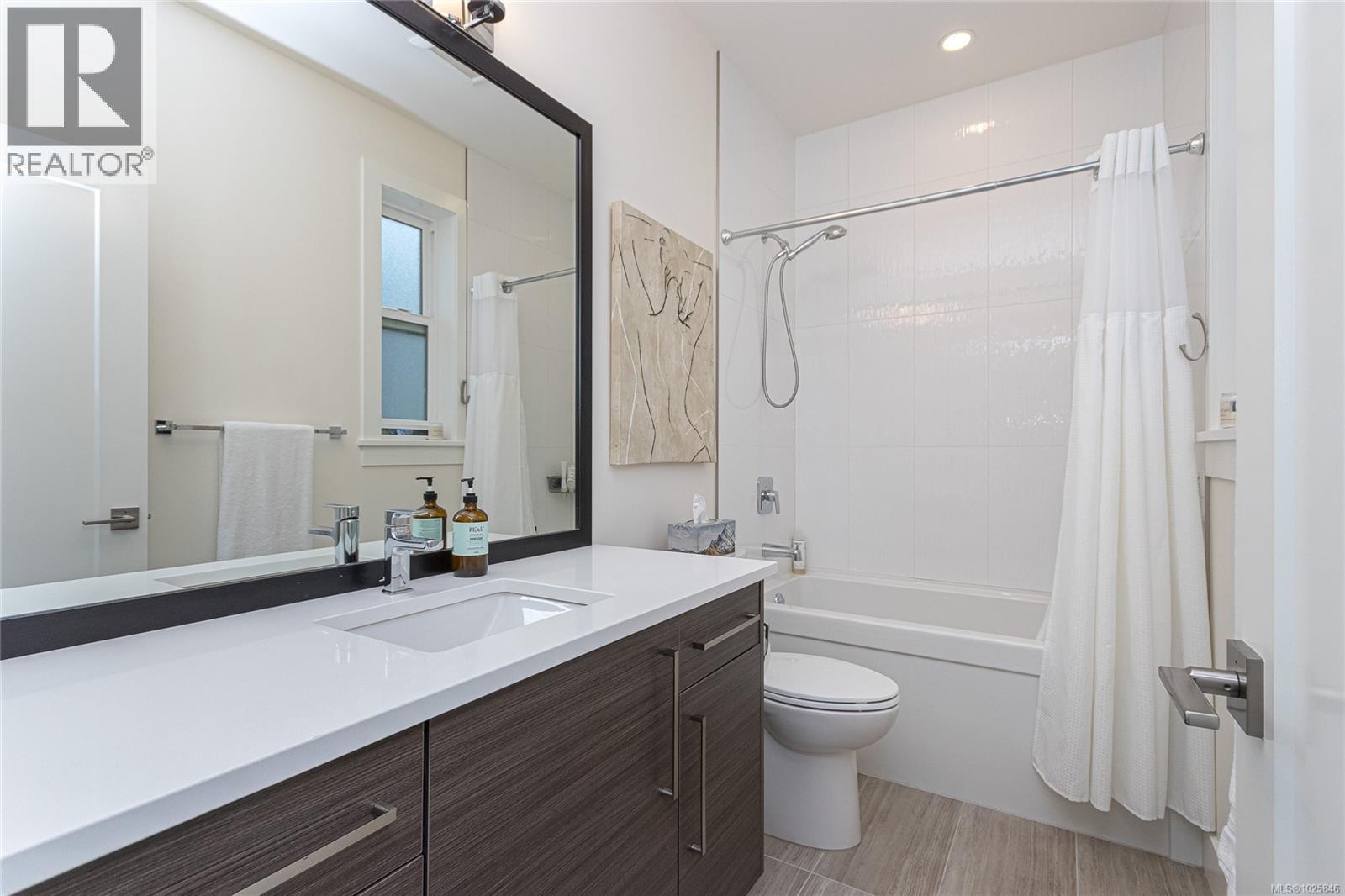 Executive Bear Mountain Resort living with this stunning 3-bedroom, 3-bathroom West Coast Contemporary home in the much sought-after Rivers Crossing community! Offering 2,097 sq ft, this residence features many upgrades and new appliances. Hardwood floors, quartz countertops, and a bright open-concept layout with oversized sliding doors that showcase beautiful forest views and create seamless indoor-outdoor living. The sleek kitchen boasts two-toned cabinetry, stainless steel appliances, and a large island with bar seating. Upstairs offers 3 bedrooms and 2 baths, including a spacious primary suite with walk-in closet, spa-inspired ensuite with standalone tub, and private balcony. Enjoy year-round comfort with a heat pump, plus a double garage with EV charger and wiring for a hot tub. Rare TWO separate, fully fenced yards on each level to enjoy the outdoors. Walk to Westin hotel, golf courses, restaurants, farmer's market, trails, and sports centre with outdoor pool. (30381886)