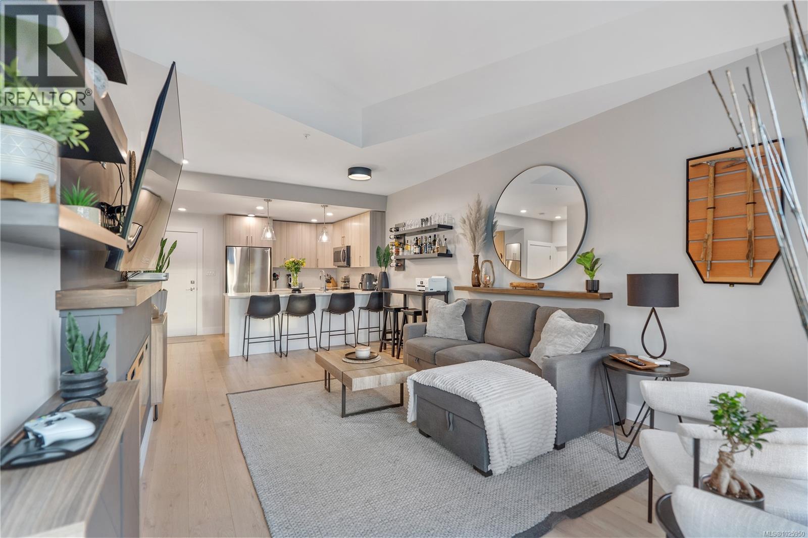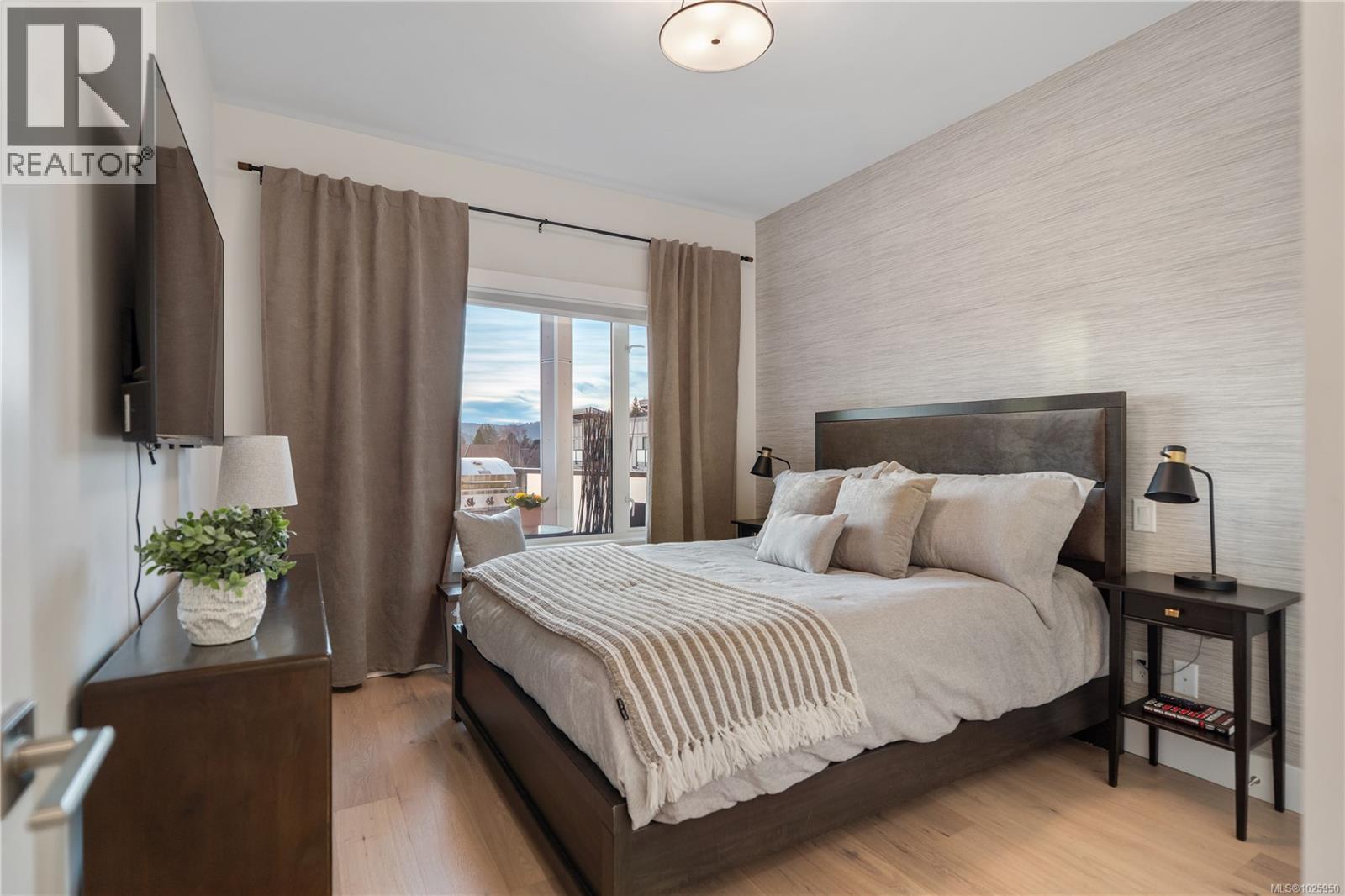 Top-floor living in the heart of Brentwood Bay. This spacious 1-bedroom, 1-bath suite features vaulted ceilings, hardwood floors, quartz countertops, in-suite laundry, and a large west-facing balcony to enjoy the evening sun. Custom designer touches throughout add a polished, elevated feel. The Wallace is a modern, energy-modelled building offering superior soundproofing, secure underground parking, a storage locker, and shared EV charging. Pets and rentals are welcome. Enjoy seaside trails, local dining, spa services, markets, and marinas just steps from your door. With the balance of the 2-5-10 warranty remaining, this is stylish, low-maintenance living in a walkable coastal community. One of the best units in the building! (30383380)