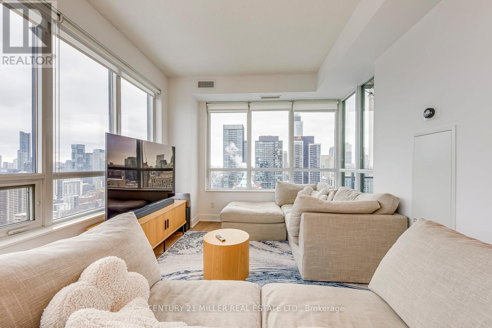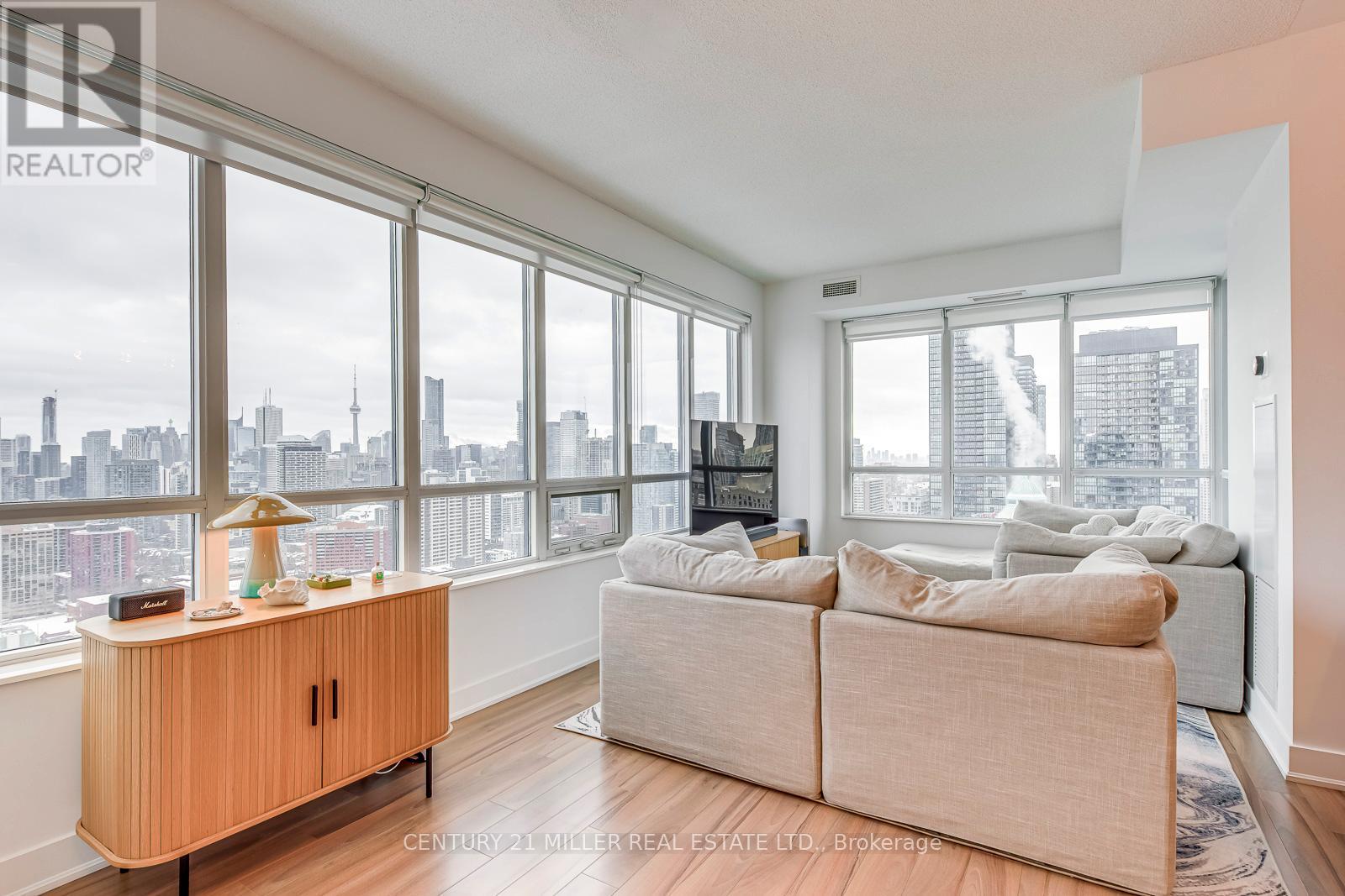 One-of-a-Kind Sub-Penthouse Corner Suite With Iconic CN Tower & Lake Views! Experience elevated downtown living in this rare south-facing sub-penthouse residence featuring breathtaking, unobstructed views of the CN Tower, city skyline, and Lake Ontario from every room. Soaring 10-foot ceilings and expansive wrap-around windows flood the space with natural light, creating a bright and sophisticated atmosphere high above the city. The thoughtfully designed 2-bedroom, 2-bathroom layout offers exceptional flow and functionality. The open-concept living and dining area seamlessly connects to a private balcony - perfect for morning coffee or evening sunsets. The gourmet kitchen features a large breakfast island, quartz countertops, and brand-new stainless steel appliances (recently upgraded by the current owners), combining modern style with everyday practicality. The spacious primary suite includes custom built-in cabinetry and a spa-inspired ensuite with a glass standing shower. Premium wood flooring runs throughout, enhancing the home's clean, contemporary aesthetic. Located in a LEED-certified energy-efficient building with 24/7 concierge service, excellent amenities, visitor parking, and a premium parking space included with EV charger. Steps to the subway, Yorkville shopping, restaurants, groceries, parks, Rosedale Ravine, and easy access to the DVP. A true sky-level retreat in one of downtown's most prestigious and connected locations. (42143200)