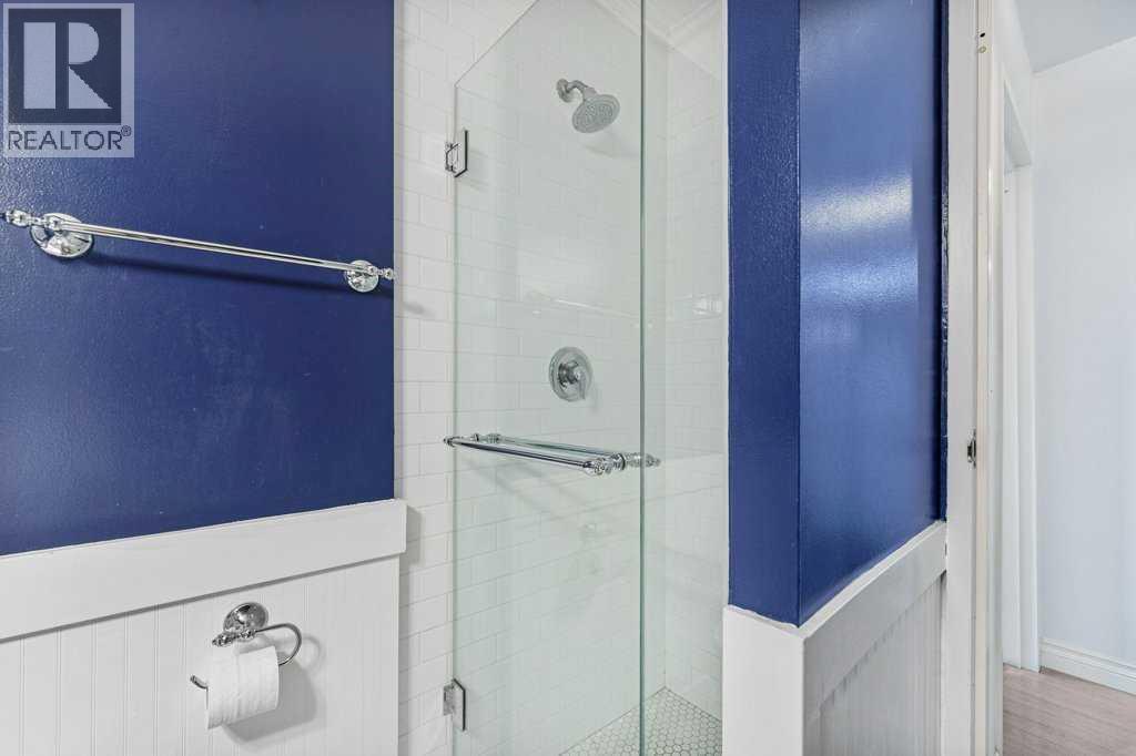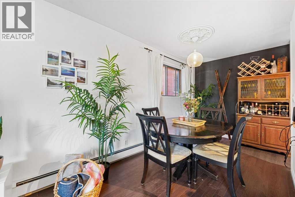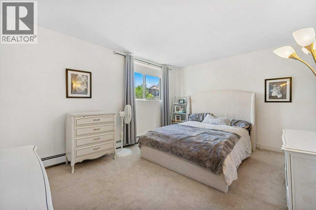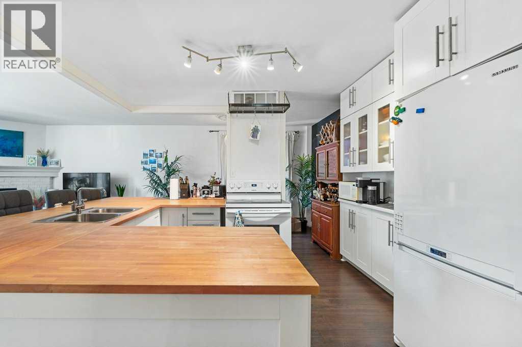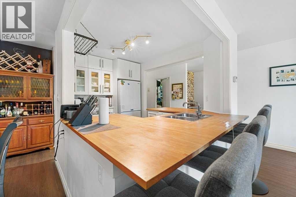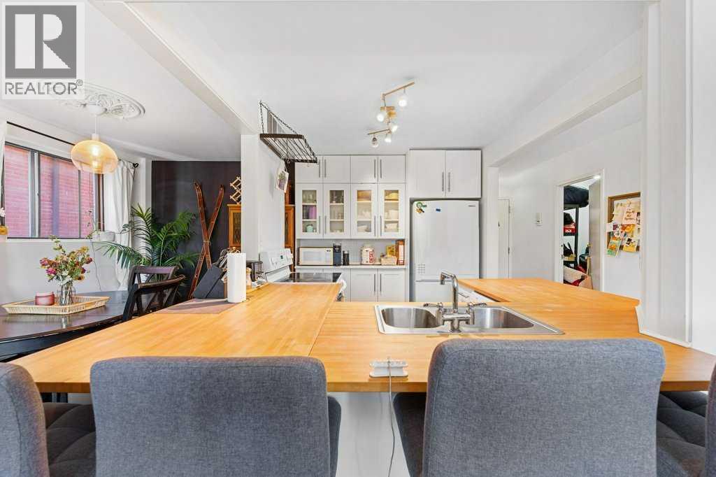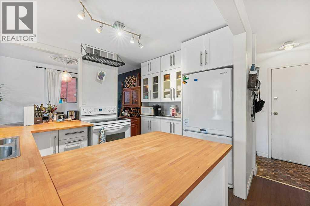Step into this spectacular and spacious 1,093 sqft, 2-bedroom, 2-bathroom modern condo and discover a haven of contemporary luxury. Updated and beautifully designed, and best of all it has low condo fees for the unit size! Uniquely surrounded by concrete slab construction, and no adjoining units, this condo ensures superior quietness and tranquility. The superb layout of this condo ensures maximum space and functionality. The U-shaped chef's kitchen, featuring stunning butcher block countertops, is absolutely wonderful. Adjacent to the kitchen is a dining area with custom lighting, ideal for entertaining guests.The living room exudes warmth and charm with its gleaming hardwood floors and a soothing wood-burning fireplace. The huge primary bedroom serves as a retreat, boasting a remodeled, luxurious 4pc ensuite complete with subway tile and a spacious walk-in closet.The second bedroom is generously sized, offering flexibility for guests, children, or a home office. The elegant 3pc main bathroom features a 10mm glass shower and mid-century tile and fixtures.For added convenience, the condo includes in-suite laundry and ample storage space, ensuring all your needs are met. The large sunny, south-facing balcony overlooks a quiet, tree-lined street, providing a serene outdoor space for relaxation and enjoyment. Located just steps away from shopping, parks, restaurants, and popular 4th Street and 17th Avenue SW, this condo offers the perfect blend of urban convenience and serene living! (31643411)