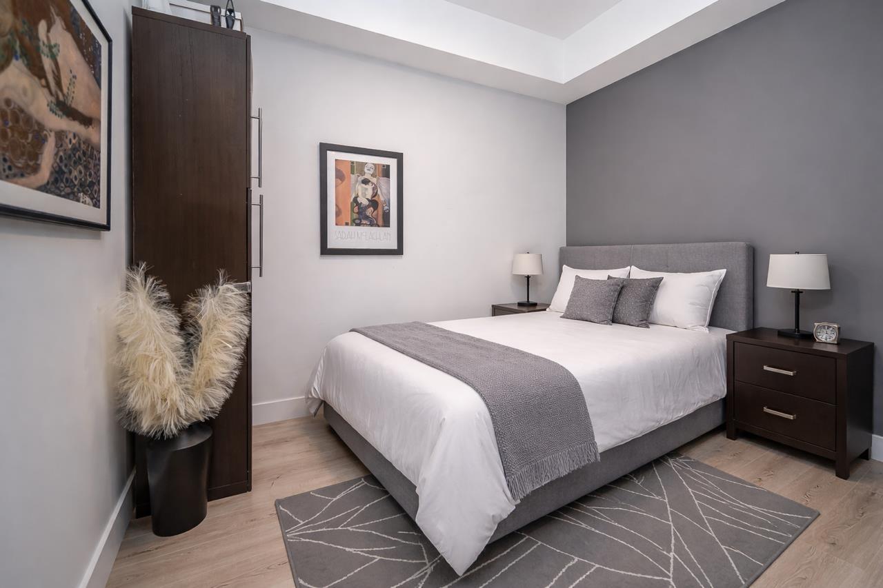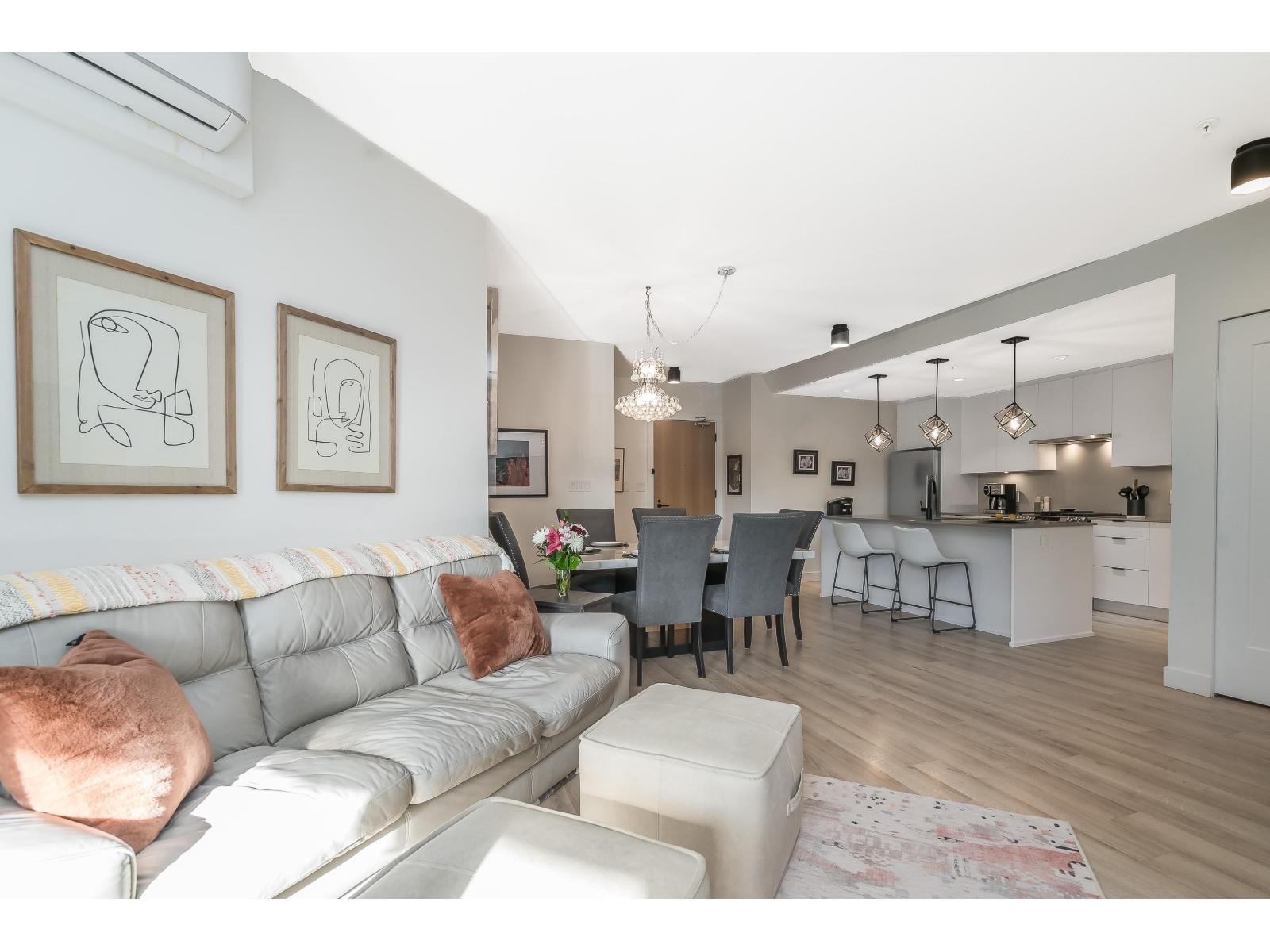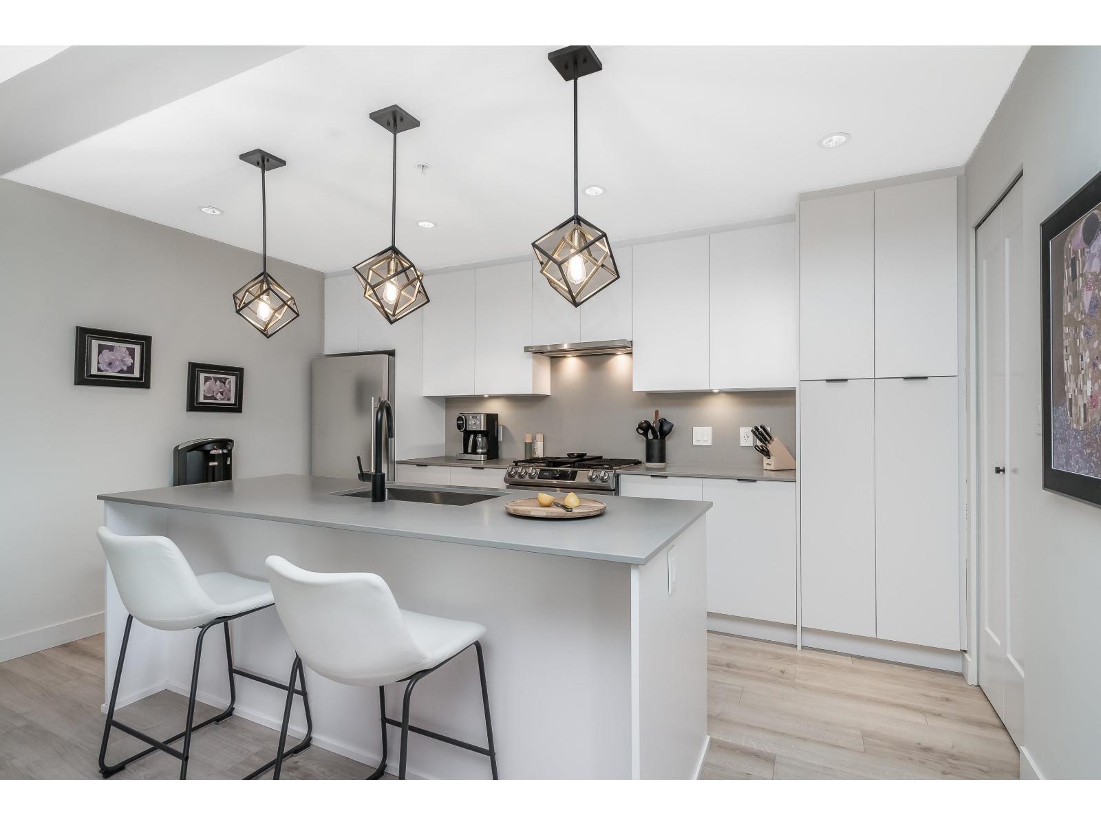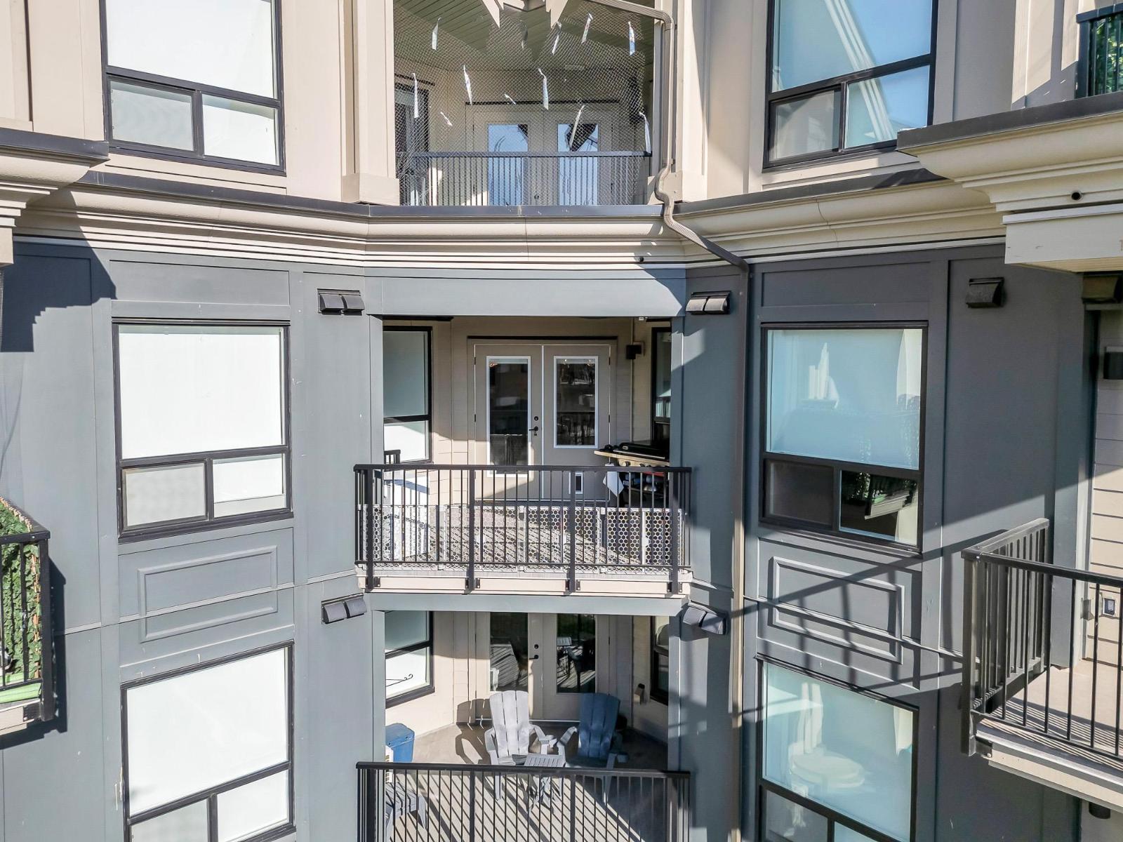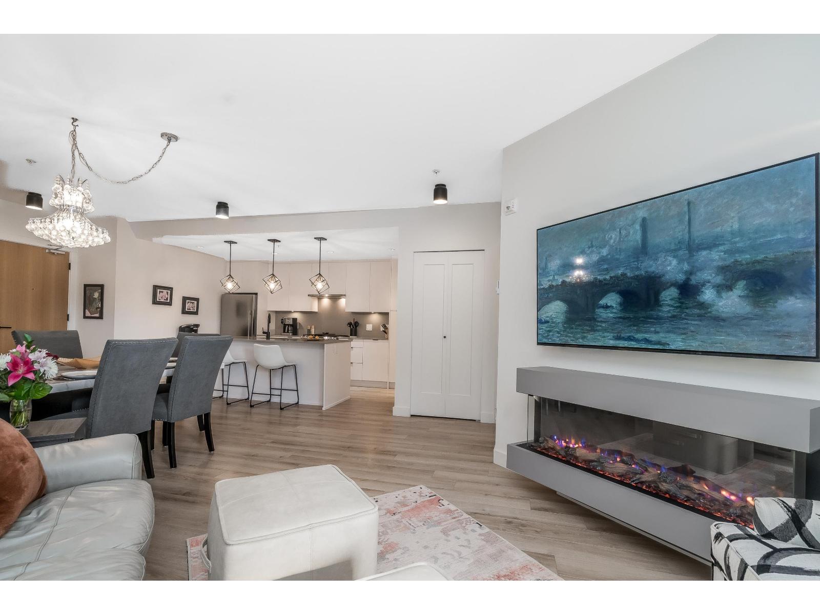 Upgraded corner unit featuring 2 large bedrooms + spacious den/3rd bedroom with beautiful southwest exposure and afternoon sun. Enjoy an extra-wide corner deck with gas BBQ hookup and open views. Quality updates include luxury vinyl plank flooring, French balcony doors with phantom screens, 3-sided fireplace, custom lighting, blinds, and walk-in closet organizer. Functional layout with gas range, walk-in pantry, full-size laundry, and deep soaker tub. Secure, well-run building with amenity room (Wi-Fi & workstations), medical clinic and pharmacy onsite. 1 parking stall, rentable storage, street parking, pets welcome. Steps to downtown dining, pickleball courts, and the summer farmers market. (32450058)