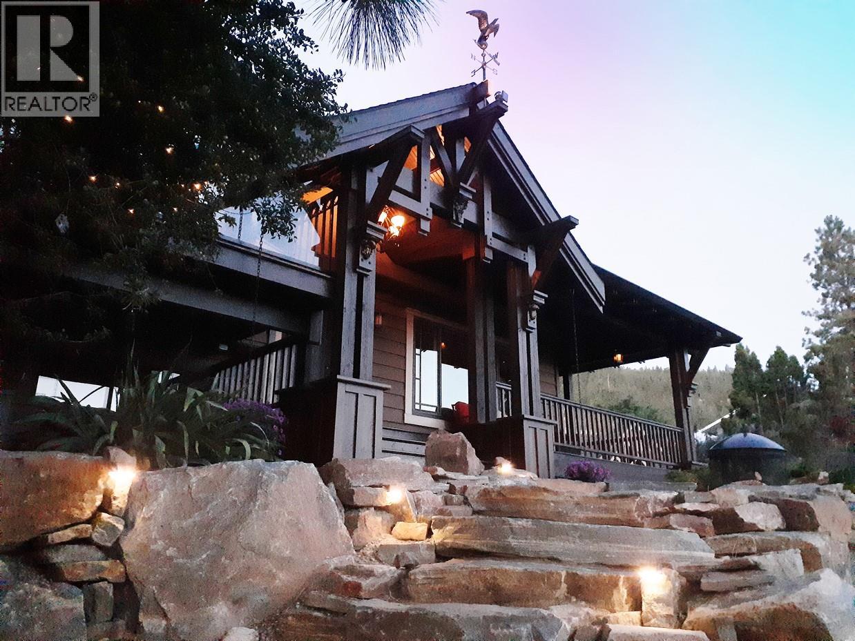 Welcome to this charming timber frame-style home in McKinley Landing, where rustic elegance meets relaxed Okanagan living. Thoughtfully maintained and filled with character, this 4-bedroom, 2-bathroom home offers stunning lake views, a flexible multi-level layout, and a location just a 5-minute stroll to a quiet, sun-drenched public beach with dock access. Inside, warm wood tones, laminate flooring, and high-end carpentry details create a welcoming ambiance. The bright kitchen features a breakfast bar island and built-in desk area, while the living and dining spaces open to a covered wraparound cedar deck—perfect for taking in panoramic views or hosting candlelit evenings under the stars. The upper level boasts a dreamy primary suite with walk-in closet, cozy nook, and 12’ sliding doors to a private lakeview deck. A secondary bedroom features a built-in kitchenette—ideal for guests or short-term stays. Downstairs, enjoy two guest bedrooms, a rec room, office with a view, and a fully fenced backyard complete with workshop, storage, and a delightful playhouse. Located on a quiet private road just 10–20 minutes from UBCO, YLW, KGH, and downtown. This is lakeside living with room to grow and space to unwind. Possibly potential to be a bed and breakfast. (39736438)