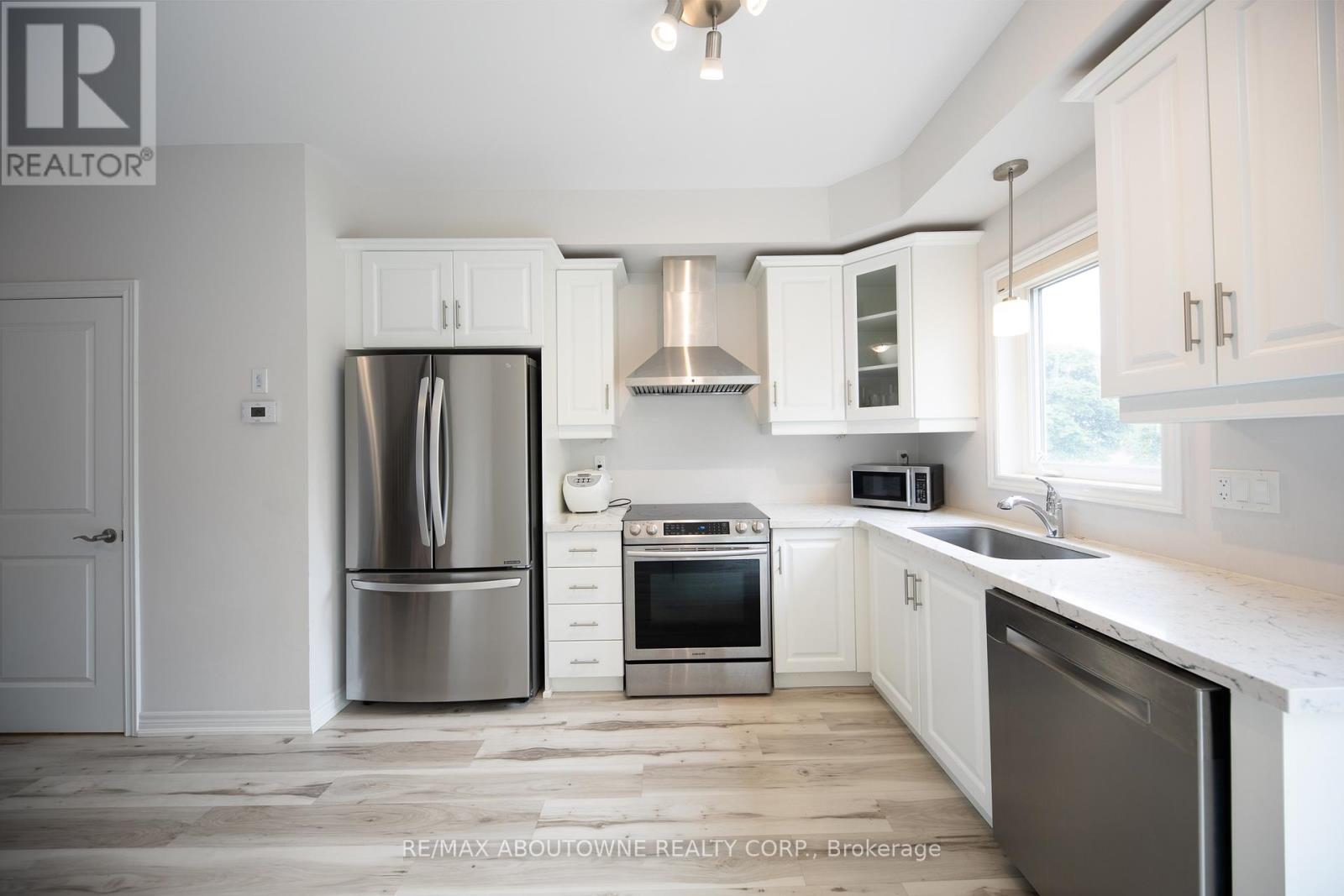 Modern & Refreshed Townhouse In Ancaster's Prestigious MeadowlandsRecently refreshed with new contemporary light fixtures throughout and professional paint touch-ups, this well-maintained townhouse offers a bright, clean, move-in ready living space.Backing onto mature trees with no direct neighbors in front or behind, the home provides privacy and a peaceful setting. The wide driveway, attached garage, and convenient visitor parking directly in front of the home add everyday practicality.The open-concept layout features an oversized living room with a large window, durable waterproof flooring complemented by oak stairs, and a bright white kitchen with quartz counters and extended-height cabinetry. The dining area walks out to a private balcony overlooking mature trees, creating a comfortable indoor-outdoor flow.All bathrooms include quartz counters and upgraded fixtures. The primary bedroom offers a walk-in closet and an upgraded ensuite shower, along with newly installed wall-mounted bedside lighting for added comfort and convenience.The fully finished walk-out basement provides additional flexible living space with access to the yard and garage, ideal for a home office, recreation area, or extended family use.Ideally located just three minutes to Hwy 403 and the Linc, within walking distance to Tiffany Hill Elementary School and park, and only a five-minute drive to Costco, Cineplex, Sobeys, and major amenities.A clean, thoughtfully updated home in one of Ancaster's most desirable communities. (42150749)