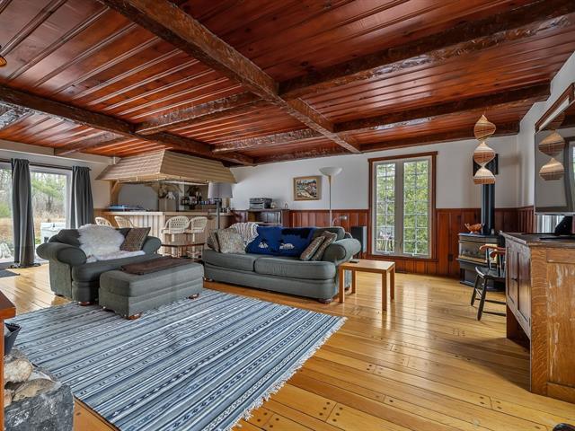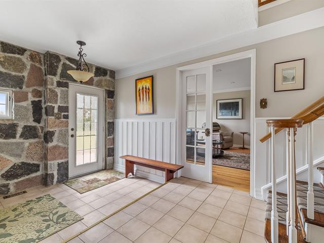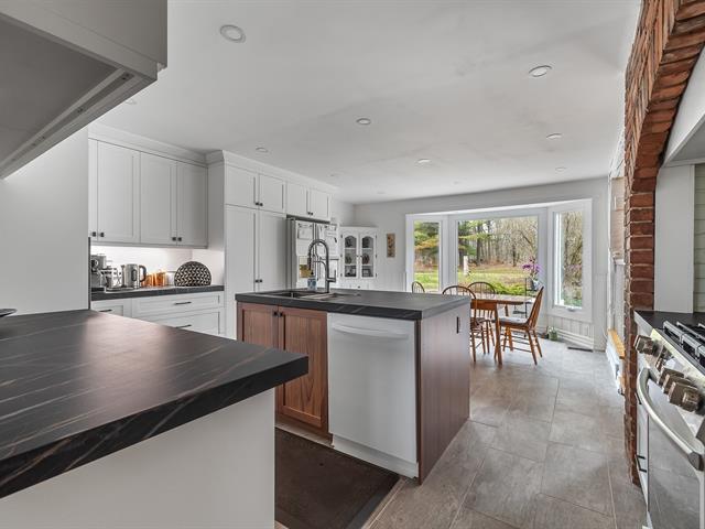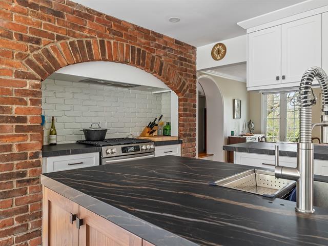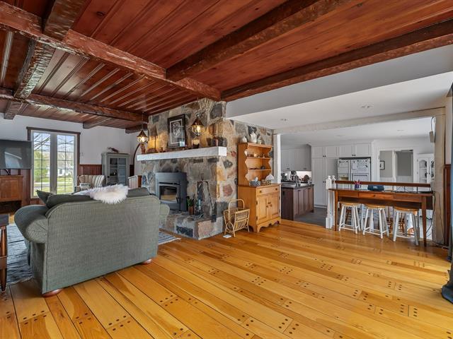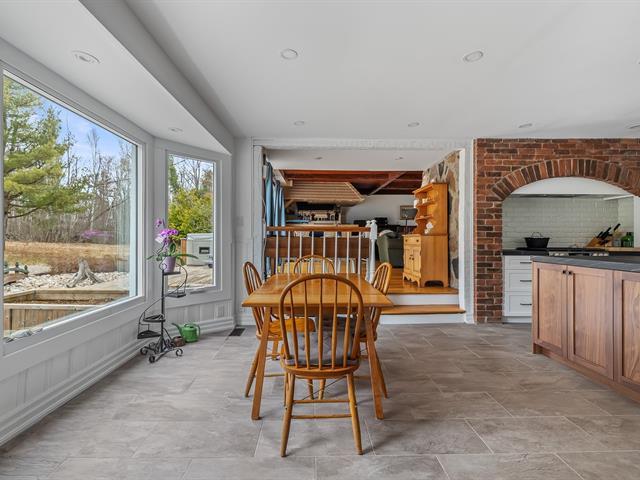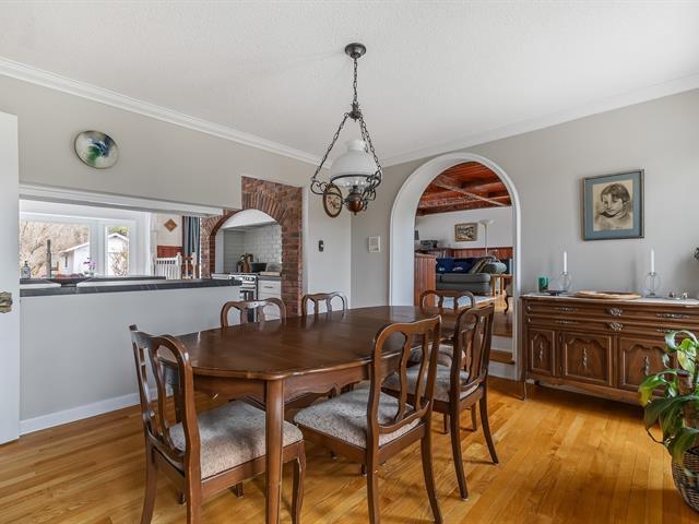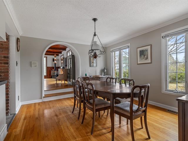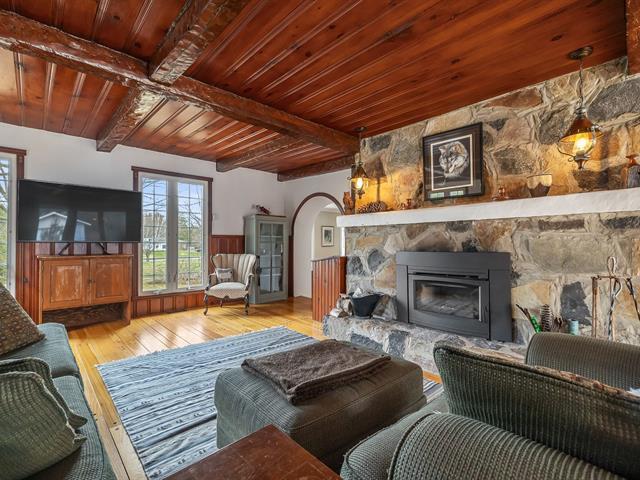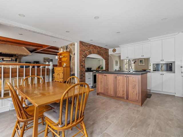 Located in the sought-after Champlain neighborhood, this exceptional property offers a unique living environment on a private 1.42-acre lot, with no rear neighbors and surrounded by mature trees. The house, full of character, has five bedrooms and features hardwood and ceramic floors throughout the main floor. The spacious common areas, bathed in natural light, include a living room with an elegant bar area and magnificent original wooden beams, as well as a cozy kitchen with a breakfast nook and wooden cabinetry, porcelain counter. (56763070)