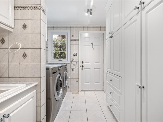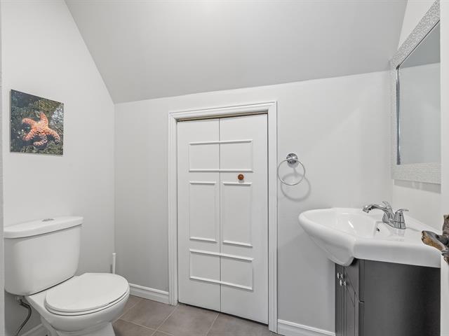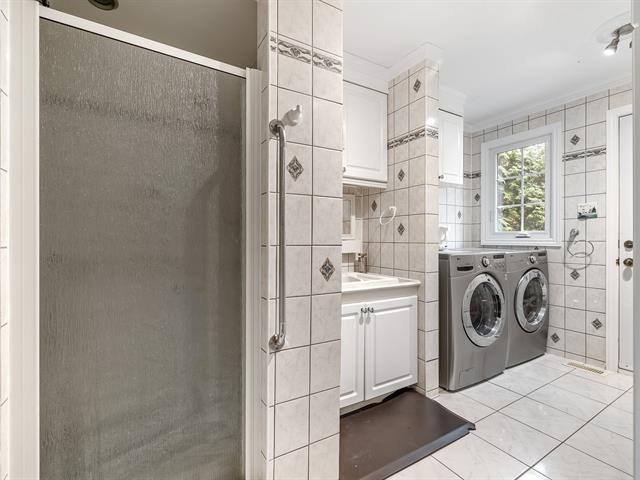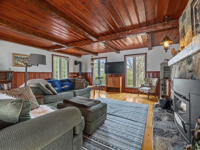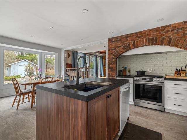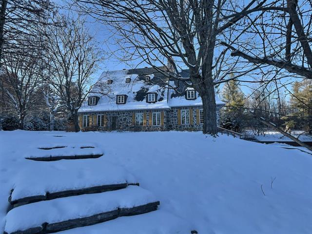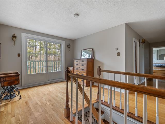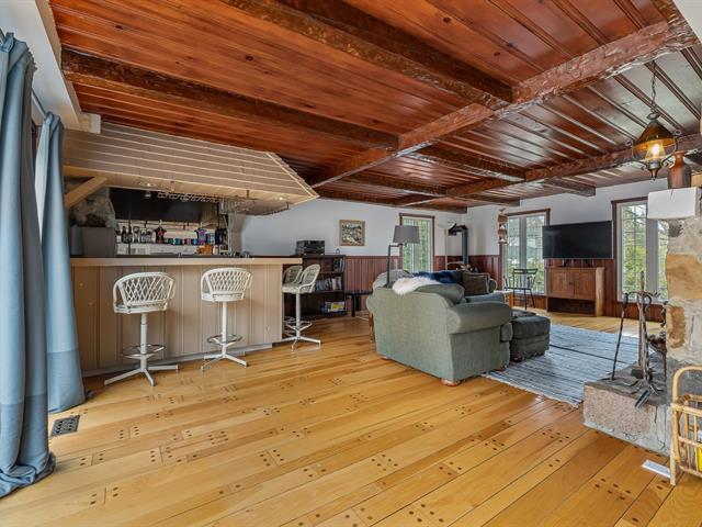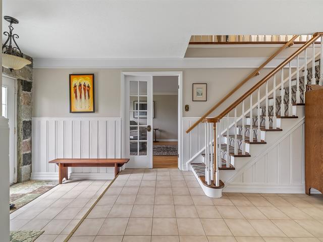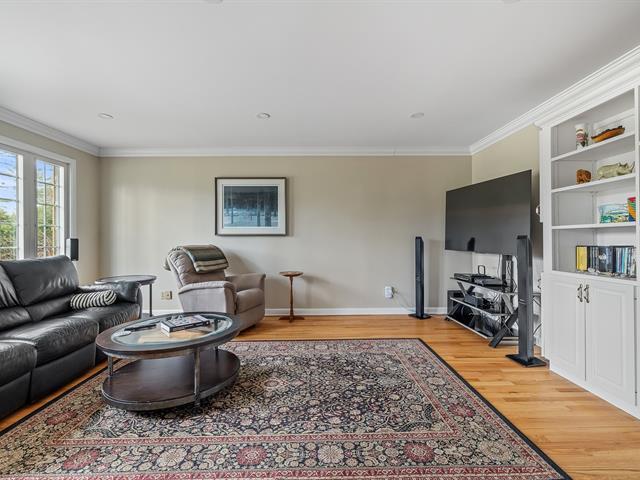 Located in the sought-after Champlain neighborhood, this exceptional property offers a unique living environment on a private 1.42-acre lot, with no rear neighbors and surrounded by mature trees. The house, full of character, has five bedrooms and features hardwood and ceramic floors throughout the main floor. The spacious common areas, bathed in natural light, include a living room with an elegant bar area and magnificent original wooden beams, as well as a cozy kitchen with a breakfast nook and wooden cabinetry, porcelain counter. (56763070)