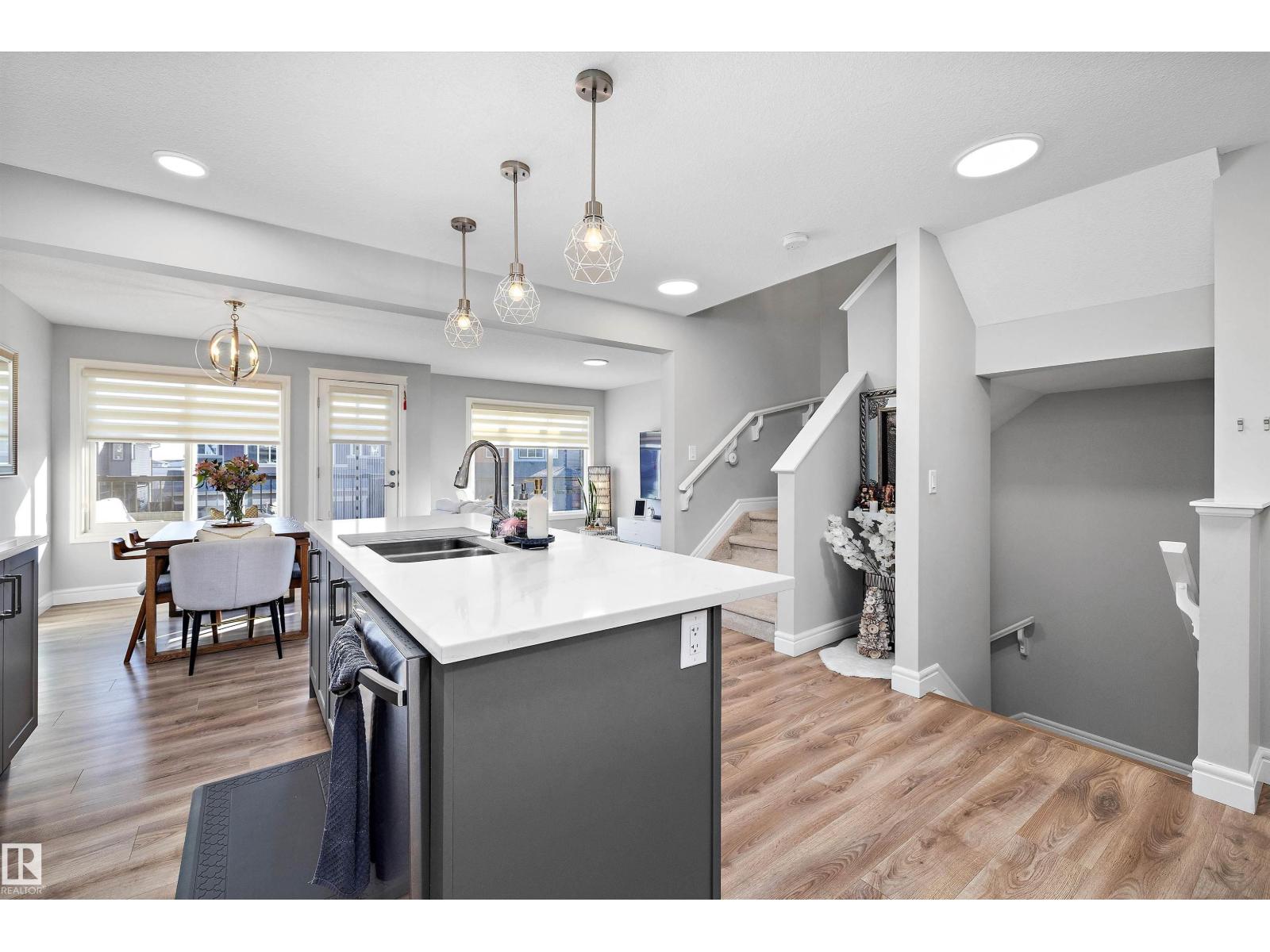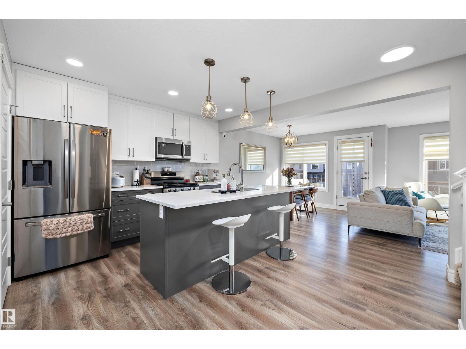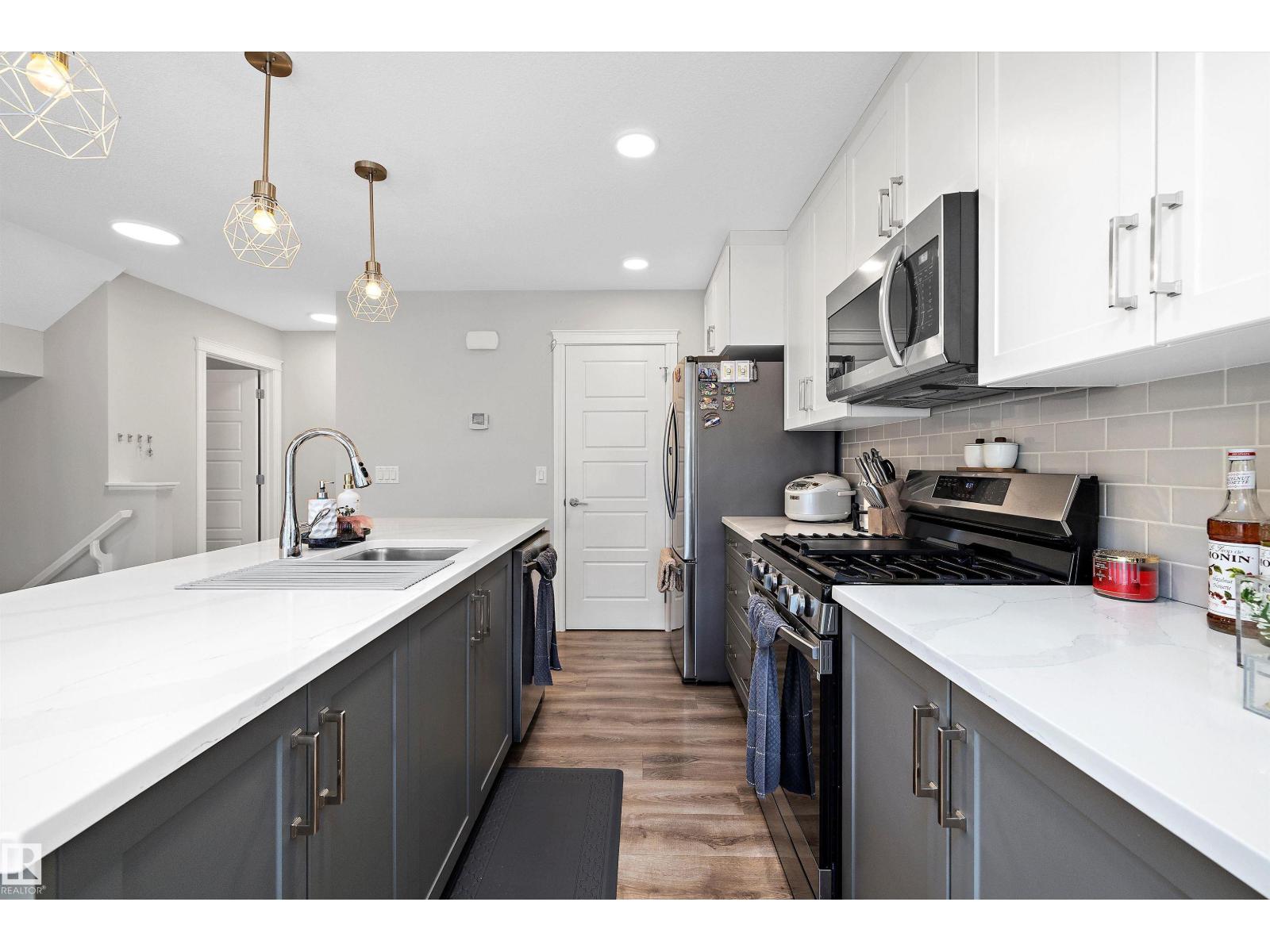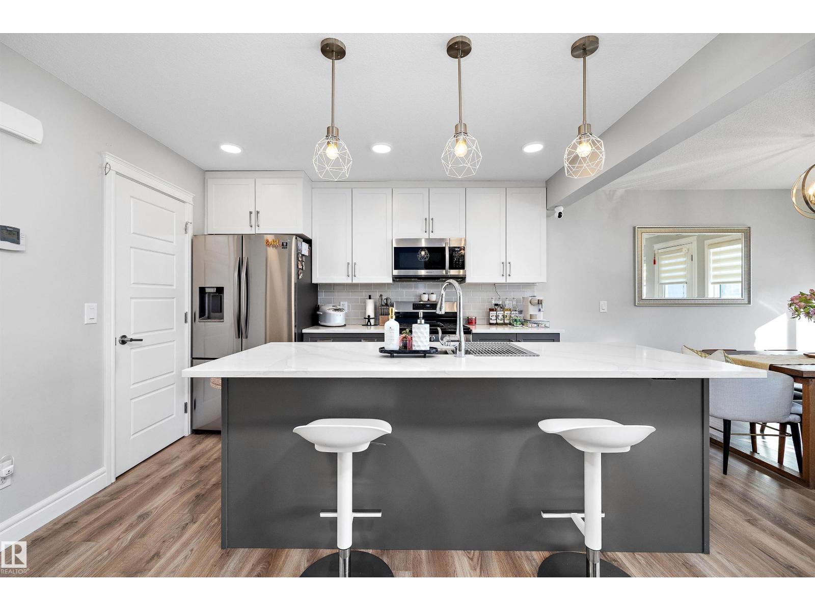 No condo fee TOWNHOME in the sought-after neighbourhood of Keswick! This nearly new 3-bedroom + den townhouse delivers a bright, practical layout in a prime southwest Edmonton location. With an east-facing front, the home welcomes beautiful morning light through large windows and is finished with brand-new zebra blinds throughout. The open-concept main level is designed for both everyday comfort and entertaining, featuring a spacious kitchen with quartz countertops, modern cabinetry, a walk-in pantry, convenient laundry area, and a powder room. On the entry level, you’ll find an oversized single attached garage, ample storage, and a versatile den — perfect for a home office, gym, or creative space. Upstairs includes two well-sized secondary bedrooms, a full 4-piece bathroom, and a bright primary retreat complete with a walk-in closet and private ensuite. Ideally situated just minutes from Currents of Windermere and close to walking trails, parks, schools, golf and major roads to get around the city. (33838111)