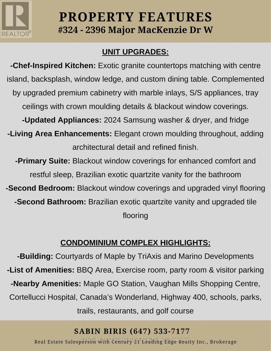 Discover refined living in this 882 sq ft European-inspired boutique corner condo, where 9 ft ceilings and warm west sunlight create a bright, inviting ambiance. The beautifully upgraded kitchen features a tray ceiling, crown moulding, premium cabinetry with marble inlays, exotic granite for the centre island, countertops, backsplash and window ledge with a matching dining table, and stainless steel appliances which is perfect for effortless entertaining. The open-concept living and dining area, enhanced with elegant crown moulding, provides a spacious and airy canvas for gatherings or quiet evenings with a great size balcony. The primary bedroom offers a serene retreat with a walk-in closet and 3-piece ensuite, while the second bedroom is ideal for children, guests, a home office, or hobbies. The additional 4-piece bathroom adds everyday convenience. Both bathrooms have upgraded Brazilian Exotic Quartzite for vanities. Rarely offered, this unit includes 2 underground parking spaces and a locker. Enjoy resort-style amenities including a landscaped courtyard with BBQ, fitness room, party room, and visitor parking, and not to forget the main floor stores! (Dental Office, Healthcare, Spa & Skin Care, Jewelry). Ideally situated just steps from Maple GO Station, Vaughan Mills, Cortellucci Hospital, Canada's Wonderland, Highway 400, parks, trails, restaurants, and a golf course. This condo truly has it all. (42158993)