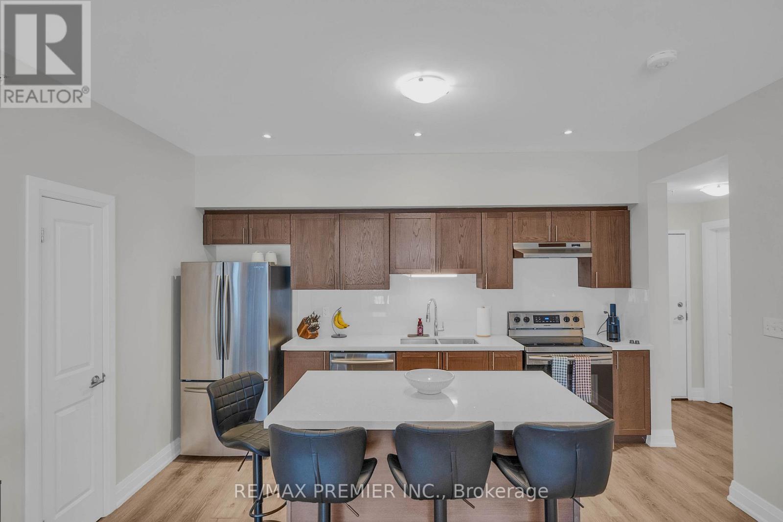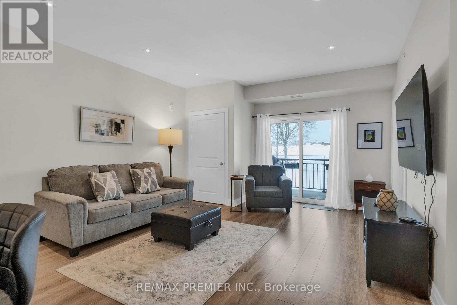 Welcome to this recently upgraded and well maintained 3 bedroom end unit featuring a 1240 sq. ft layout with high ceilings and 2 parking spaces. This corner unit is located on the main floor and offers numerous extras including an open kitchen with centre island, quartz counters, full appliances, upgraded faucets, back splash, upgraded cabinet handles and includes a pantry in the kitchen. The living area is huge and features a walkout to the balcony. The unit has upgraded faucets, back splash, zebra blinds. The Primary bedroom is private, spacious and includes an ensuite with glass doors and huge walk in closet with custom closets from floor to ceiling, and zebra blinds with remote. The second bedroom is large and features a double door closet. The third room can be used as a bedroom or den with a large window. The unit includes two bathrooms, two parking spaces, private locker, in-suite laundry, carpet free, with plenty of pot lights. The unit is centrally located to all amenities and only minutes to public transit, schools, shopping, (RVH) Hospital, Georgian College, Little Lake and minutes to Hwy 400. (42160954)