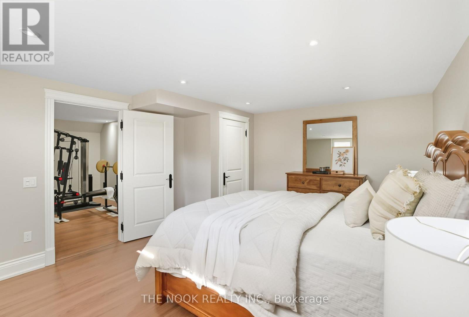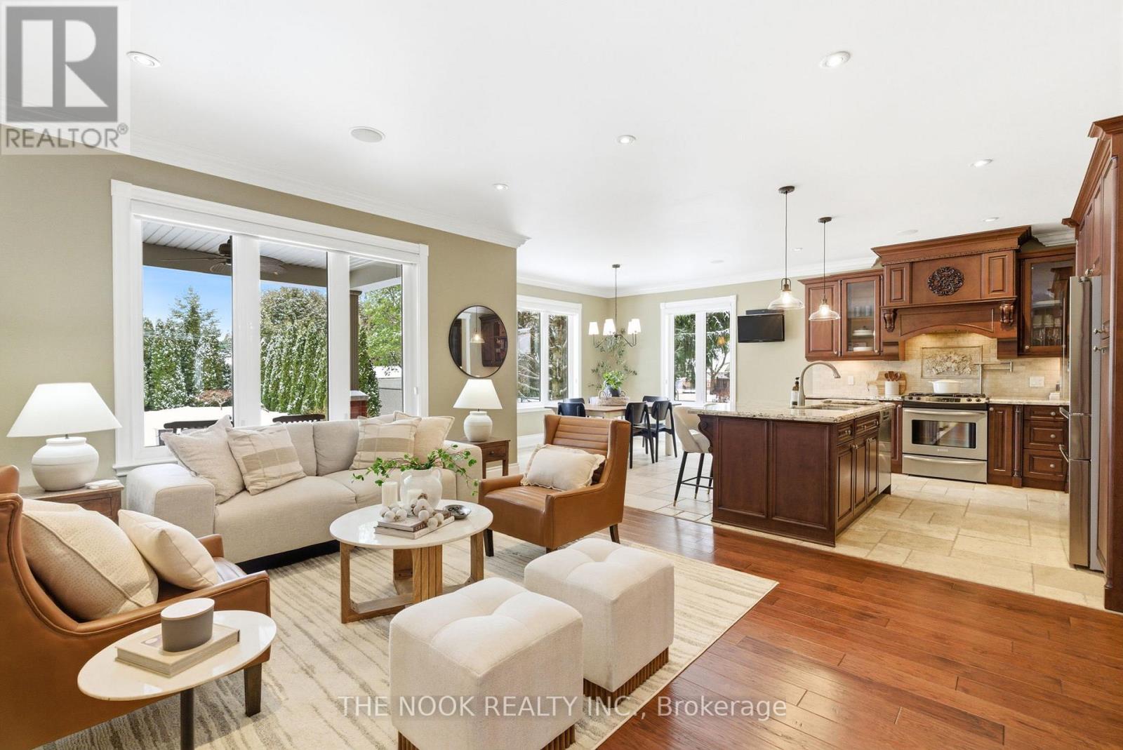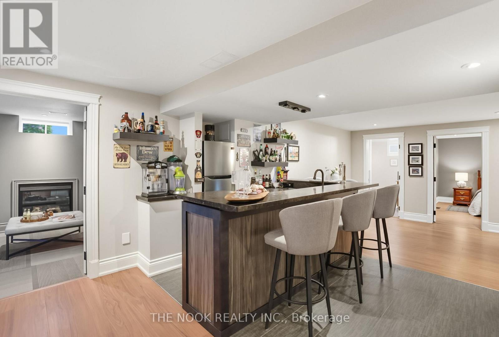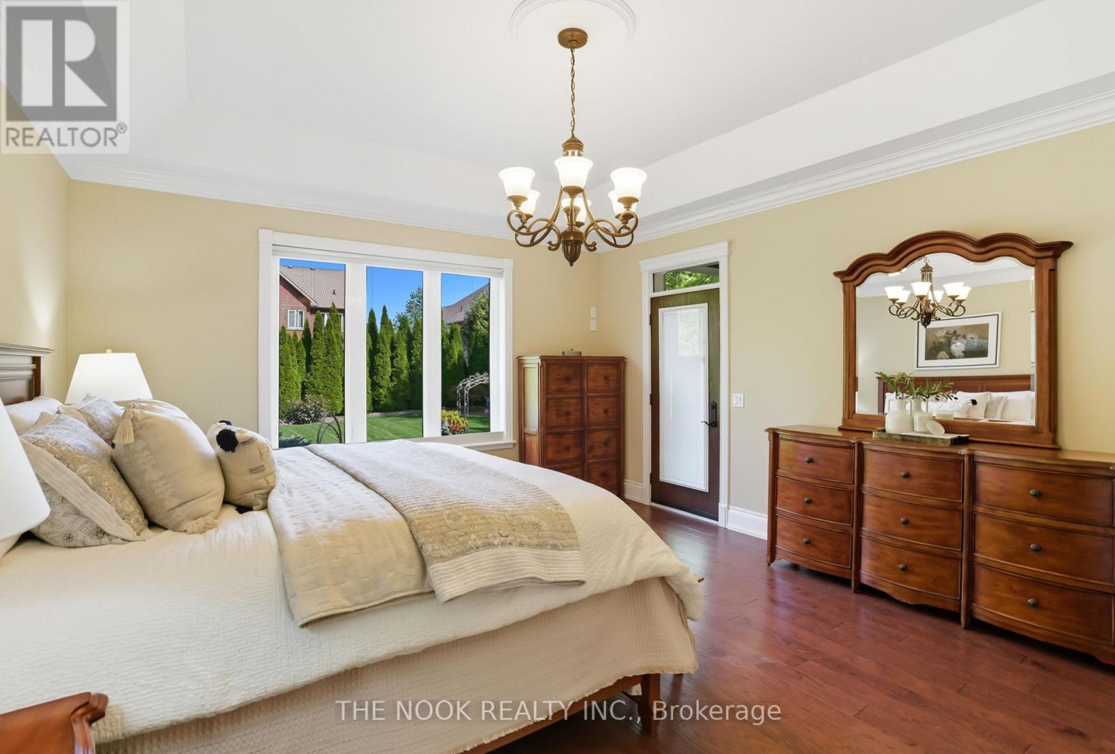 Custom-built Corvinelli bungalow featuring over 4400+ sqft of finished living space blending comfort, thoughtful design and unmatched quality.Nestled on a generous lot with mature trees this home offers a private retreat with modern luxuries. Exquisite craftsmanship is evident with high-quality upgraded casings, headers, 96" high by 13/4" thick solid doors on main floor and 80" high by 13/4" thick solid doors in basement & taller baseboards throughout.Crown moulding, 9' smooth ceilings, 5" vintage hickory hardwood enhances the warmth and sophistication of the main floor. Open concept living room with custom built-in flows into the family size eat-in kitchen with maple cabinetry, granite counters and honed travertine flooring flowing seamlessly into the butlers pantry with bar fridge, freezer and prep sink offering added convenience and style. Main floor laundry with granite counters, wall-to-wall uppers, under-mount sink and convenient garage access. Primary is a true retreat with a sophisticated tray ceiling, walk-out to covered patio, 5-piece ensuite with heated floors, deep soaker tub, glass shower w/hand held, 4 jets & rain shower, double vanity and spacious walk-in offering ample storage and a touch of luxury. Oak staircase with upgraded railing and wrought iron pickets lead to the expansive lower level with premium 7" Torlys cork flooring, spacious recreation room anchored by a dramatic floor-to-ceiling stone gas fireplace and wet bar featuring leathered granite, fridge and dishwasher. A dedicated gym area provides space for wellness and theatre room is complete with a gas fireplace offering a truly immersive cinematic experience. Lower level also includes two generously sized bedrooms, luxurious 4-piece bath with heated floors, cold cellar and ample storage. Second staircase provides convenient access to the exterior and oversized garage. From high-end finishes to its functional layout and peaceful setting this custom built home is a true oasis and rare (42165115)
