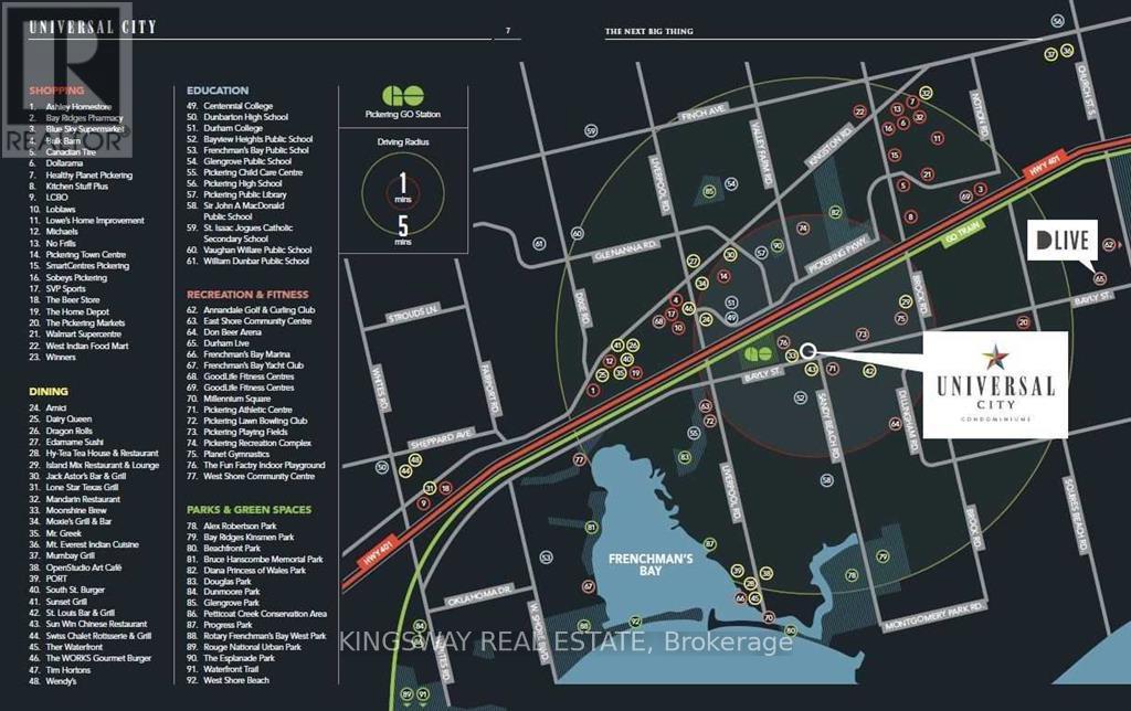 Welcome to Universal City Condos! This stunning and spacious 1+1 bedroom suite features a large primary bedroom and an oversized den that can easily function as a second bedroom, office, or flex space. Enjoy a bright and airy open-concept layout with a full-length balcony perfect for morning coffee or evening relaxation. This unit boasts modern finishes, 9 ft ceilings, stainless steel appliances and quartz countertops. The building offers top-tier amenities including a 24-hour concierge, rooftop terrace with BBQs, outdoor pool, party room, fitness and yoga studios, and more. Unbeatable location-just steps to the GO Station, Pickering Town Centre, schools, and parks. A perfect place to call home or an exceptional opportunity for professionals and small families alike! (42166658)
